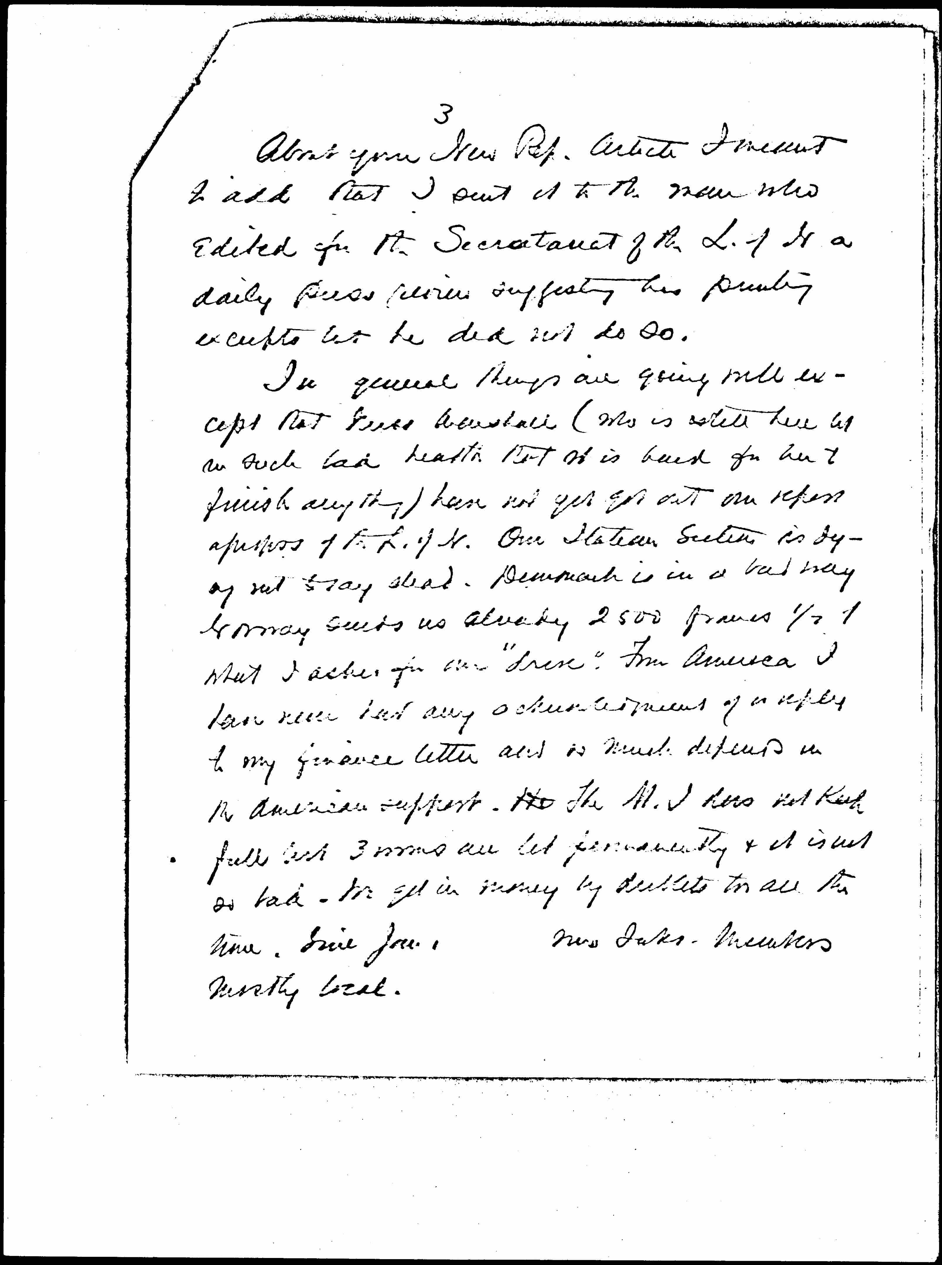 In general things are going well except that Miss Marshall (who is still here but in such bad health that it is hard for her to finish anything) have not yet got out our report apropos of the L. of N. Our Italian Section is dying not to say dead. Denmark is in a bad way. Norway sends us already 2500 francs ½ of what I asked for our "drive." From America I have never had any acknowledgment of a reply to my finance letter and so much depends on the American support. The M. I. has not kept full but 3 rooms are let permanently & it is not so bad. We get in money by [driblets] too all the time. Since Jan 1 [blank space] new Intl members mostly local. [page 4]