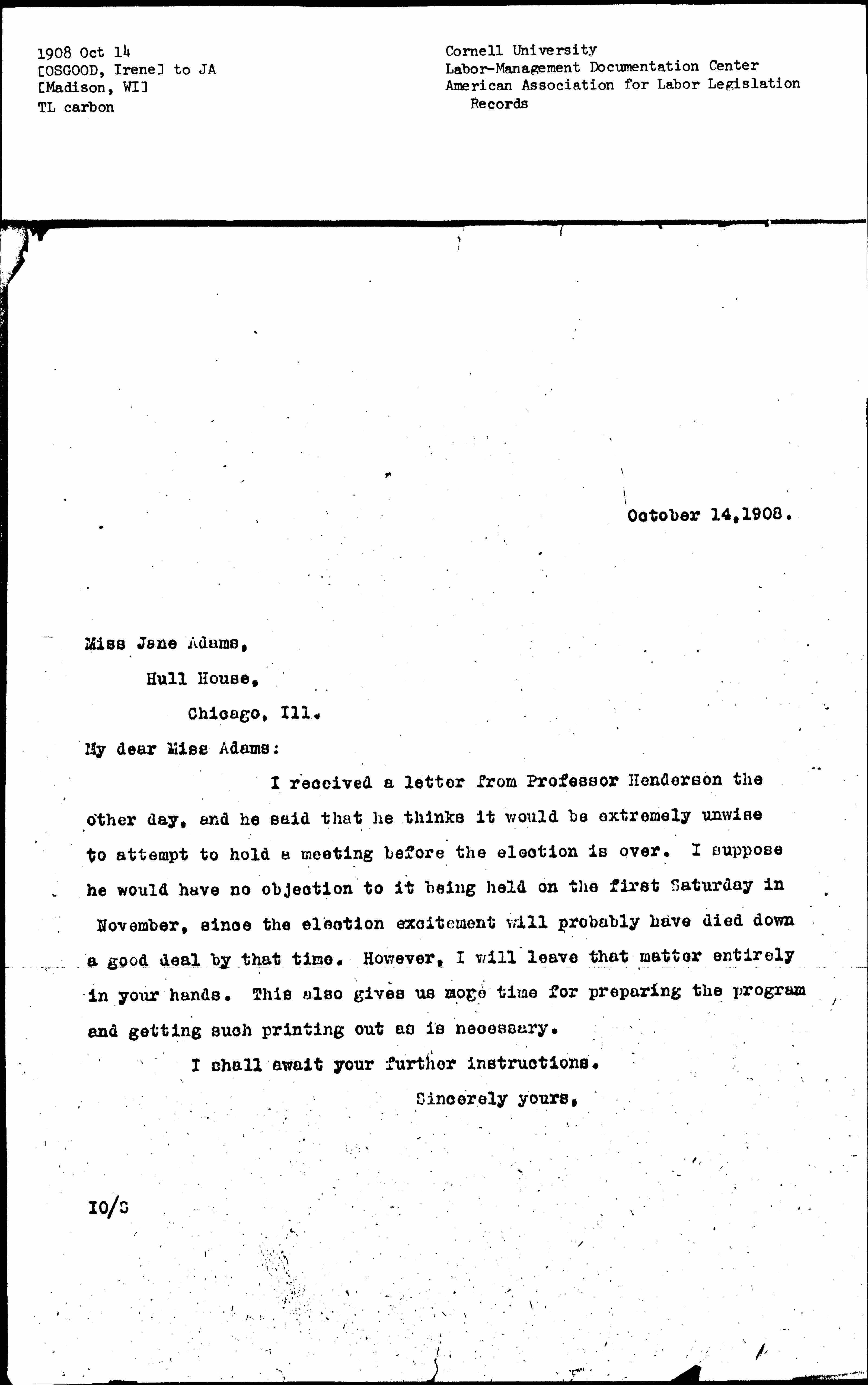I received a letter from Professor Henderson the other day, and he said that he thinks it would be extremely unwise to attempt to hold a meeting before the election is over. I suppose he would have no objection to it being held the first Saturday in November, since the election excitement will probably have died down a good deal by that time. However, I will leave that matter entirely in your hands. This also gives us more time for preparing the program and getting such printing out as is necessary.