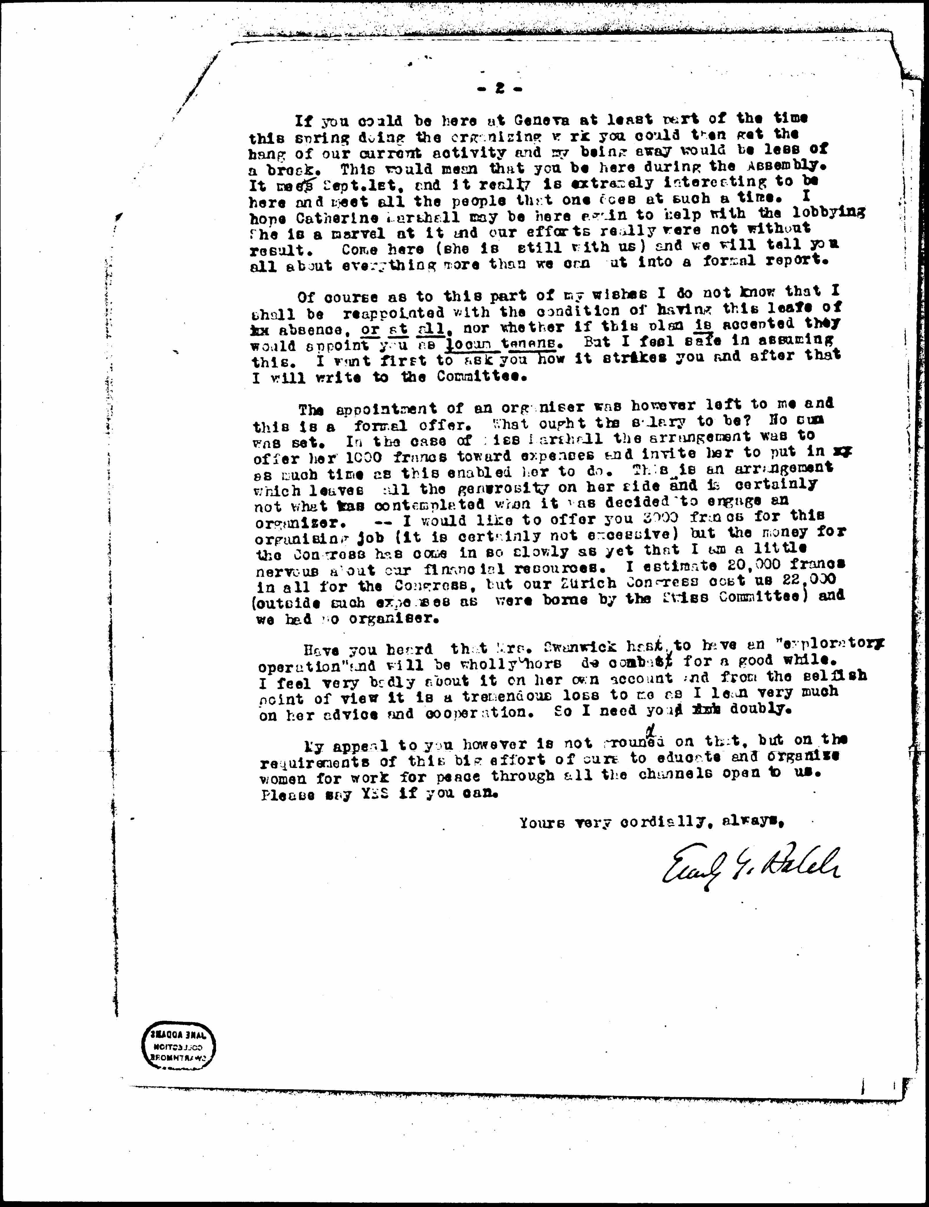 The appointment of an [organizer] was however left to me and this is a formal offer. What ought the salary to be? No sum was set. In the case of Miss Marshall the arrangement was to offer her 1000 francs toward expenses and invite her to put in [illegible] as much time as this enabled her to do. This is an arrangement which leaves all the generosity on her side and is certainly not what was contemplated when it was decided to engage an organizer. -- I would like to offer you 3000 francs for this [organizing] job (it is certainly not excessive) but the money for the Congress has come in so slowly as yet that I am a little nervous about our financial resources. I estimate 20,000 francs in all for the Congress, but our Zürich Congress cost us 22,000 (outside such expenses as were borne by the Swiss Committee) and we had no [organizer].