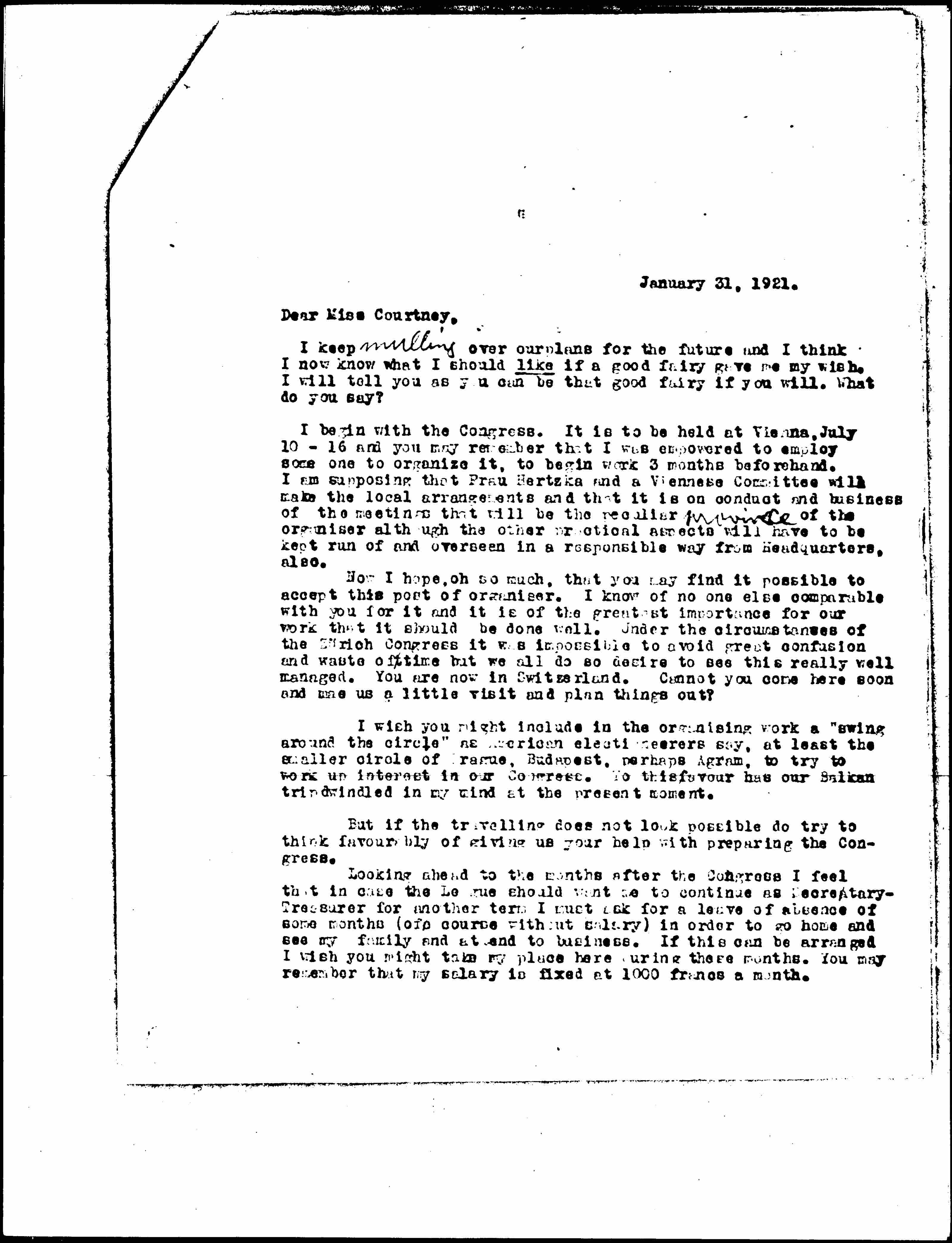 I begin with the Congress. It is to be held at Vienna, July 10-16 and you may remember that I was empowered to employ some one to organize it, to begin work 3 months beforehand. I am supposing that [Frau] Hertzka and a Viennese Committee will make the local arrangements and that it is on conduct and business of the meetings that will be the peculiar ↑province↓ of the [organizer] although the other practical aspects will have to be kept run of and overseen in a responsible way from headquarters, also.