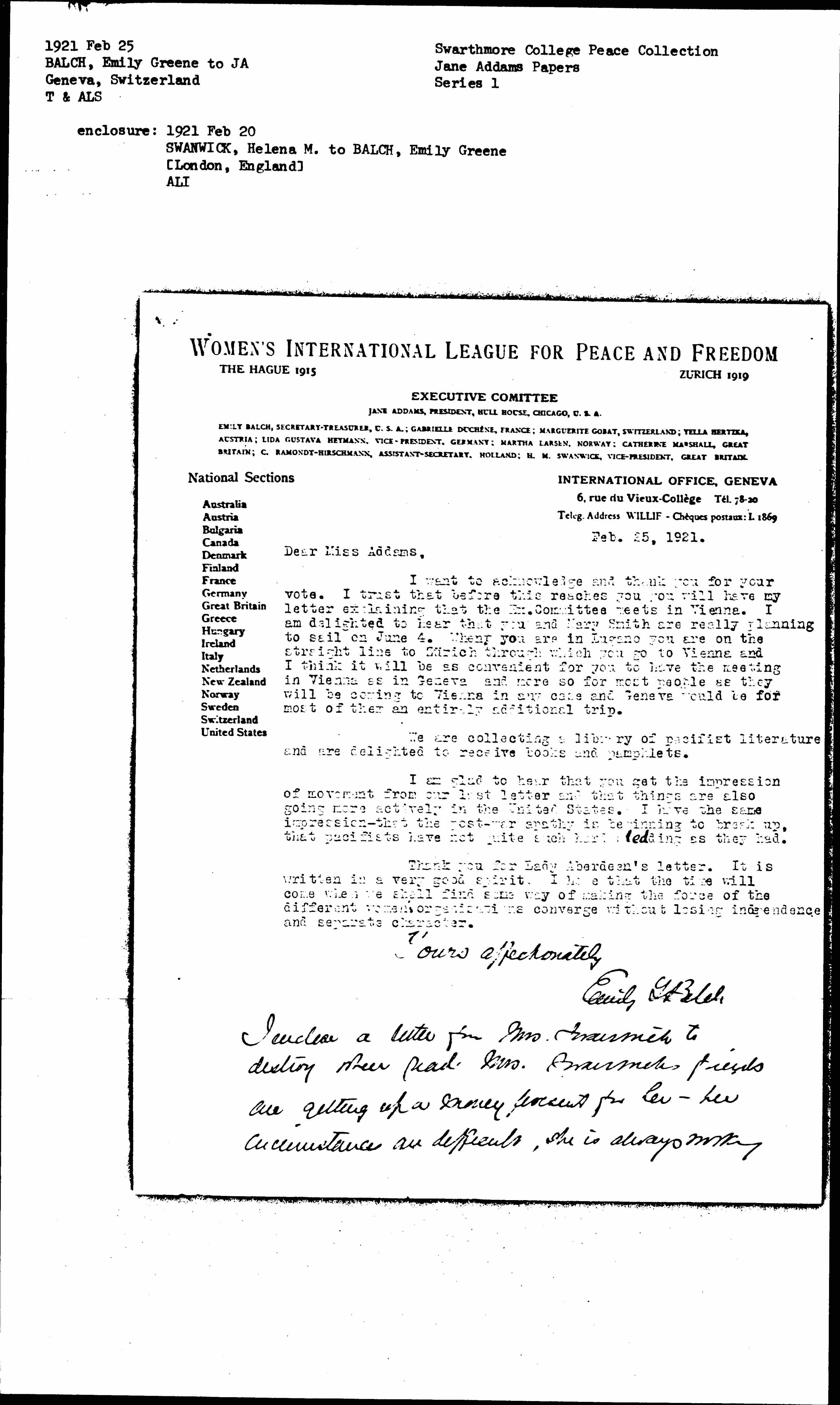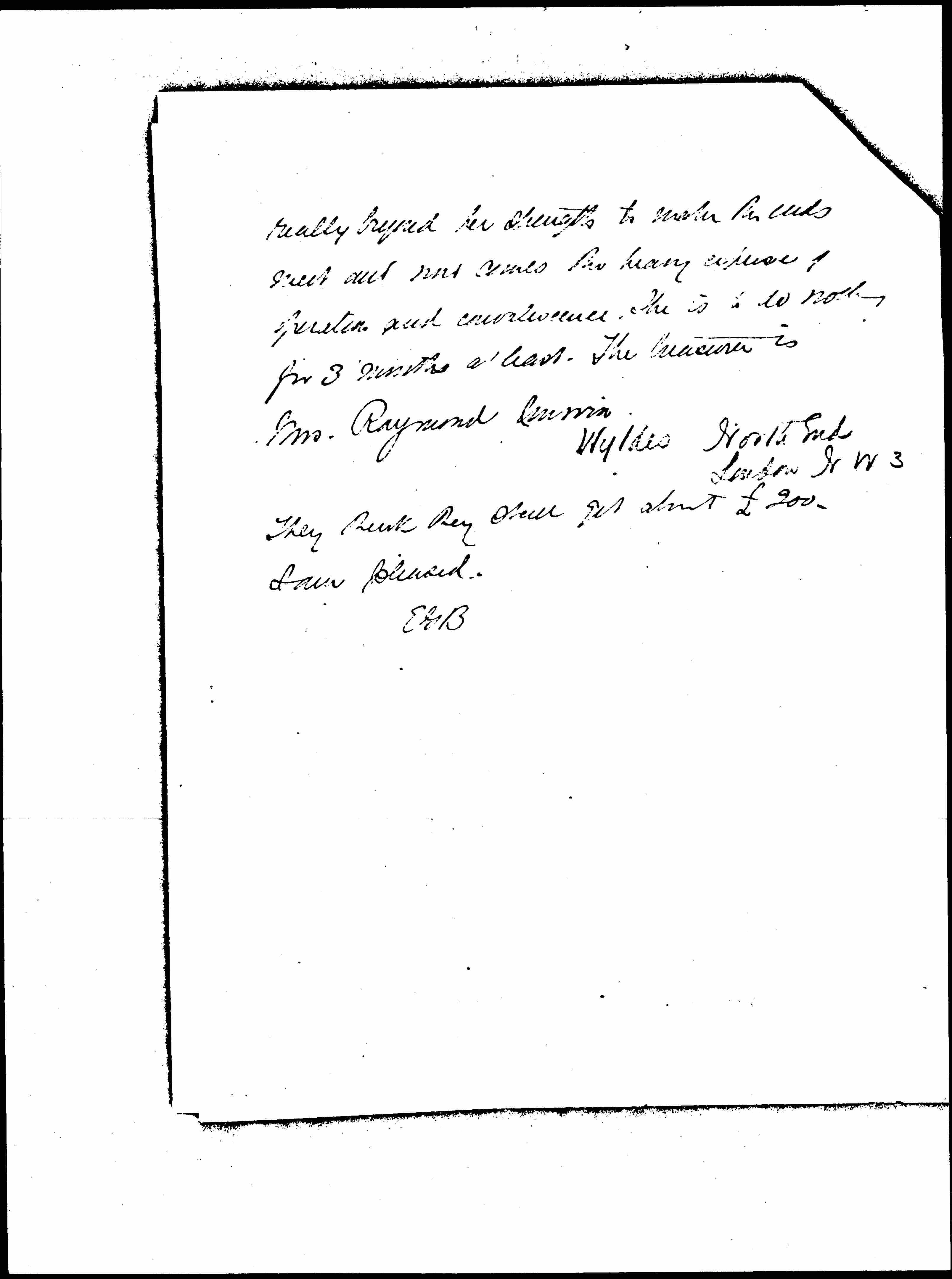 ↑I enclose a letter from Mrs. Swanwick to destroy when read. Mrs. Swanwicks friends are getting up a money present for her -- her circumstances are difficult, she is always working [page 2] really beyond her strengths to make the ends meet and now comes the heavy expense of operation and convalescence. She is to do nothing for 3 months at least. The treasurer is Mrs. Raymond Unwin.
