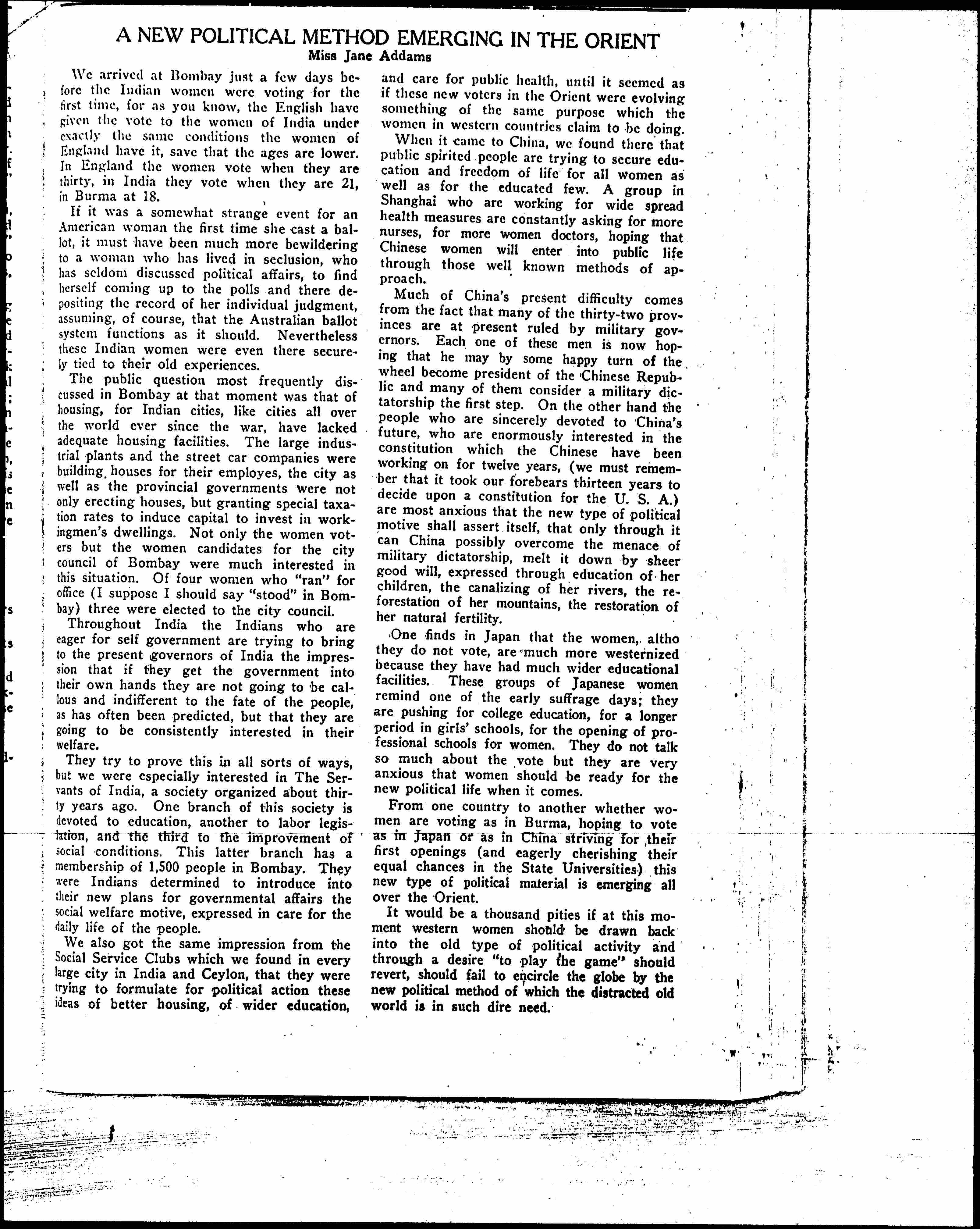 From one country to another whether women are voting as in Burma, hoping to vote as in Japan or as in China striving for their first openings (and eagerly cherishing their equal chances in the State Universities) this new type of political material is emerging all over the Orient.