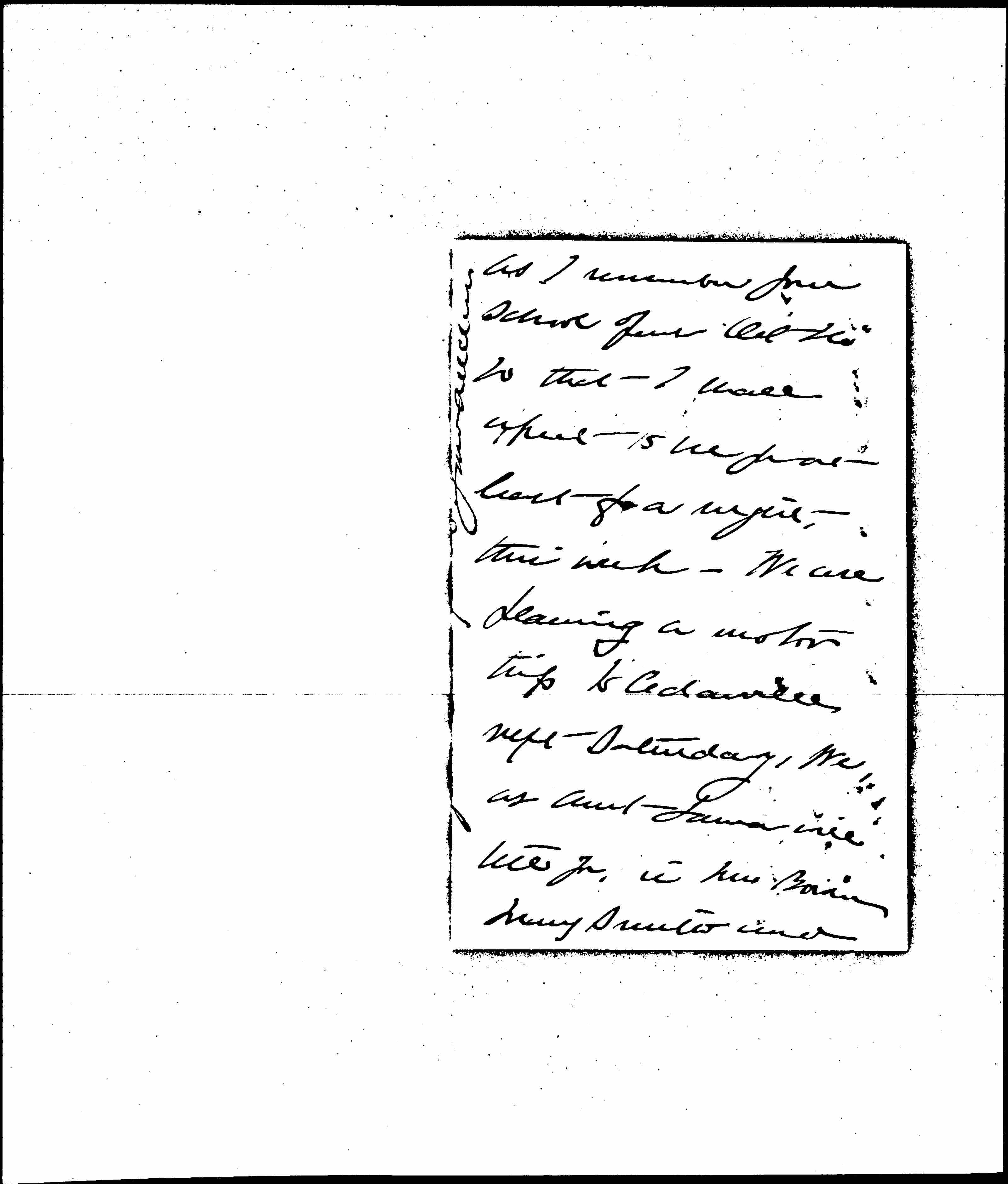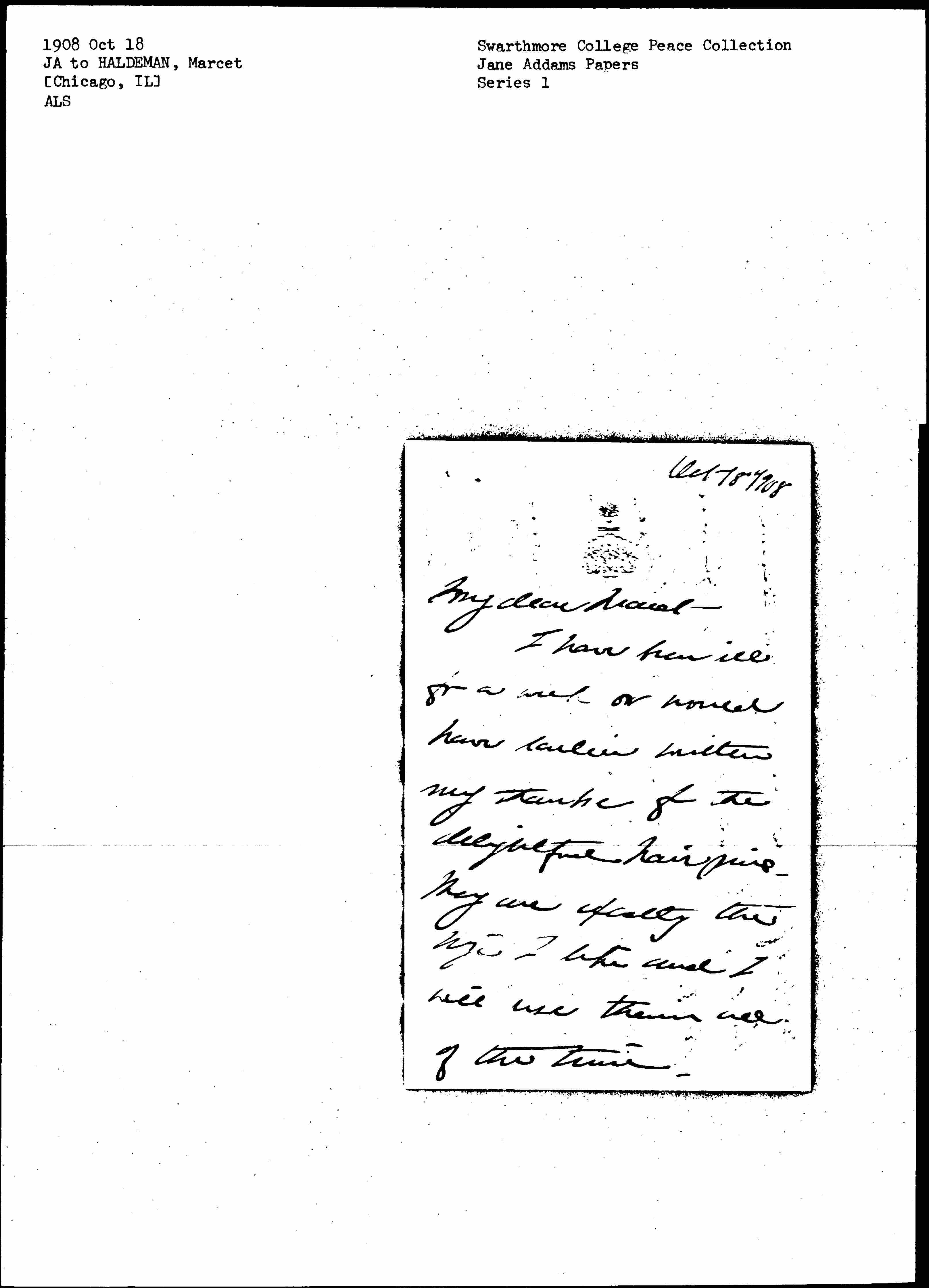 I have been ill for a week or would have earlier written my thanks for the delightful hairpins. They are exactly the size I take and I will use them all of the time. [page 2] As I remember your school opens Oct 26" so that I shall expect to see you at least for a night this week. We are planning a motor trip to Cedarville next Saturday. We, as Aunt Laura will tell you, is Mrs Bowen, Mary Smith and [page 3] myself -- as we do not arrive until Sunday morning you will probably be gone, but I hope that you will reach Chicago before we leave on Saturday morning. With love to the Cedarville household, I am always your loving Aunt Jane Addams