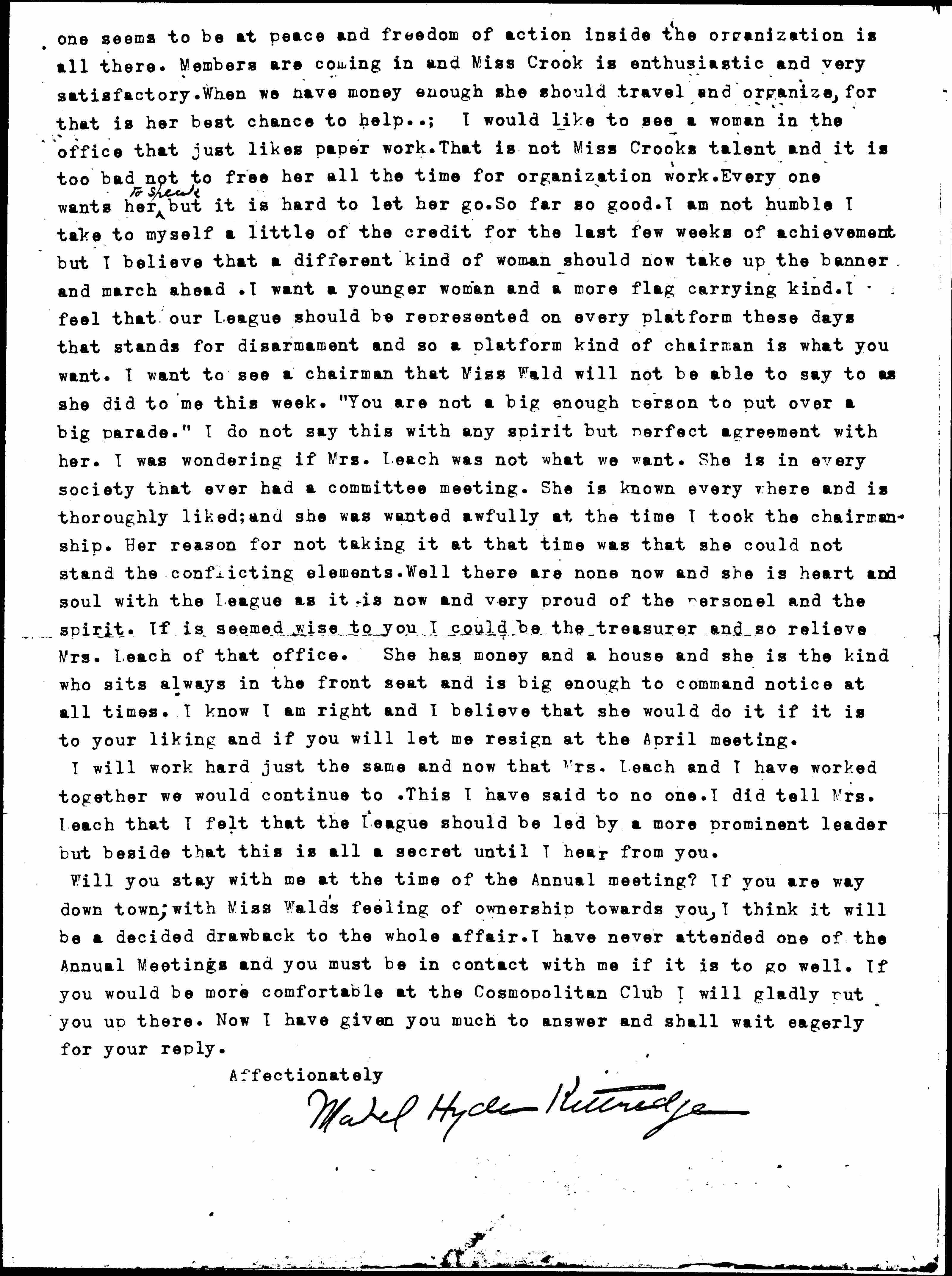 Yesterday I had a long and understanding talk with Mrs. Leach about the future of the U.S. section of the [W.I.L.P.F.] I think it is doing well now. [Everyone] [page 2] seems to be at peace and freedom of action inside the organization is all there. Members are coming in and Miss Crook is enthusiastic and very satisfactory. When we have money enough she should travel and organize, for that is her best chance to help. I would like to see a woman in the office that just likes paper work. That is not Miss Crooks talent and it is too bad not to free her all the time for organization work. Every one wants her ↑to speak↓ but it is hard to let her go. So far so good. I am not humble. I take to myself a little of the credit for the last few weeks of achievement but I believe that a different kind of woman should now take up the banner and march ahead. I want a younger woman and a more flag carrying kind. I feel that our League should be represented on every platform these days that stands for disarmament and so a platform kind of chairman is what you want. I want to see a chairman that Miss Wald will not be able to say to as she did to me this week. "You are not a big enough person to put over a big parade." I do not say this with any spirit but perfect agreement with her. I was wondering if Mrs. Leach was not what we want. She is in every society that ever had a committee meeting. She is known every where and is thoroughly liked; and she was wanted awfully at the time I took the chairmanship. Her reason for not taking it at the time was that she could not stand the conflicting elements. Well there are none now and she is heart and soul with the League as it is now and very proud of the [personnel] and the spirit. If [it] seemed wise to you I could be the treasurer and so relieve Mrs. Leach of that office. She has money and a house and she is the kind who sits always in the front seat and is big enough to command notice at all times. I know I am right and I believe that she would do it if it is to your liking and if you will let me resign at the April meeting.