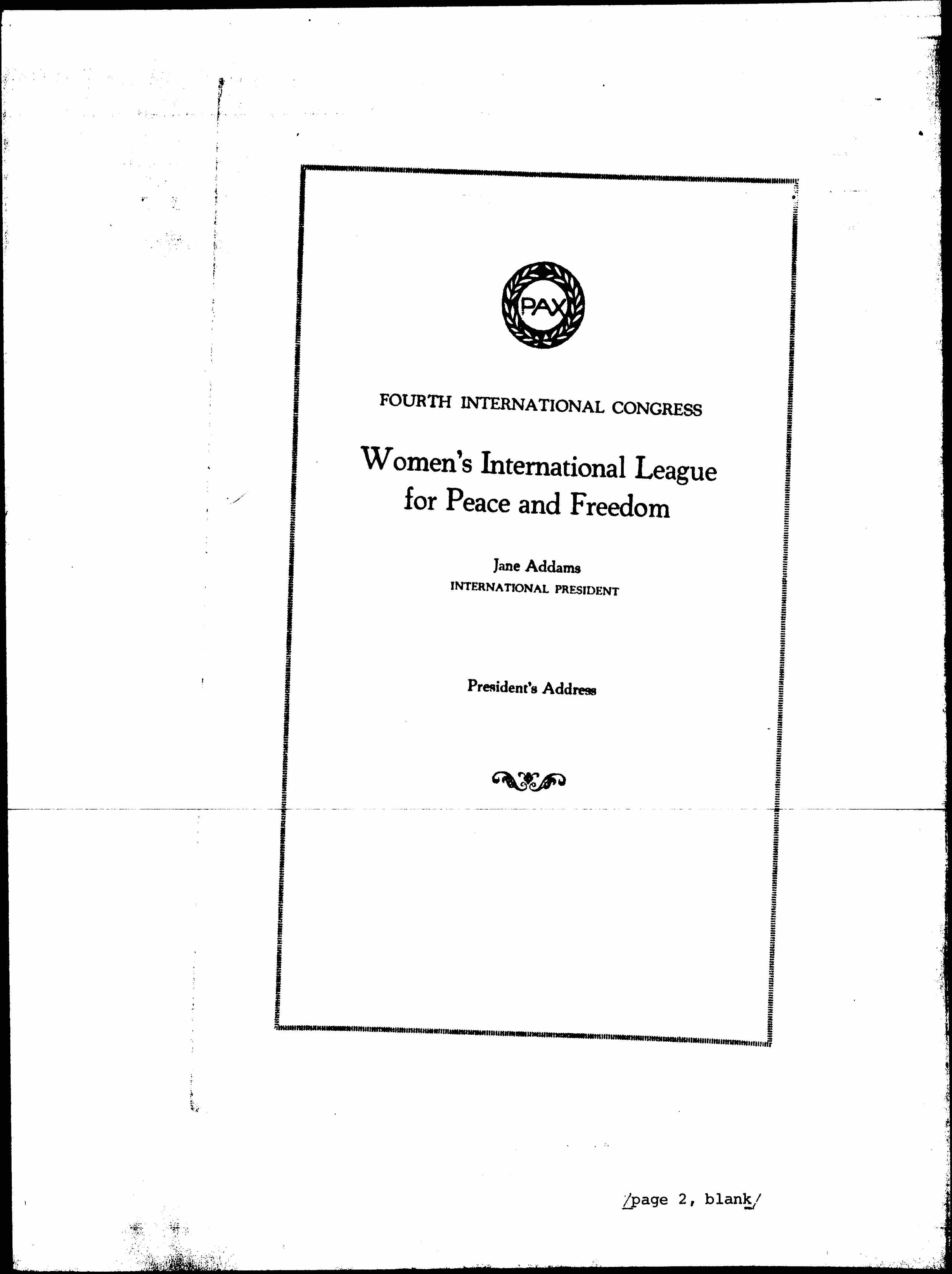 It gives me great pleasure to announce the opening of the Fourth Congress of the Women's International League for Peace and Freedom, which we can almost call our fifth, as we also convened the emergency conference held at The Hague in December, 1922. Will you permit me to report, in the midst of chaos and disaster still obtaining in many parts of the world, here and there an attempt to live according to the principles of a New International Order.