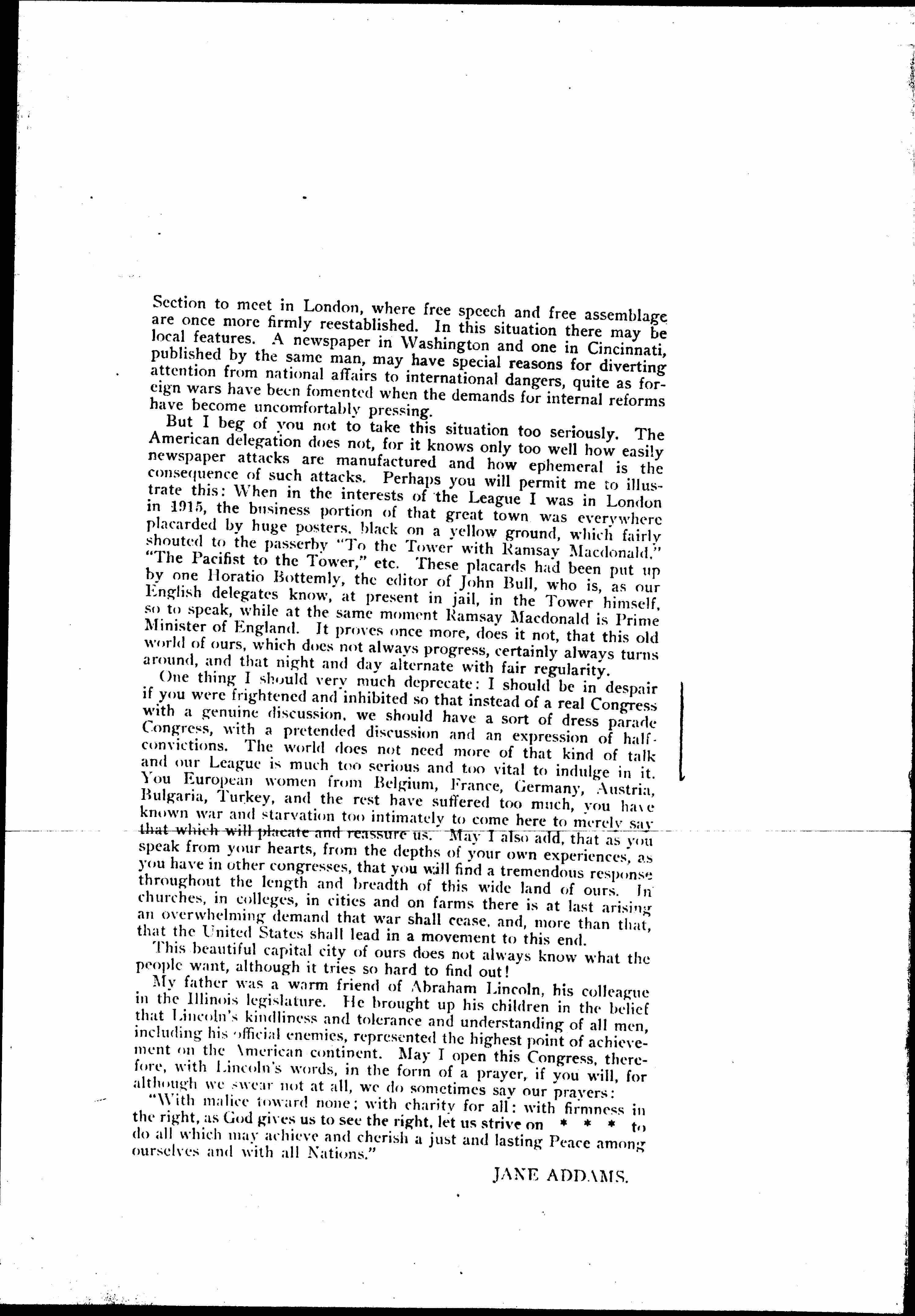 One thing I should very much deprecate: I should be in despair if you were frightened and inhibited so that instead of a real Congress with a genuine discussion, we should have a sort of dress parade Congress, with a pretended discussion and an expression of half-convictions. The world does not need more of that kind of talk and our League is much too serious and too vital to indulge in it. You European women from Belgium, France, Germany, Austria, Bulgaria, Turkey, and the rest have suffered too much, you have known war and starvation too intimately to come here to merely say that which will placate and reassure us. May I also add, that as you speak from your hearts, from the depths of your own experiences, as you have in other congresses, that you will find a tremendous response throughout the length and breadth of this wide land of ours. In churches, in colleges, in cities and on farms there is at last arising an overwhelming demand that war shall cease, and, more than that, that the United States shall lead in a movement to this end.