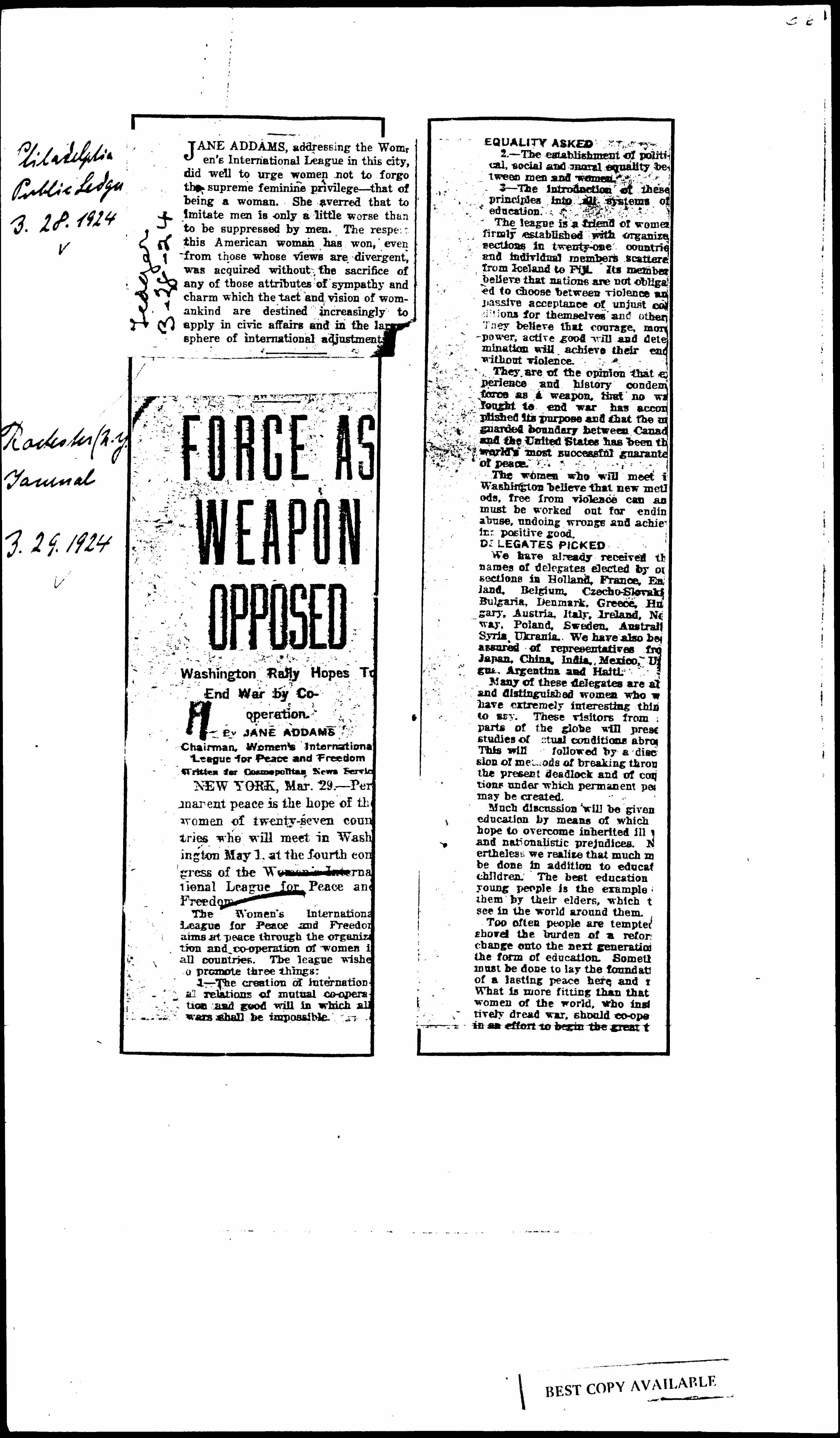Many of these delegates are [able] and distinguished women who [missing word] have extremely interesting [things] to say. These visitors from [all?] parts of the globe will [present] studies of [actual] conditions [abroad.] This will [be?] followed by a [discussion] of methods of breaking [through] the present deadlock and of [conditions] under which permanent [peace] may be created.