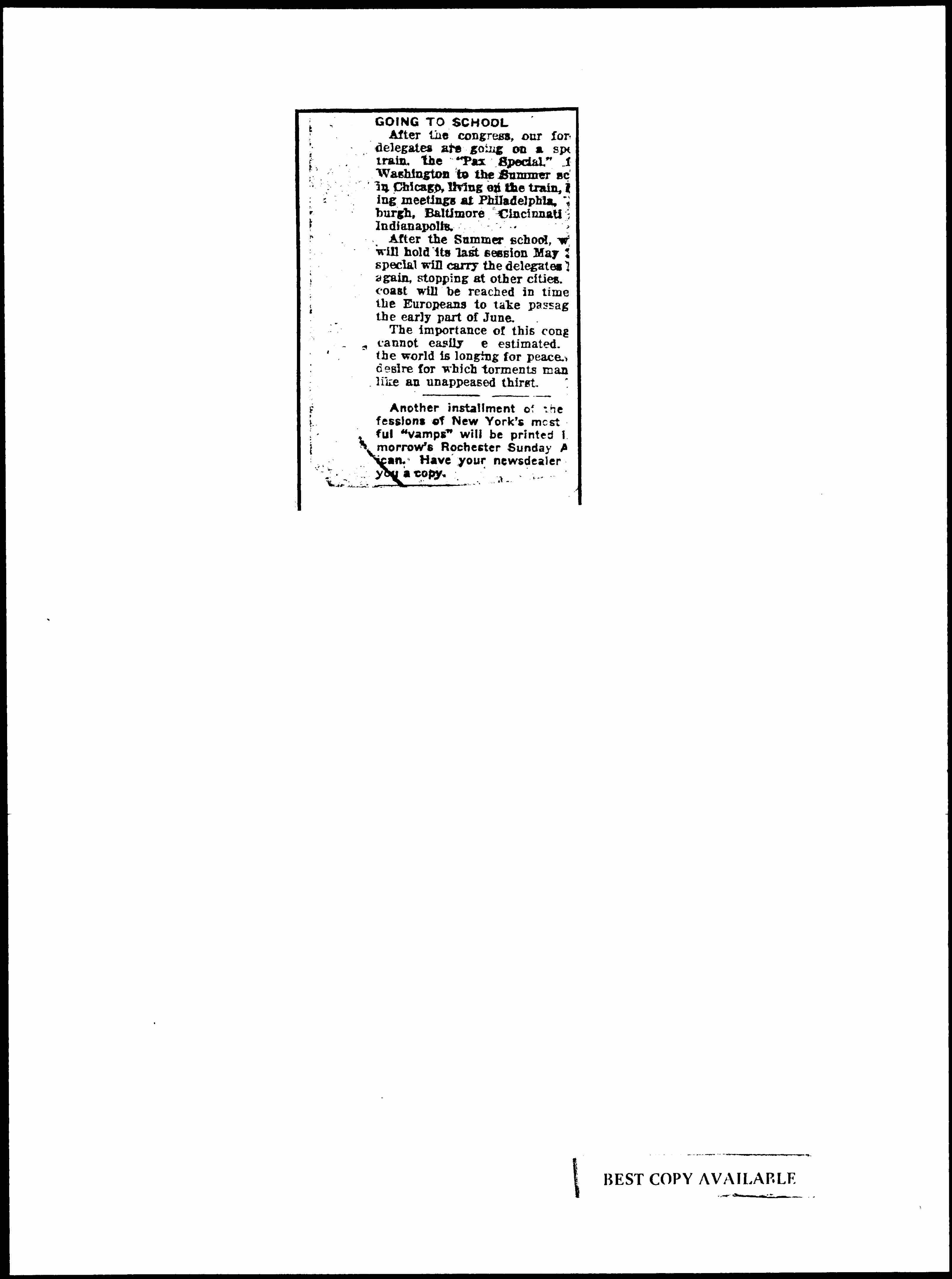 After the Summer School, [missing word] will hold its last session May [3?] special will carry the delegates [missing word] again, stopping at other cities. [missing word] coast will be reached in time [for?] the Europeans to take [passage] the early part of June.