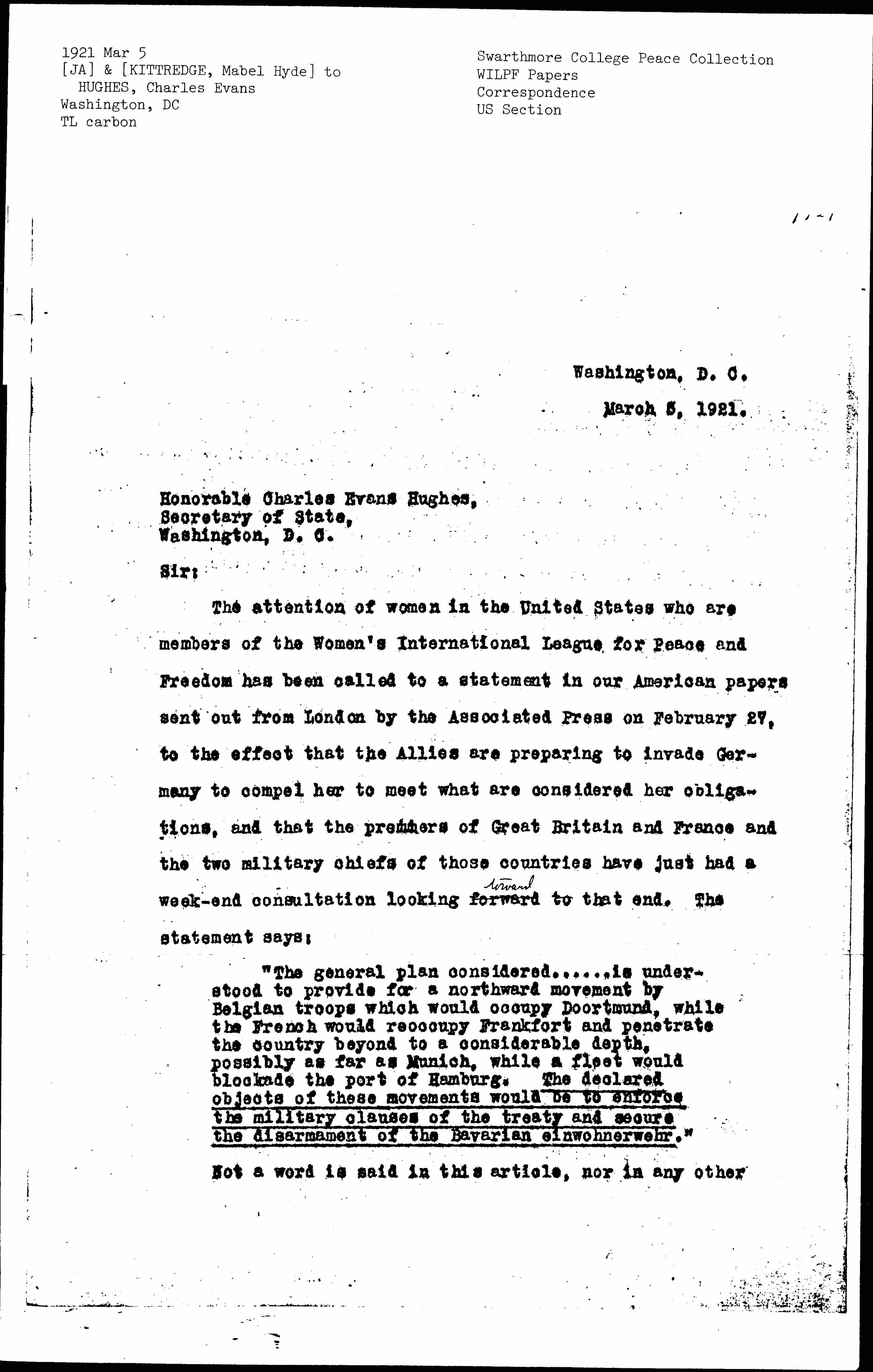 The attention of women in the United States who are members of the Women's International League for Peace and Freedom has been called to a statement in our American papers sent out from London by the Associated Press on February 27, to the effect that the Allies are preparing to invade Germany to compel her to meet what are considered her obligations, and that the premiers of Great Britain and France and the two military chiefs of those countries have just had a [weekend] consultation looking forward to ↑toward↓ that end. The statement says: