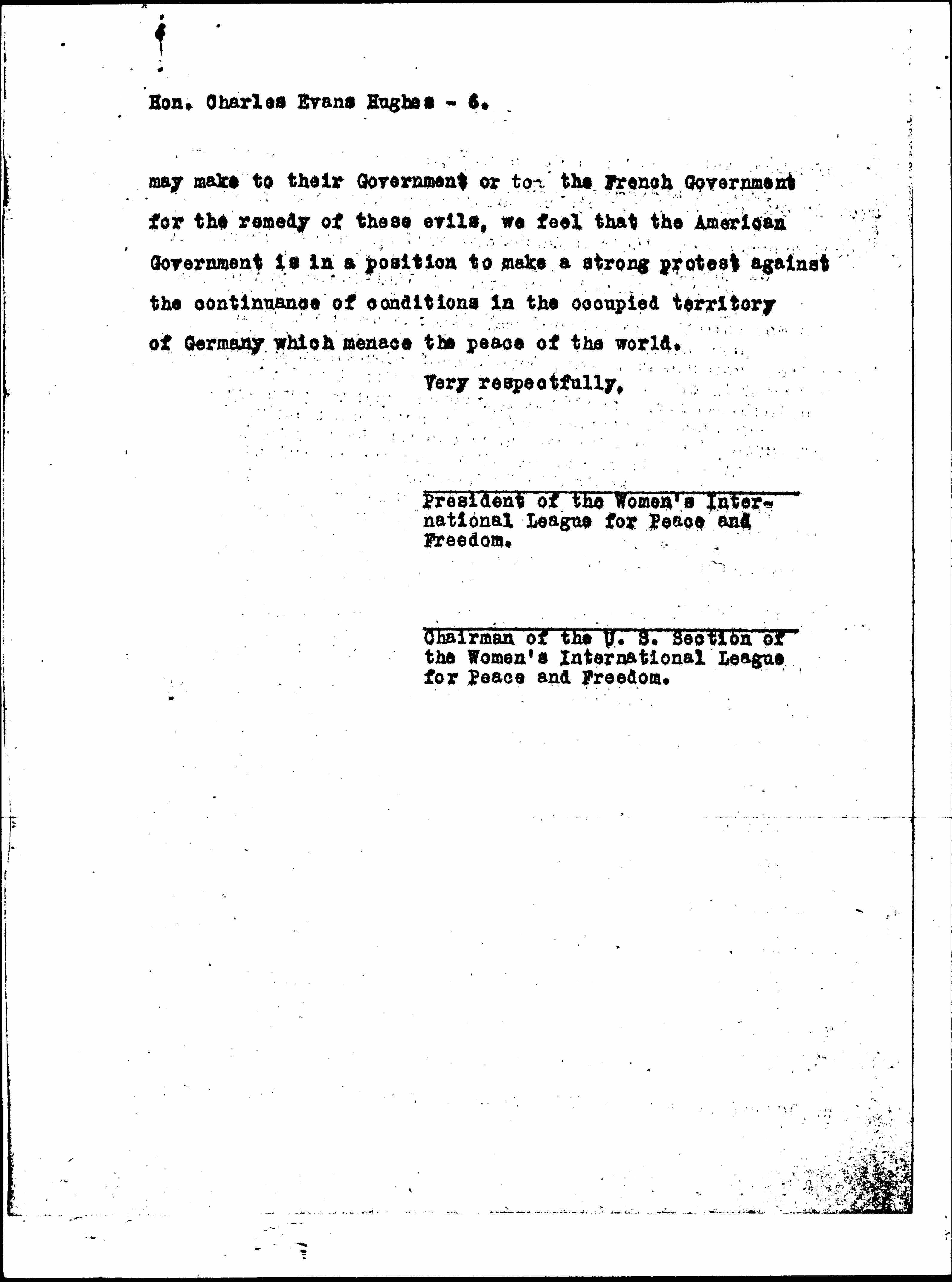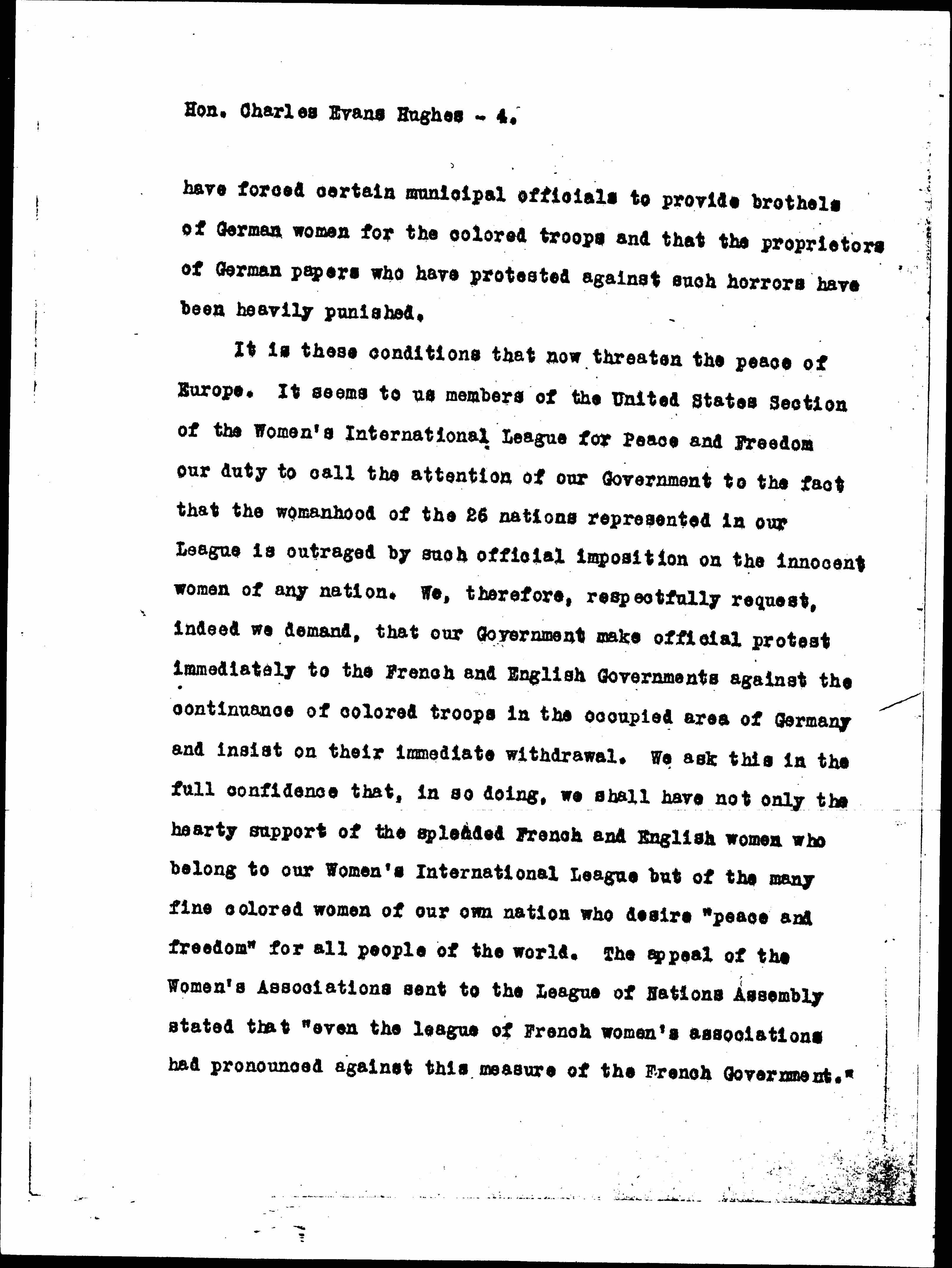 It is these conditions that now threaten the peace of Europe. It seems to us members of the United States Section of the Women's International League for Peace and Freedom our duty to call the attention of our Government to the fact that the womanhood of the 26 nations represented in our League is outraged by such official imposition on the innocent women of any nation. We, therefore, respectfully request, indeed we demand, that our Government make official protest immediately to the French and English Governments against the continuance of colored troops in the occupied area of Germany and insist on their immediate withdrawal. We ask this in the full confidence that, in so doing, we shall have not only the hearty support of the splendid French and English women who belong to our Women's International League but of the many fine colored women of our own nation who desire "peace and freedom" for all people of the world. The appeal of the women's associations sent to the League of Nations Assembly stated that "even the league of French women's associations has pronounced against this measure of the French government." [page 5]