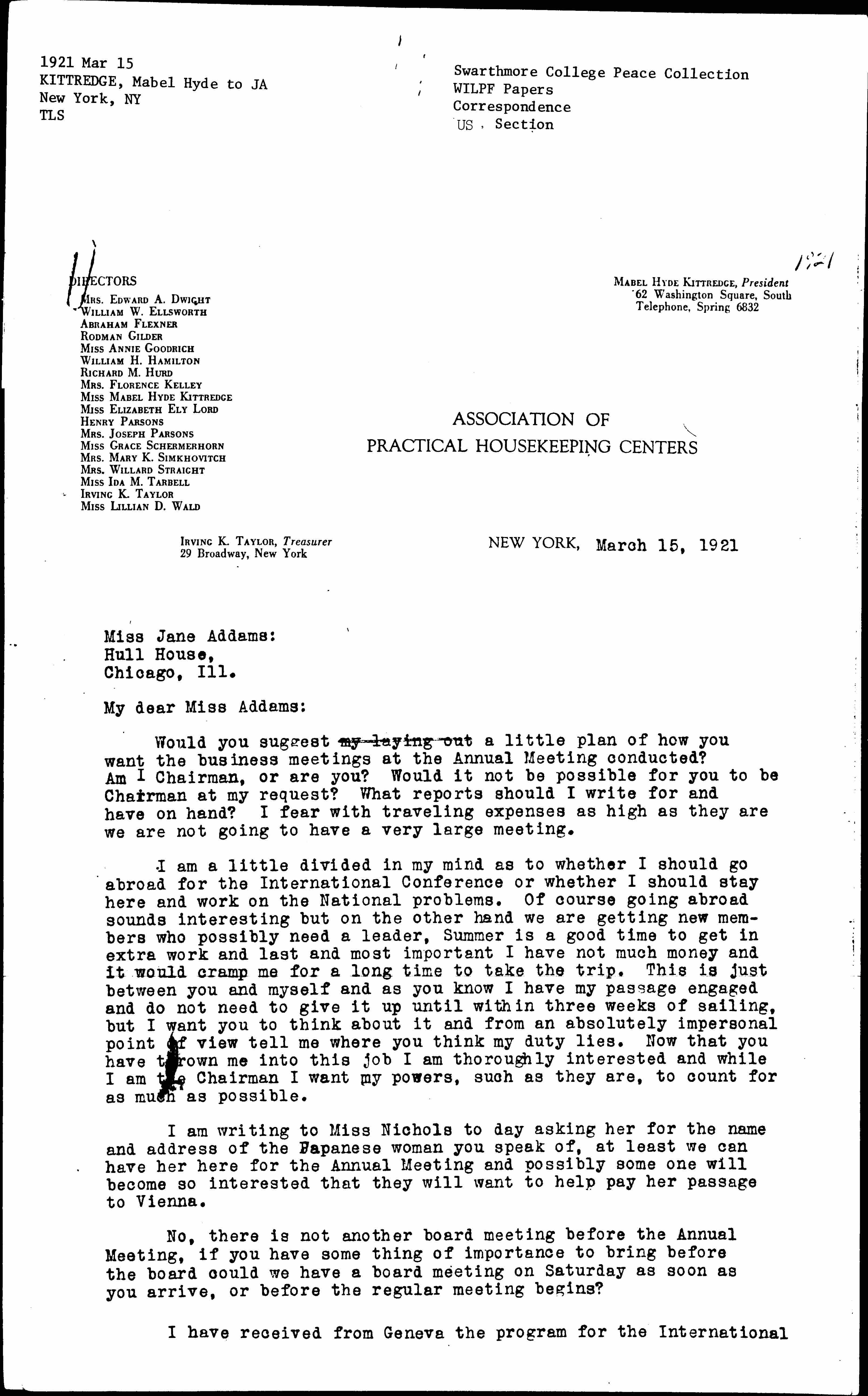 I am a little divided in my mind as to whether I should go abroad for the International Conference or whether I should stay here and work on the National problems. Of course going abroad sounds interesting but on the other hand we are getting new members who possibly need a leader. Summer is a good time to get in extra work and last and most important I have not much money and it would cramp me for a long time to take the trip. This is just between you and myself and as you know I have my passage engaged and do not need to give it up until within three weeks of sailing, but I want you to think about it and from an absolutely impersonal point of view tell me where you think my duty lies. Now that you have thrown me into this job I am thoroughly interested and while I am the Chairman I want my powers, such as they are, to count for as much as possible.