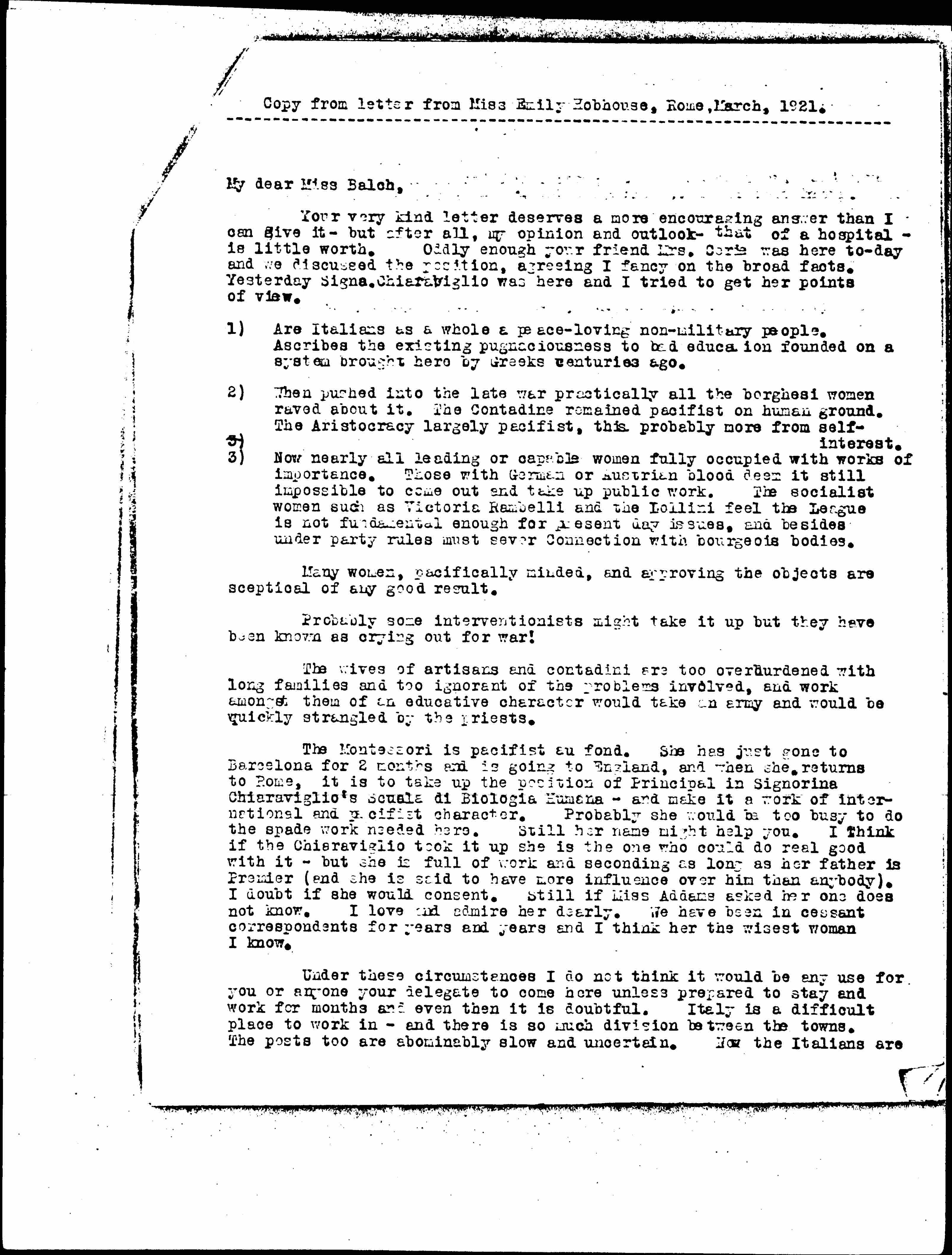 The Montessori is pacifist au fond. She has just gone to Barcelona for 2 months and is going to England, and when she returns to Rome, it is to take up the position of Principal in Signorina Chiaraviglio's Scuola di Bologna Humana -- and make it a work of international and pacifist character. Probably she would be too busy to do the spade work needed here. Still her name might help you. I think if the Chiaraviglio took it up she is the one who could do real good with it -- but she is full of work and seconding as long as her father is Premier (and she is said to have more influence over him than anybody). I doubt if she would consent. Still if Miss Addams asked her one does not know. I love and admire her dearly. We have been incessant correspondence for years and years and I think her the wisest woman I know.