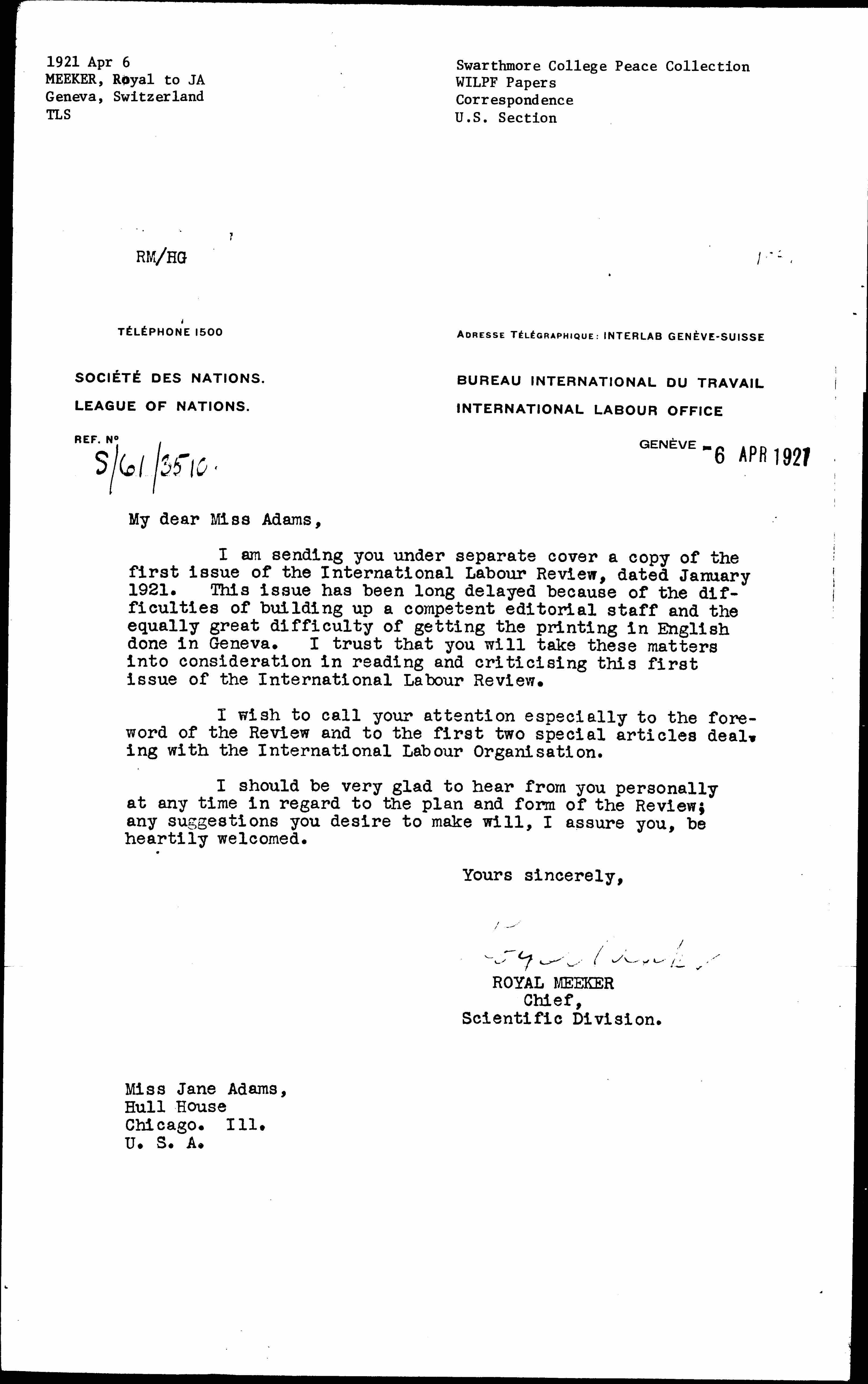 I am sending you under separate cover a copy of the first issue of the International Labour Review, dated January 1921. This issue has been long delayed because of the difficulties of building up a competent editorial staff and the equally great difficulty of getting the printing in English done in Geneva. I trust that you will take these matters into consideration in reading and [criticizing] this first issue of the International Labour Review.