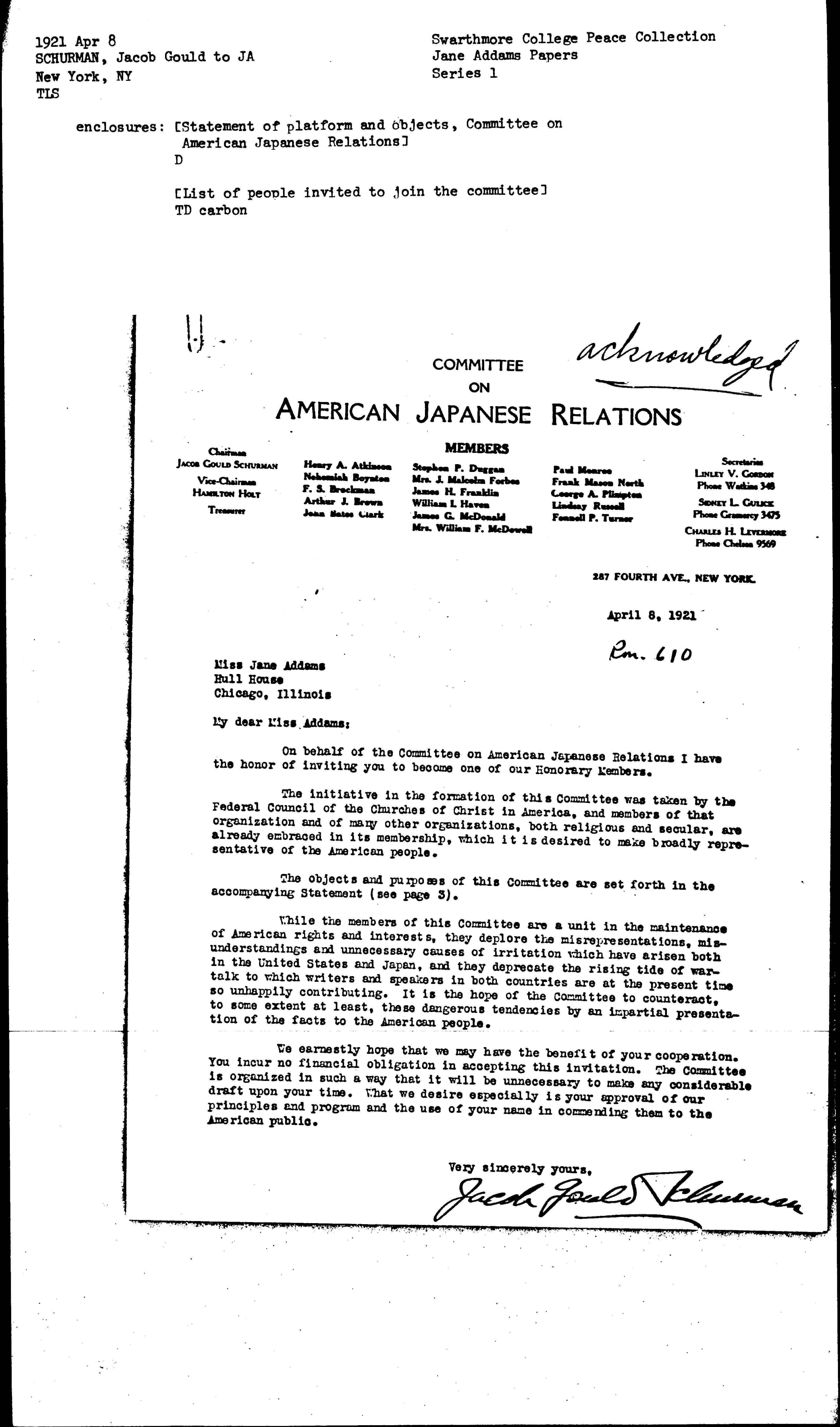 On behalf of the Committee on American Japanese Relations I have the honor of inviting you to become one of our Honorary Members.