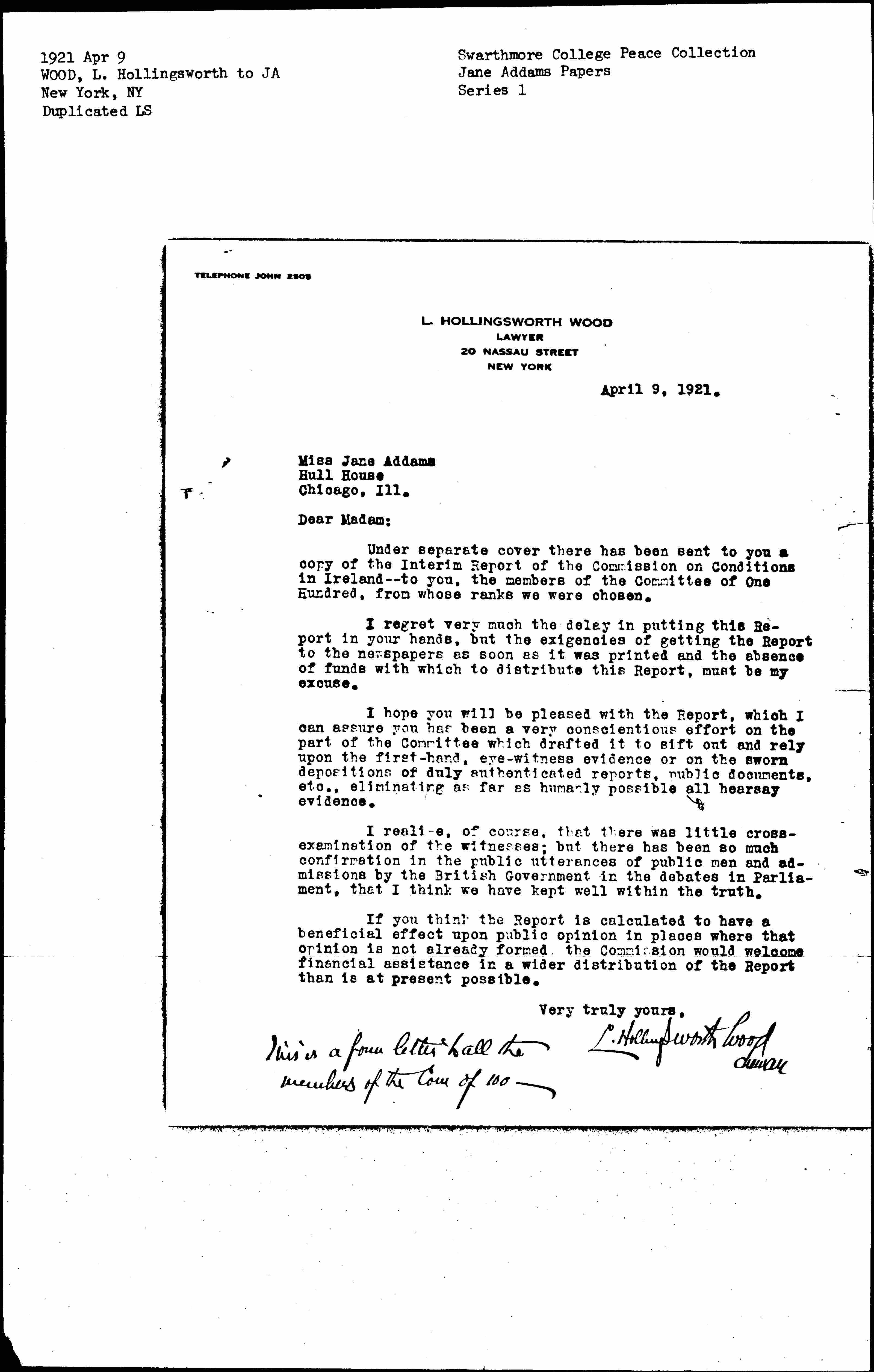 Under separate cover there has been sent to you a copy of the Interim Report of the Commission on Conditions in Ireland -- to you, the members of the Committee of One Hundred, from whose ranks we were chosen.