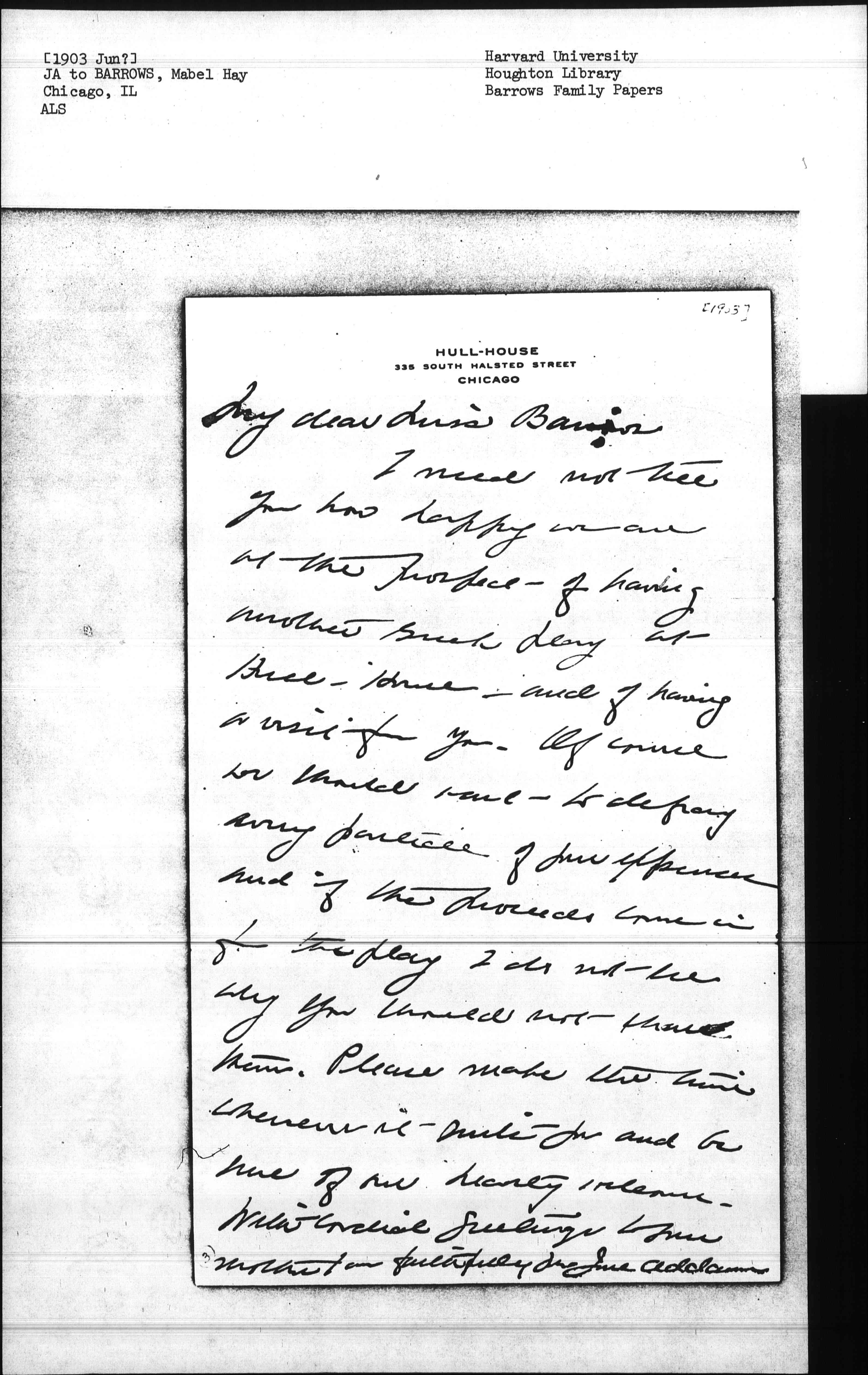 I need not tell you how happy we are at the prospect of having another Greek play at Hull-House—and of having a visit from you. Of course we should want to defray any particle of your expenses and if the proceeds come in for the play I do not see why you should not share them. Please make the time whenever it suits you and be sure of our hearty [illegible]. With cordial greetings to your mother I am faithfully yrs Jane Addams