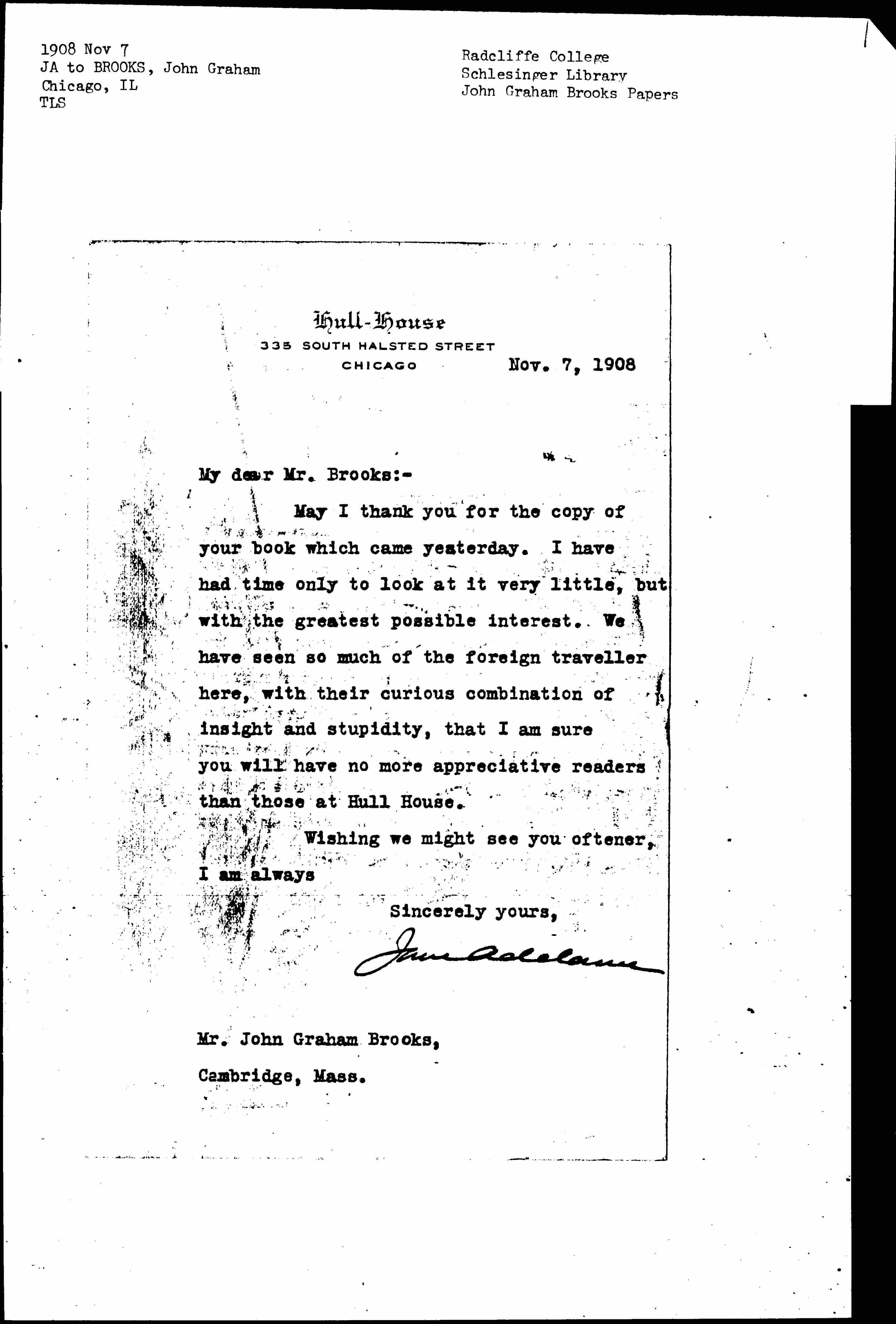 May I thank you for the copy of your book which came yesterday. I have had time only to look at it very little, but with the greatest possible interest. We have seen so much of the foreign traveler here, with their curious combination of insight and stupidity, that I am sure you will have no more appreciative readers than those at Hull House.