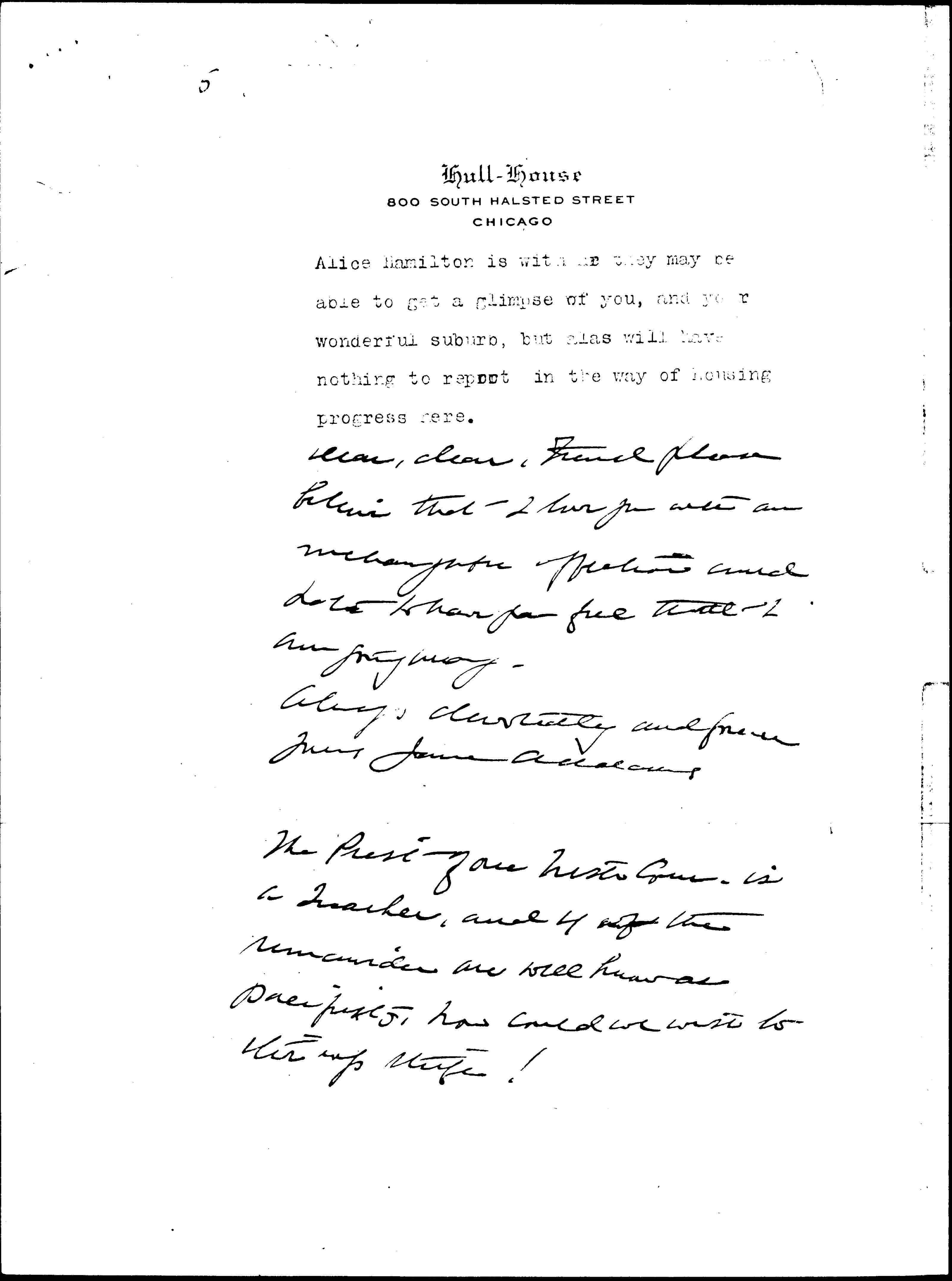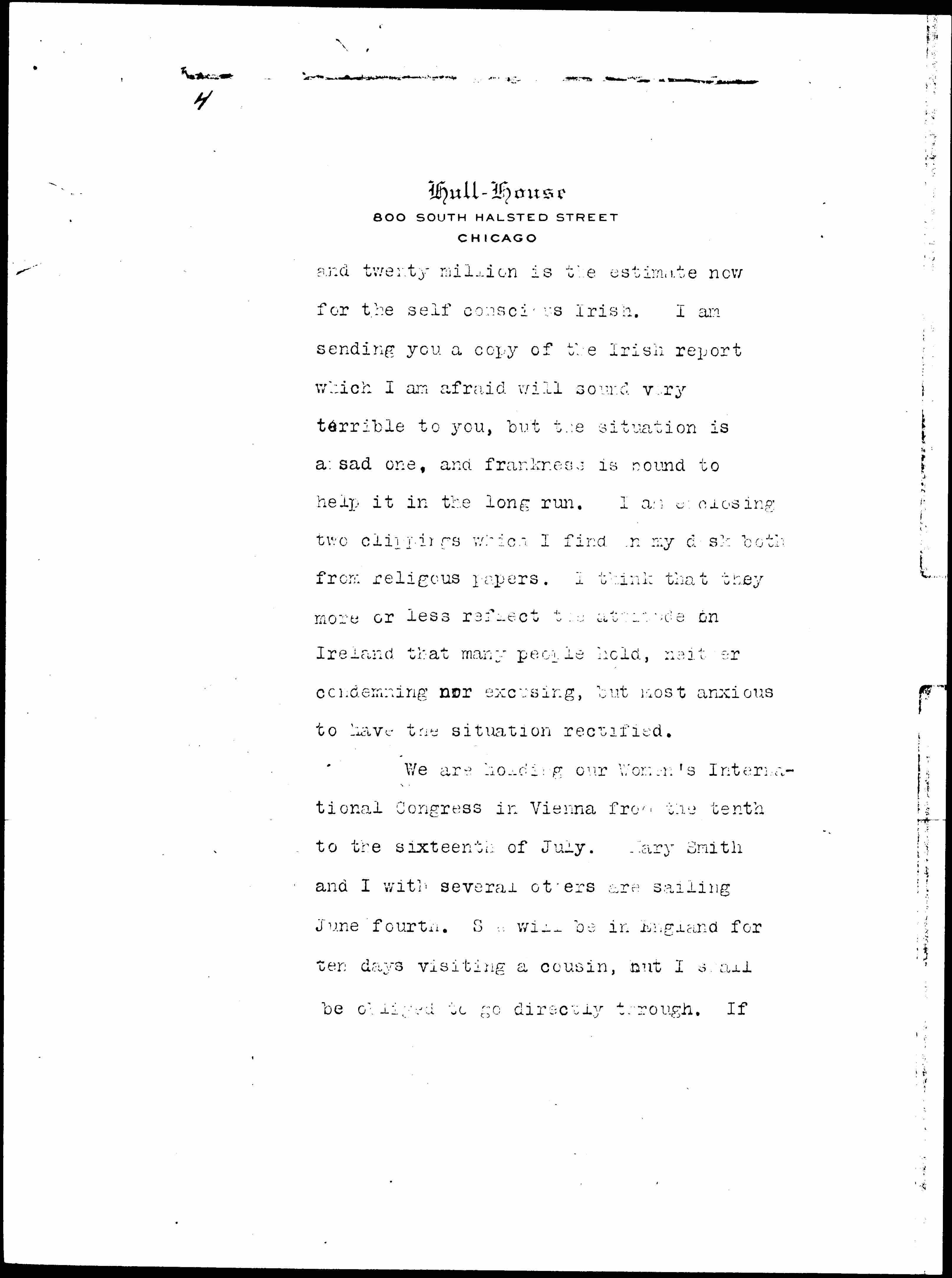 We are holding our Women's International Congress in Vienna from the tenth to the sixteenth of July. Mary Smith and I with several others are sailing June fourth. [She] will be in England for ten days visiting a cousin, but I shall be obliged to go directly through. If [page 5] Alice Hamilton is with [me] they may be able to get a glimpse of you, and [your] wonderful suburb, but alas will have nothing to report in the way of housing progress here.