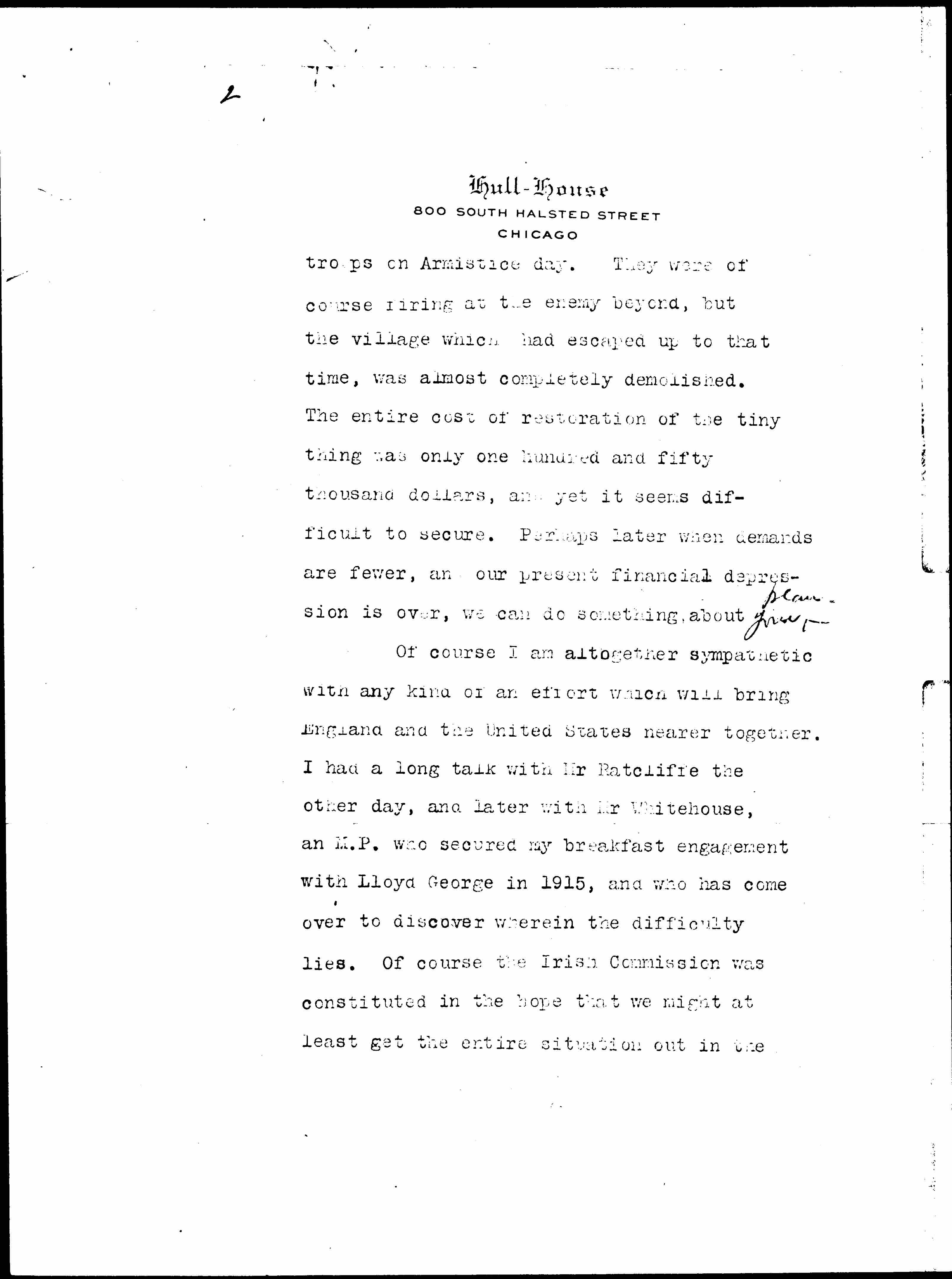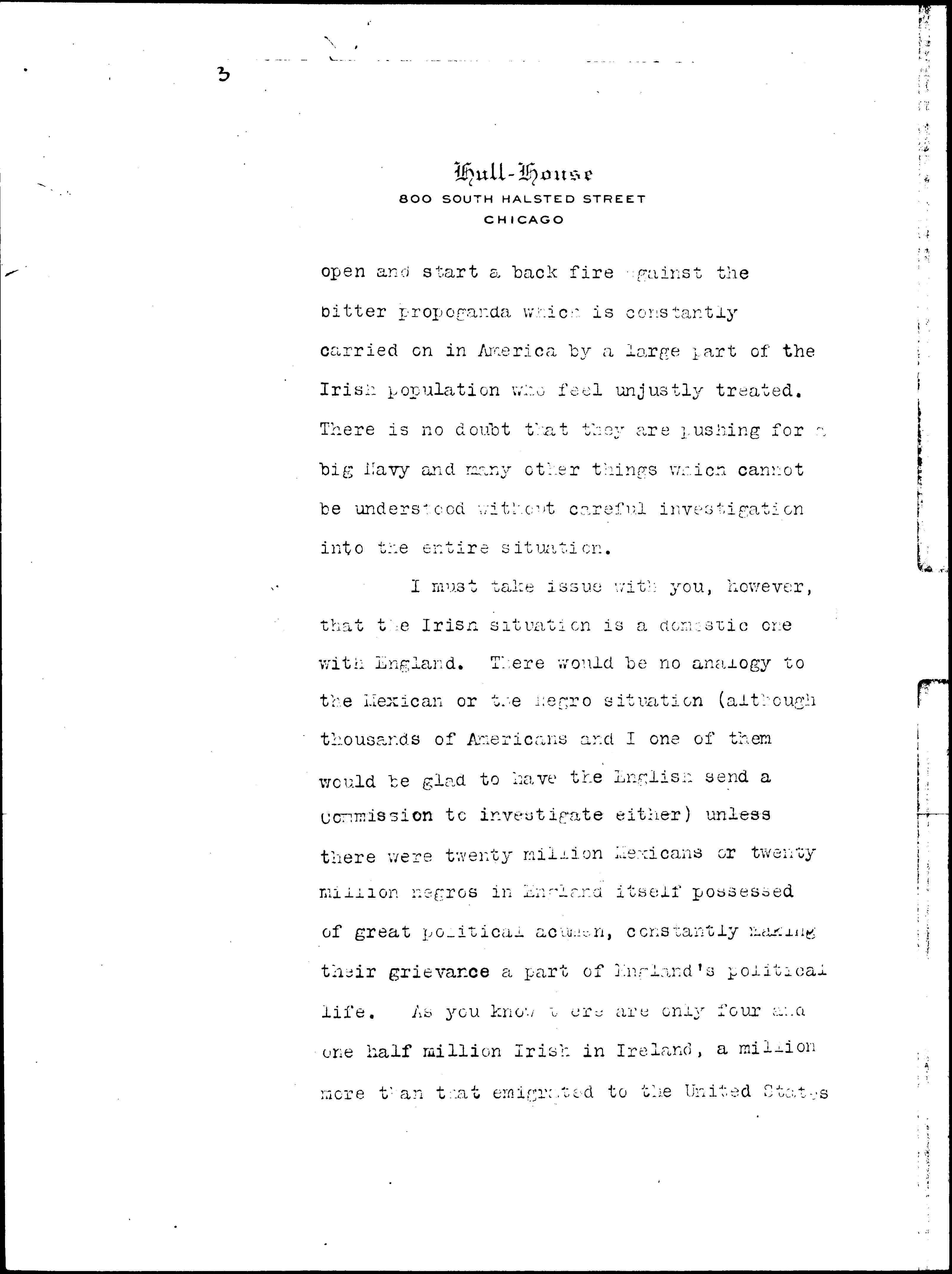 I must take issue with you, however, that the Irish situation is a domestic one with England. There would be no analogy to the Mexican or the Negro situation (although thousands of Americans and I one of them would be glad to have the English send a Commission to investigate either) unless there were twenty million Mexicans or twenty million negroes in England itself possessed of great political acumen, constantly making their grievance a part of England's political life. As you know there are only four and one half million Irish in Ireland, a million more than that emigrated to the United States [page 4] and twenty million is the estimate now for the self conscious Irish. I am sending you a copy of the Irish report which I am afraid will sound very terrible to you, but the situation is a sad one, and frankness is bound to help it in the long run. I am enclosing two clippings which I find [on] my [desk] both from religious papers. I think that they more or less reflect the attitude on Ireland that many people hold, [neither] condemning nor excusing, but most anxious to have the situation rectified.