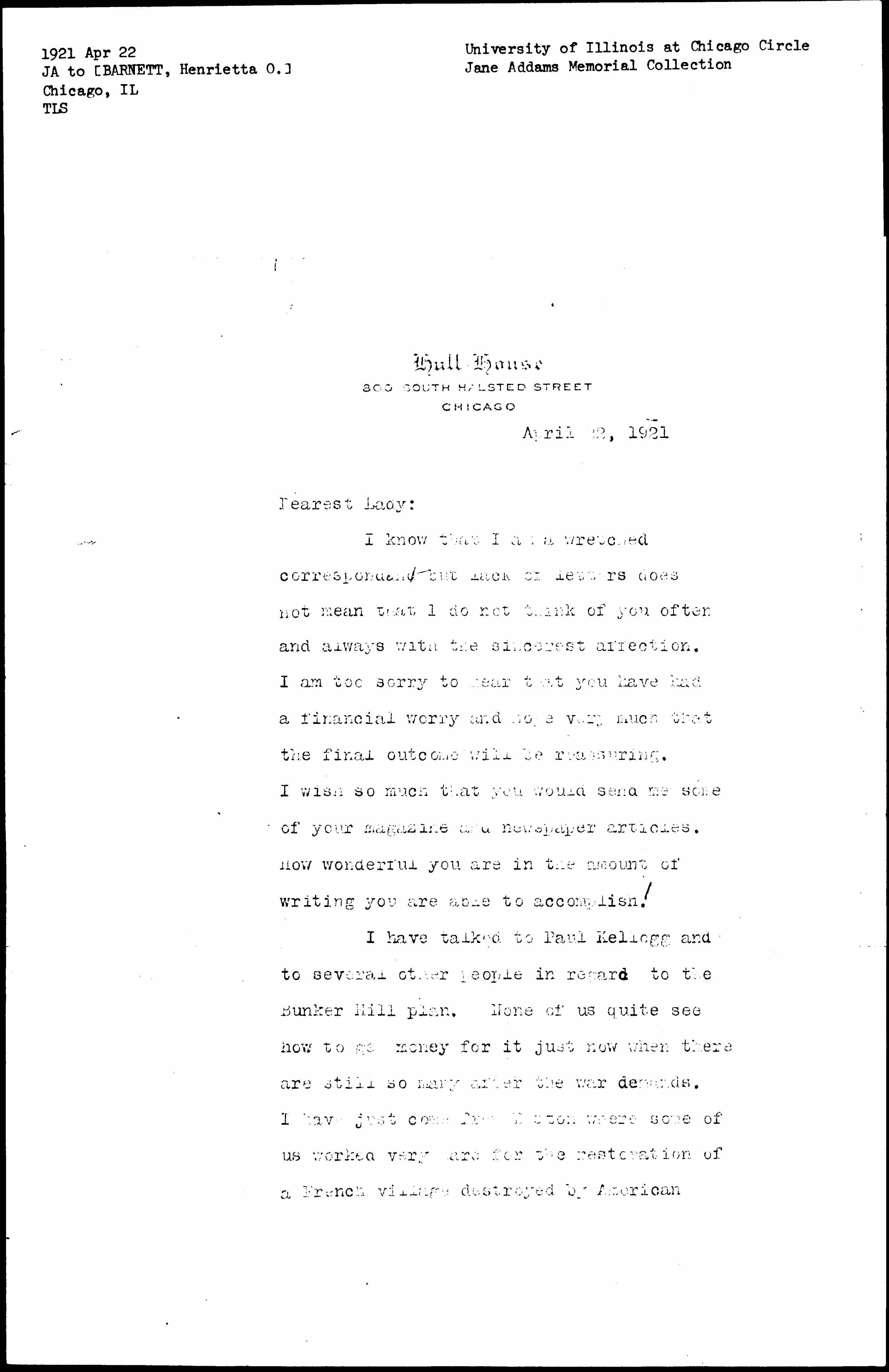 I have talked to Paul Kellogg and to several other people in regard to the Bunker Hill plan. None of us quite see how to get money for it just now when there are still so many after the war demands. I have just come from Boston where some of us worked very [hard] for the restoration of a French village destroyed by American [page 2] troops on Armistice day. They were of course firing at the enemy beyond, but the village which had escaped up to that time, was almost completely demolished. The entire cost of restoration of the tiny thing was only one hundred and fifty thousand dollars, and yet it seems difficult to secure. Perhaps later when demands are fewer, [and] our present financial depression is over, we can do something about ↑your plan.↓