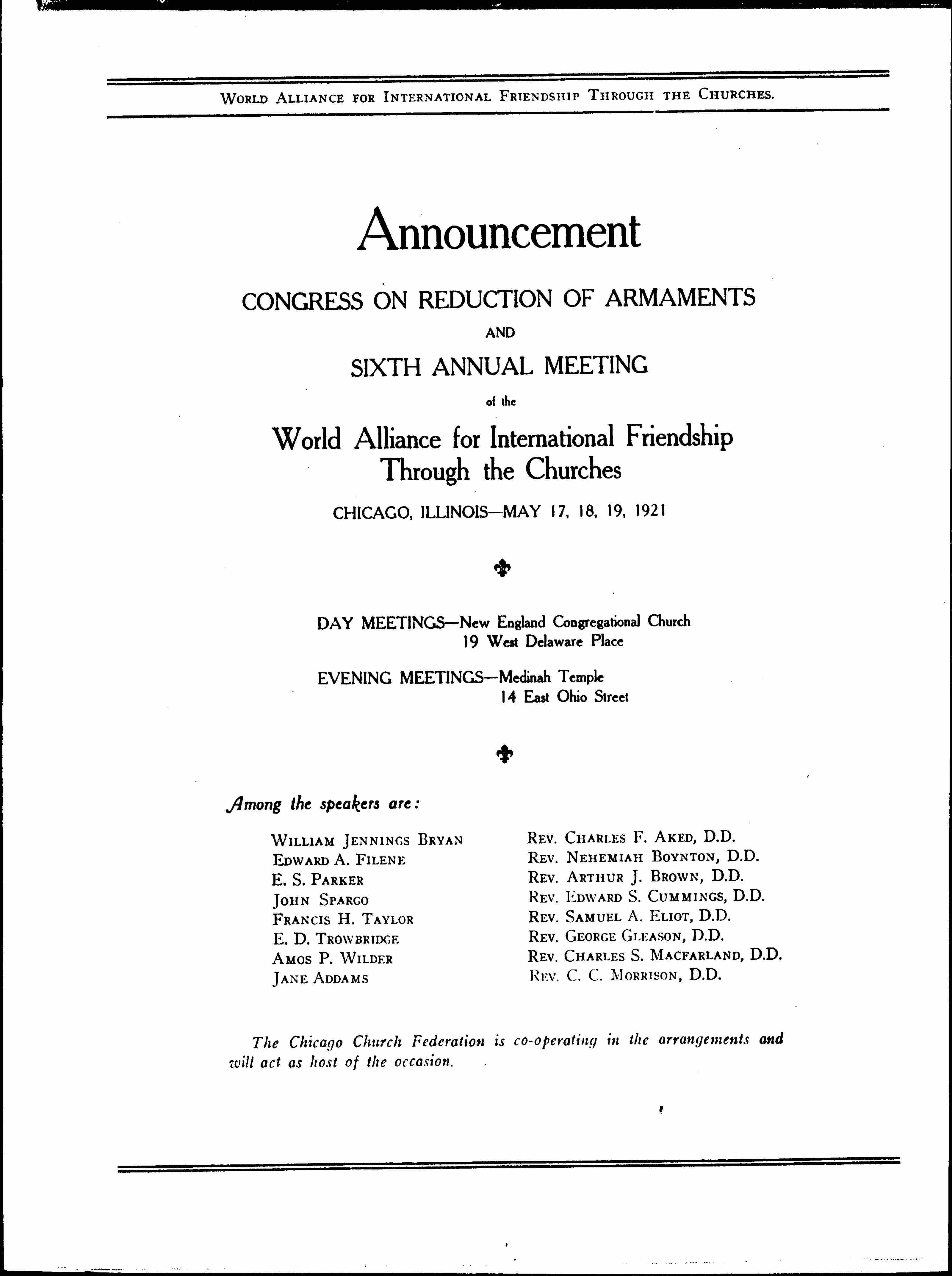 The Chicago Church Federation is [cooperating] in the arrangements and will act as host of the occasion. [page 2]