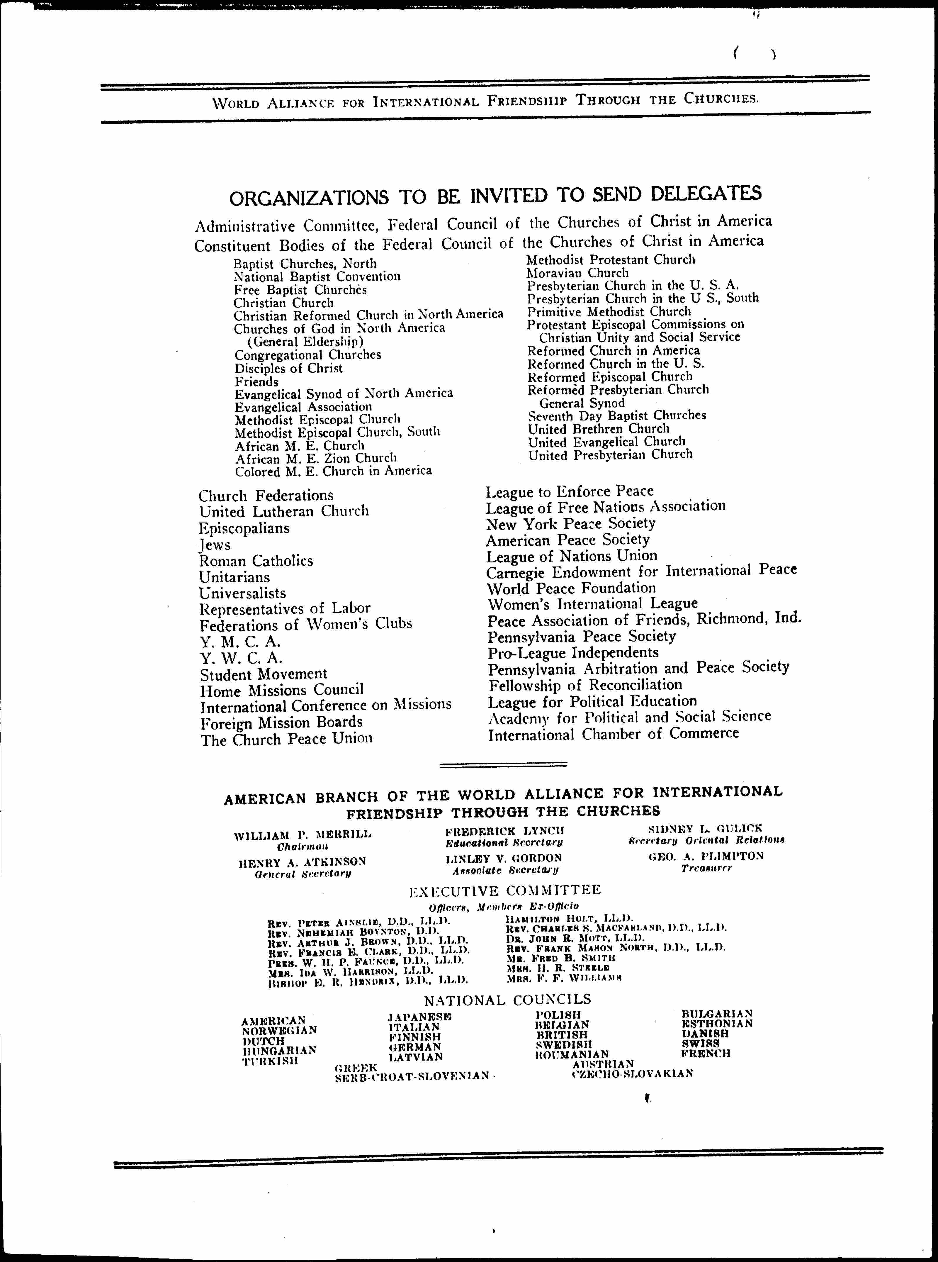 AMERICAN BRANCH OF THE WORLD ALLIANCE FOR INTERNATIONAL FRIENDSHIP THROUGH THE CHURCHES