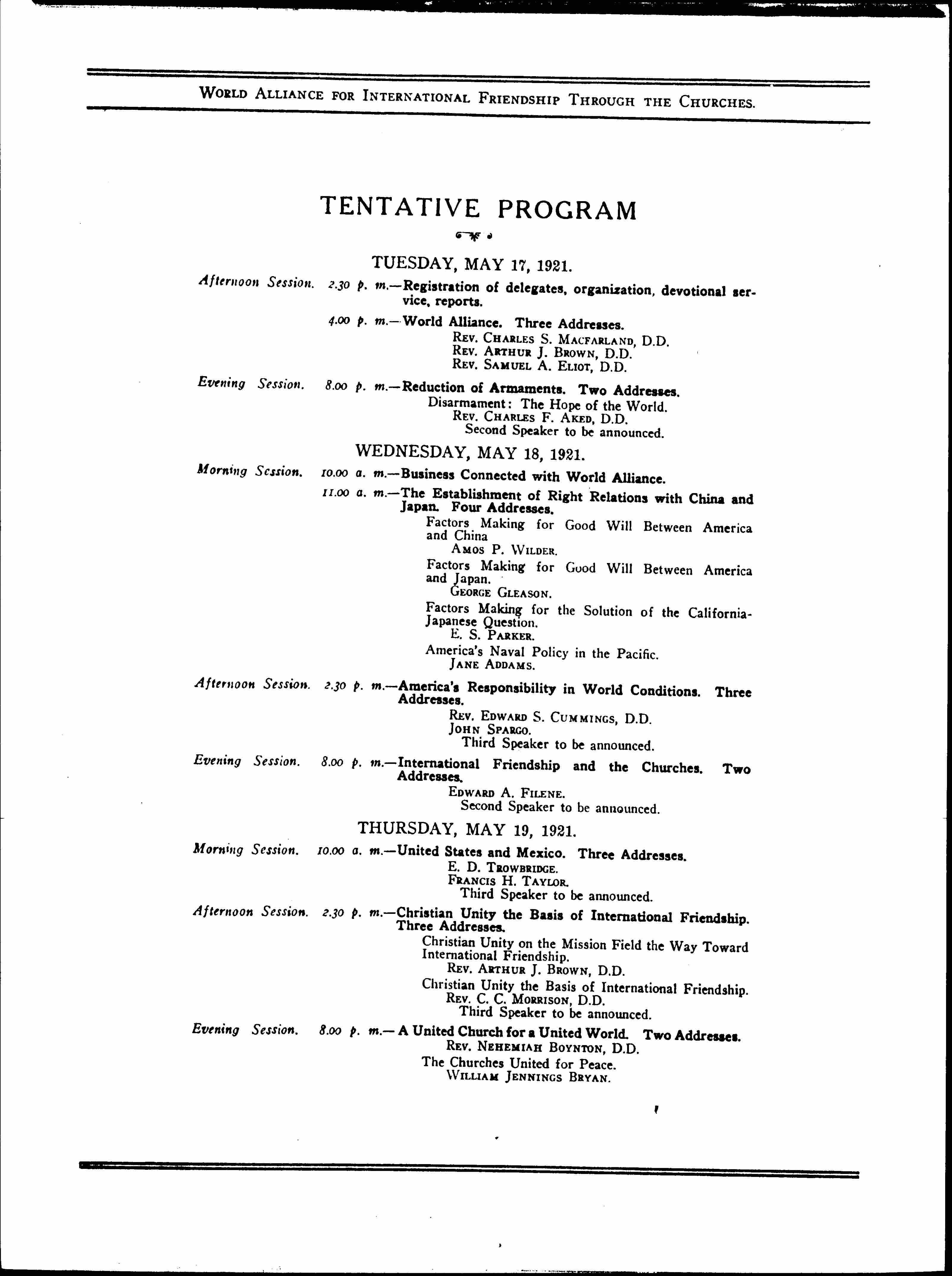Evening Session. 8:00 p.m. -- International Friendship and the Churches. Two Addresses.