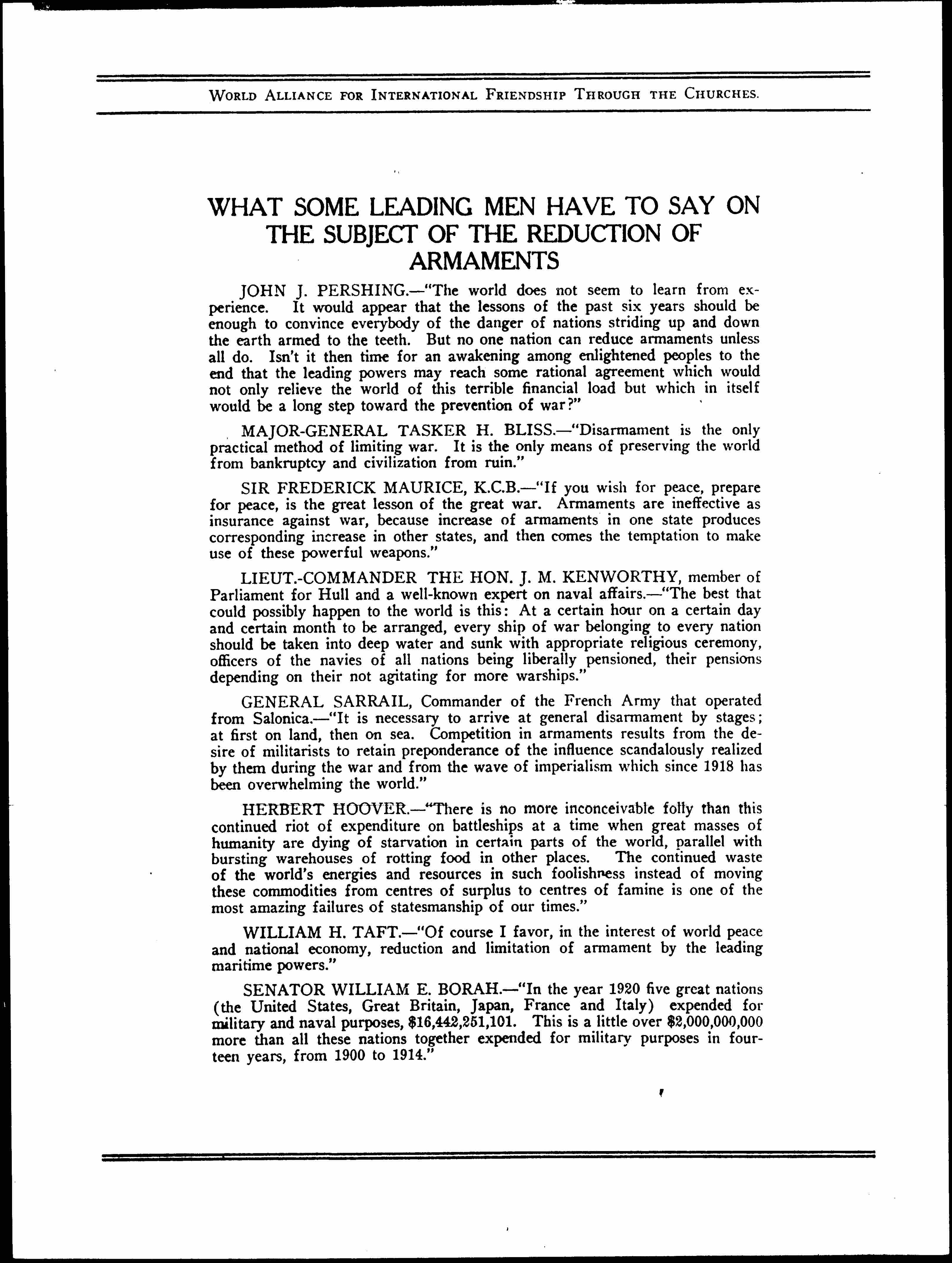 JOHN J. PERSHING. -- "The world does not seem to learn from experience. It would appear that the lessons of the past six years should be enough to convince everybody of the danger of nations striding up and down the earth armed to the teeth. But no one nation can reduce armaments unless all do. Isn't it then time for an awakening among enlightened peoples to the end that the leading powers may reach some agreement which would not only relieve the world of this terrible financial load but which in itself would be a long step toward the prevention of war?"