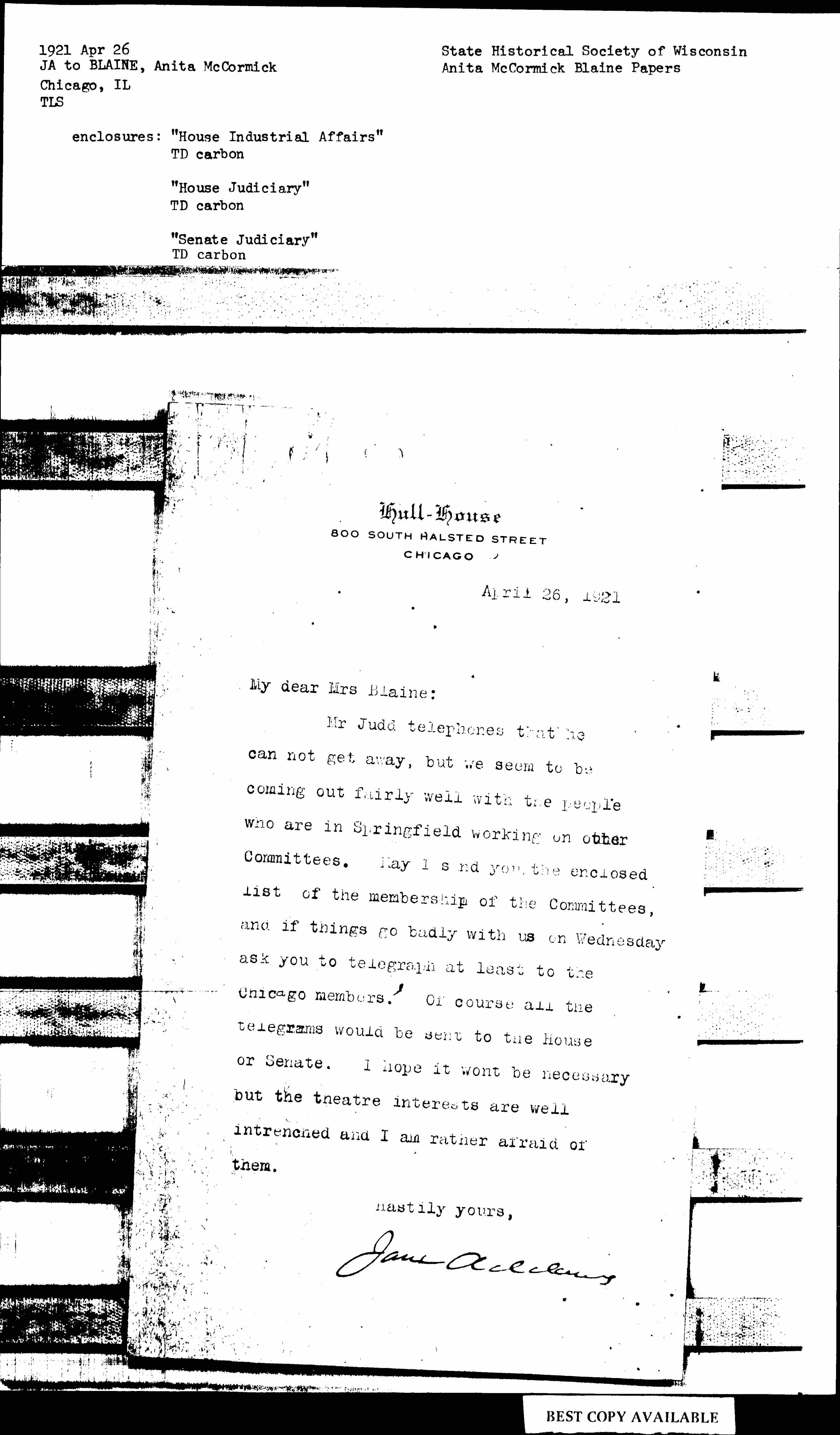 Mr Judd telephones that he can not get away, but we seem to be coming out fairly well with the people who are in Springfield working on other Committees. May I send you the enclosed list of the membership of the Committees, and if things go badly with us on Wednesday ask you to telegraph at least to the Chicago members. Of course all the telegrams would be sent to the House or Senate. I hope it won't be necessary but the [theater] interests are well [entrenched] and I am rather afraid of them.