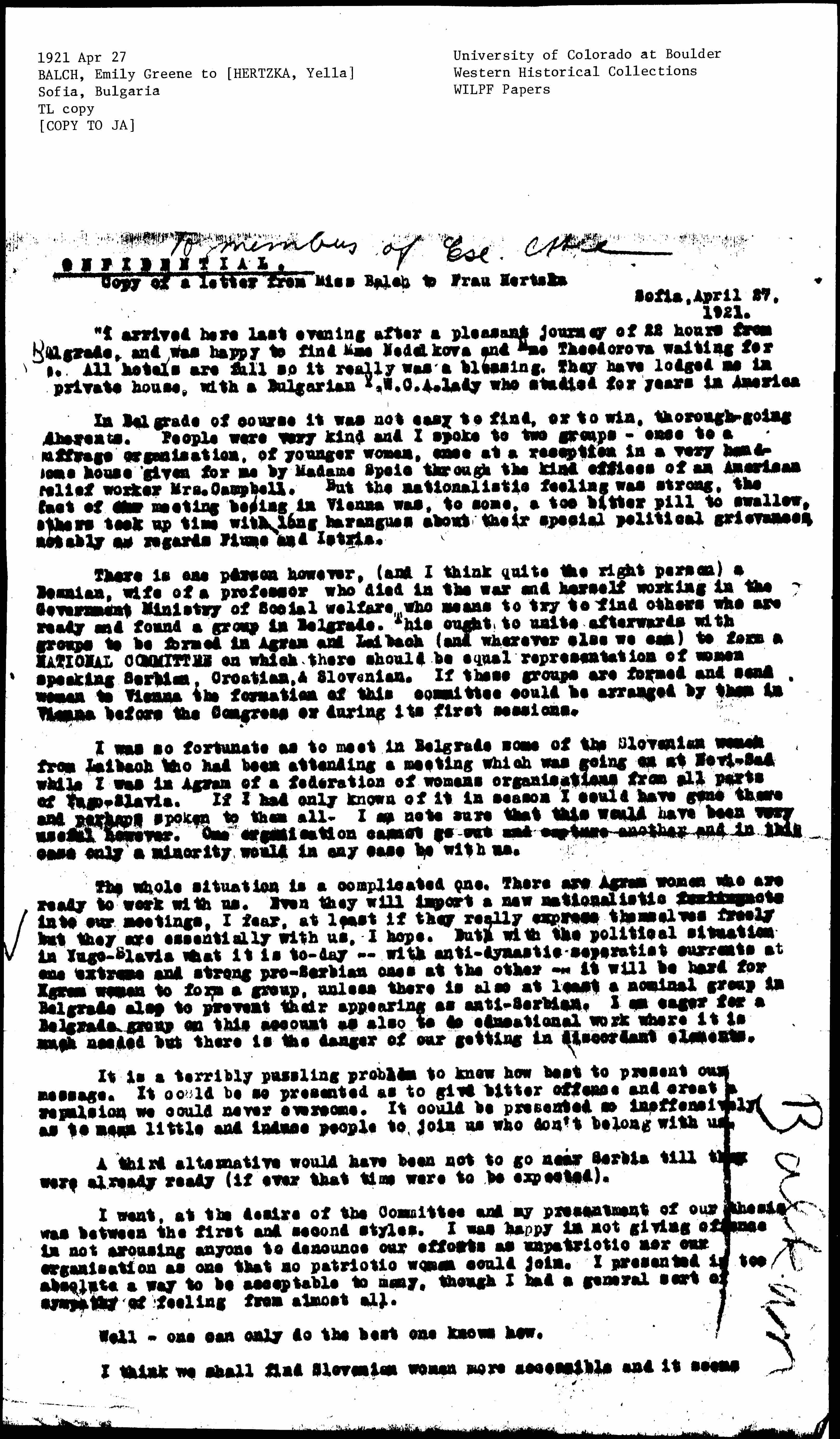 The whole situation is a complicated one. There are Agram women who are ready to work with us. Even they will import new nationalistic [illegible] into our meetings, I fear, at least if they really express themselves freely but they are essentially with us, I hope. But with the political situation in [Yugoslavia] what it is [today] -- with anti-dynastic separatist currents at one extreme and strong pro-Serbian ones at the other -- it will be hard for Agram women to form a group, unless there is also at least a nominal group in Belgrade also to prevent their appearing anti-Serbian. I am eager for a Belgrade group on this account as also to do educational work where it is much needed but there is the danger of our getting in discordant elements.