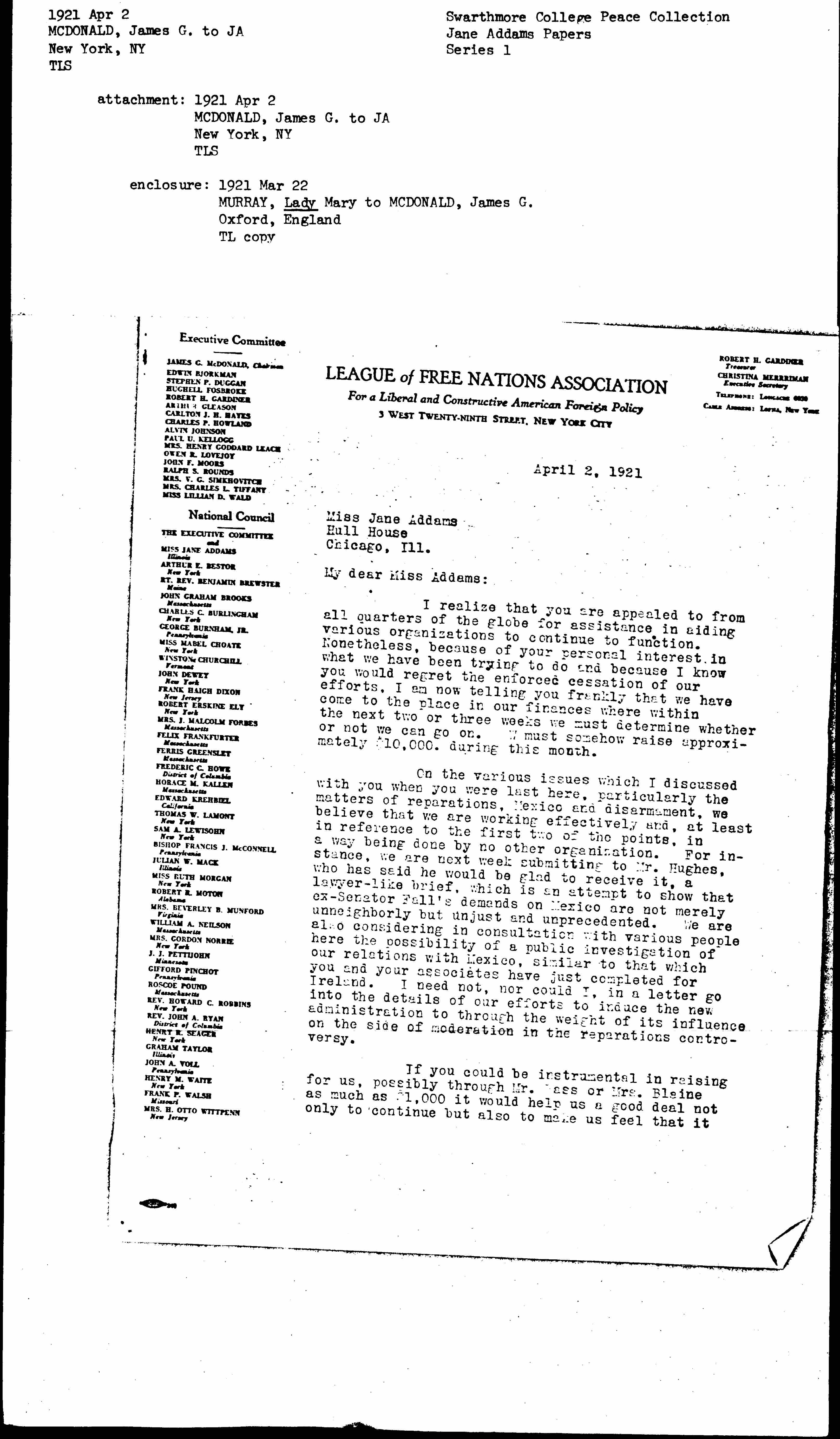 I realize that you are appealed to from all quarters of the globe for assistance in aiding various organizations to continue to function. Nonetheless, because of your personal interest in what we have been trying to do and because I know you would regret the enforced cessation of our efforts, I am now telling you frankly that we have come to the place in our finances where within the next two or three weeks we must determine whether or not we can go on. [We] must somehow raise approximately $10,000 during this month.