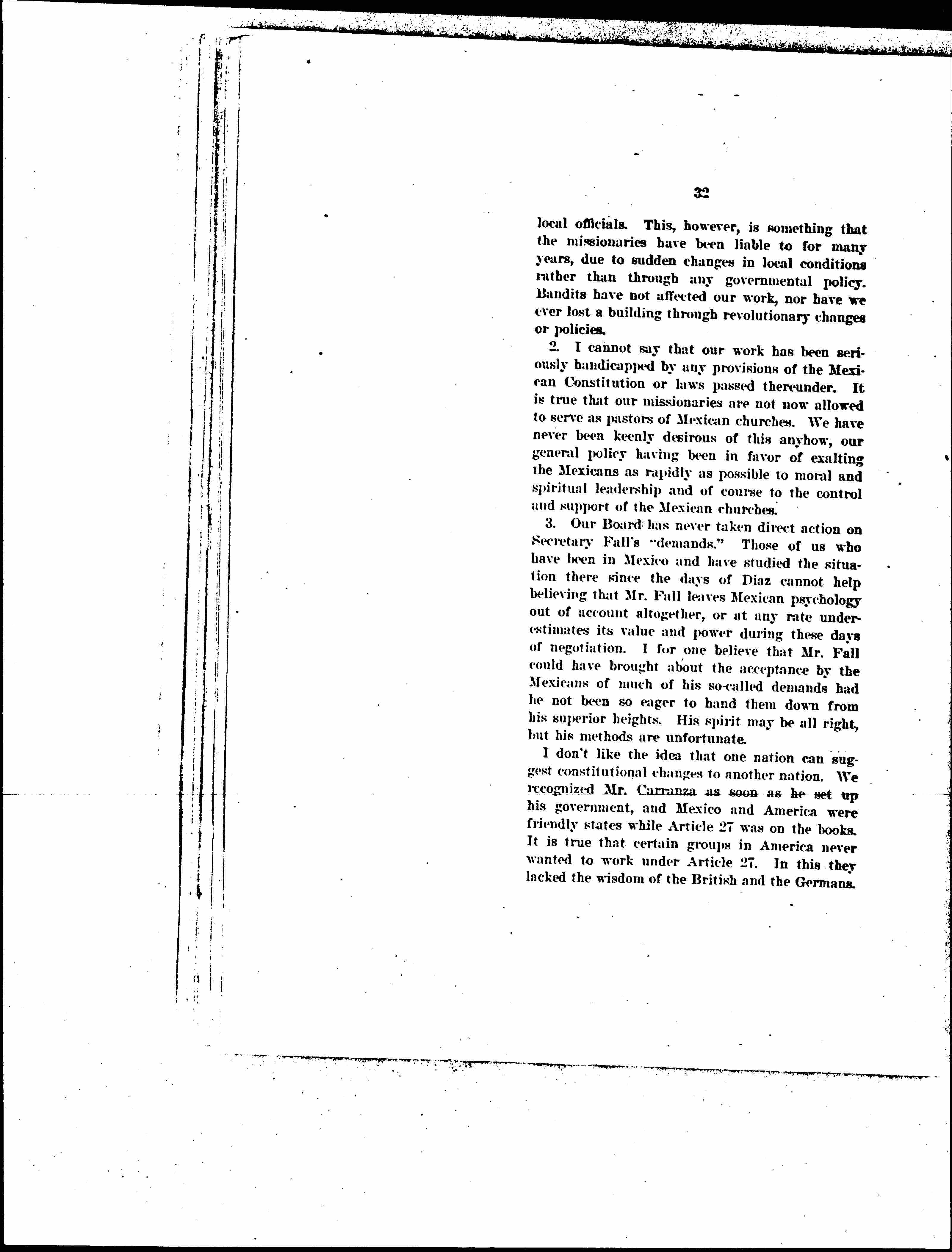 I don't like the idea that one nation can suggest constitutional changes to another nation. We recognized Mr. Carranza as soon as he set up his government, and Mexico and America were friendly states while Article 27 was on the books. It is true that certain groups in America never wanted to work under Article 27. In this they lacked the wisdom of the British and the Germans. [page 34] At the same time, I don't think that our own government would ever be justified in demanding that the Constitution of Mexico be changed to suit our tastes, I can say this without being at all enthusiastic over the Article.