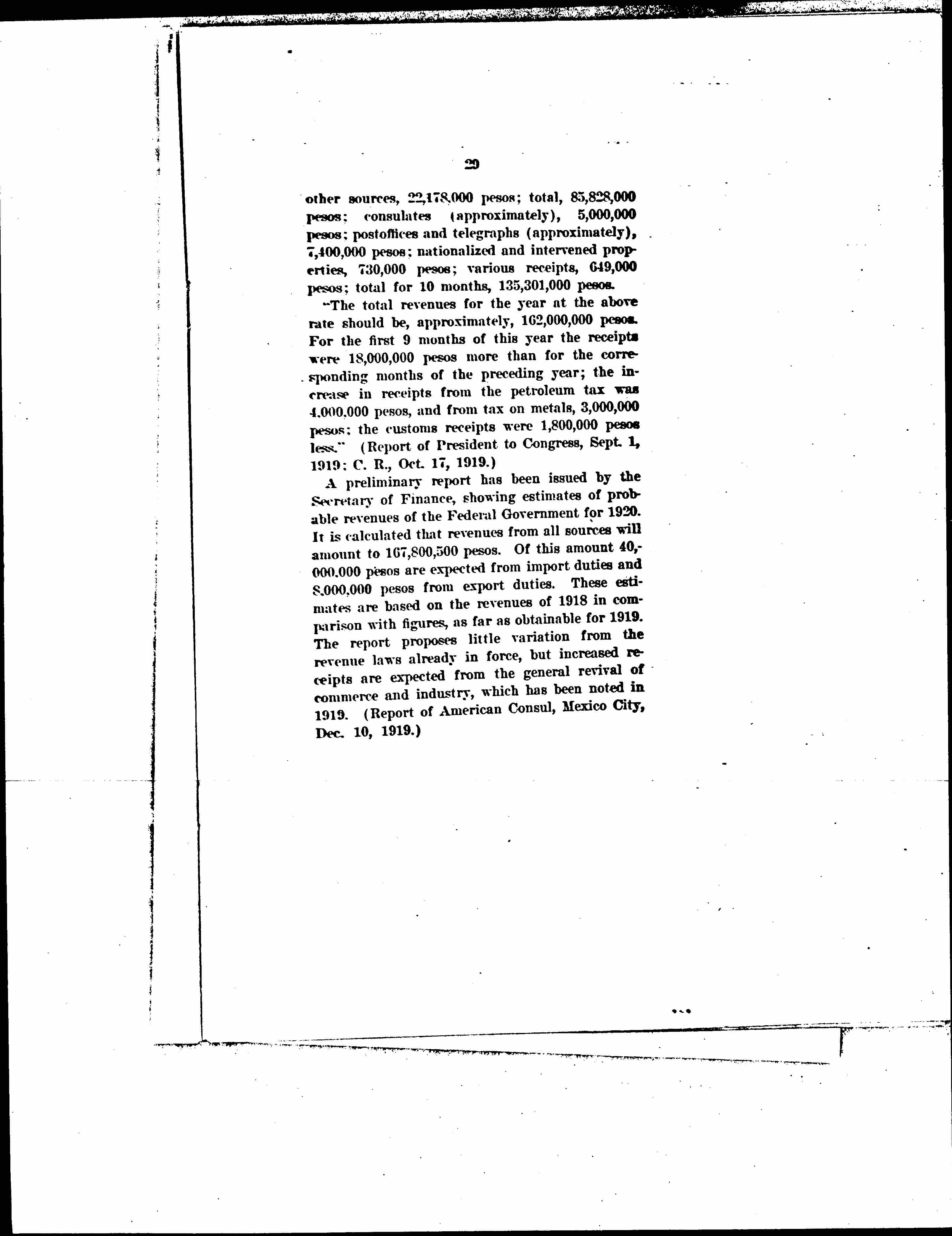 A preliminary report has been issued by the Secretary of Finance, showing estimates of probable revenues of the Federal Government for 1920. It is calculated that revenues from all sources will amount to 167,800,500 pesos. Of this amount 40,000,000 pesos are expected from import duties and 8,000,000 pesos from export duties. These estimates are based on the revenues of 1918 in comparison with figures, as far as obtainable for 1919. The report proposes little variation from the revenue laws already in force, but increased receipts are expected from the general revival of commerce and industry, which has been noted in 1919. (Report of American Consul, Mexico City, Dec. 10, 1919.) [page 31]