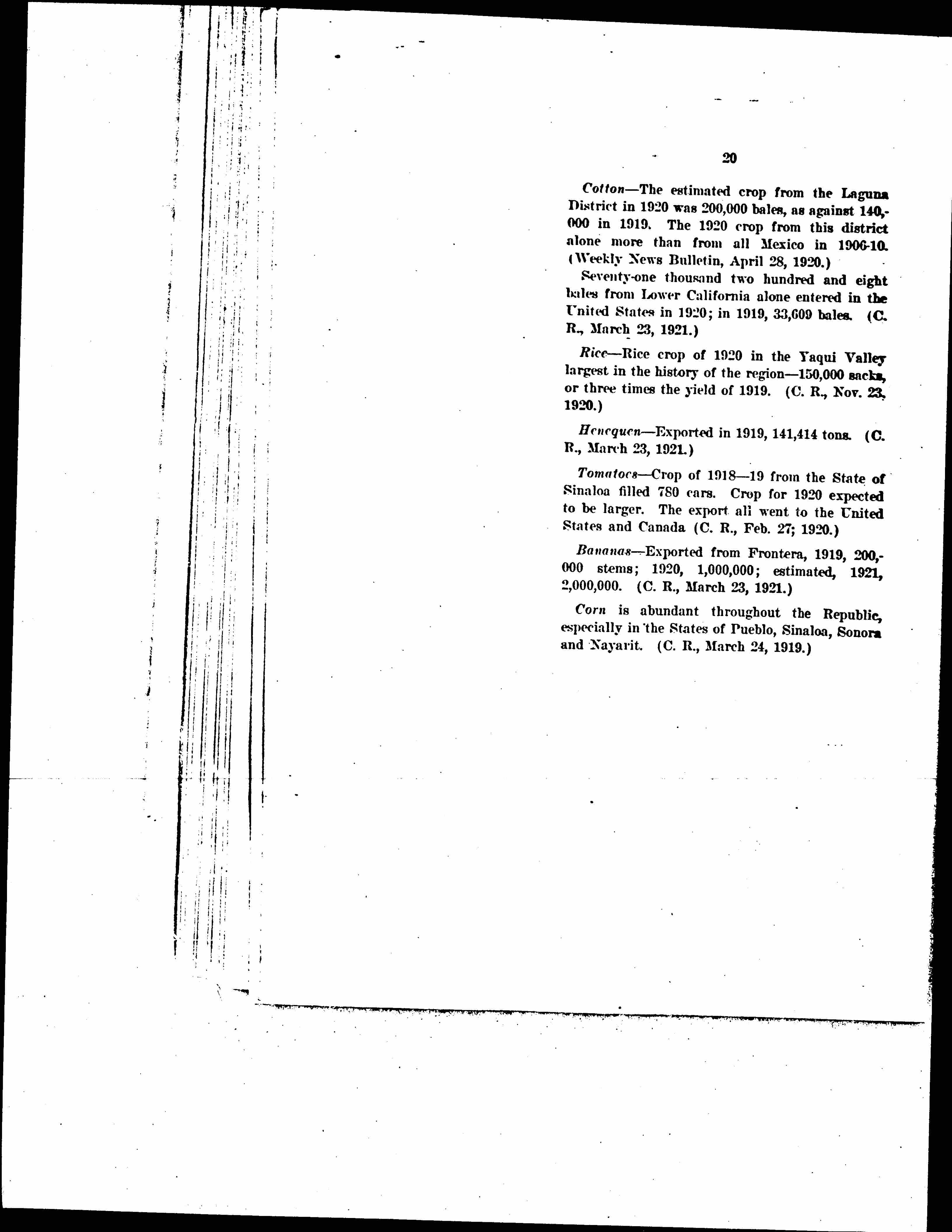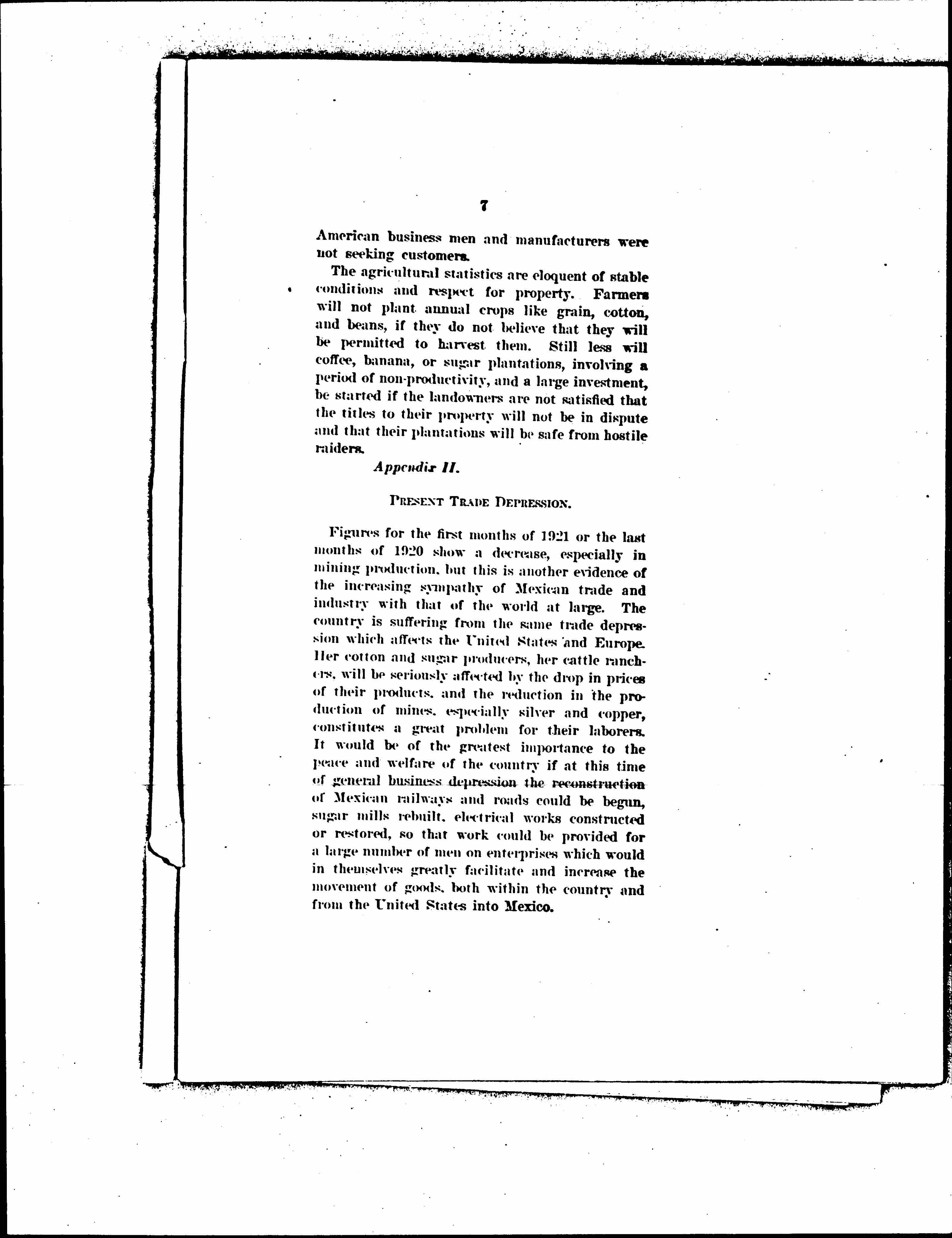 Figures for the first months of 1921 of the last months of 1920 show a decrease, especially in mining production, but this is another evidence of the increasing sympathy of Mexican trade and industry with that of the world at large. The country is suffering from the same trade depression which affects the United States and Europe. Her cotton and sugar producers, her cattle ranchers, will be seriously affected by the drop in prices of their products, and the reduction in the production of mines, especially silver and copper, constitutes a great problem for their laborers. It would be of the greatest importance to the peace and welfare of the country if at this time of general business depression the reconstruction of Mexican railways and roads could be begun, sugar mills rebuilt, electrical works constructed or restored, so that work could be provided for a large number of men on enterprises which would in themselves greatly facilitate and increase the movement of goods, both within the country and from the United States into Mexico. [page 9]
