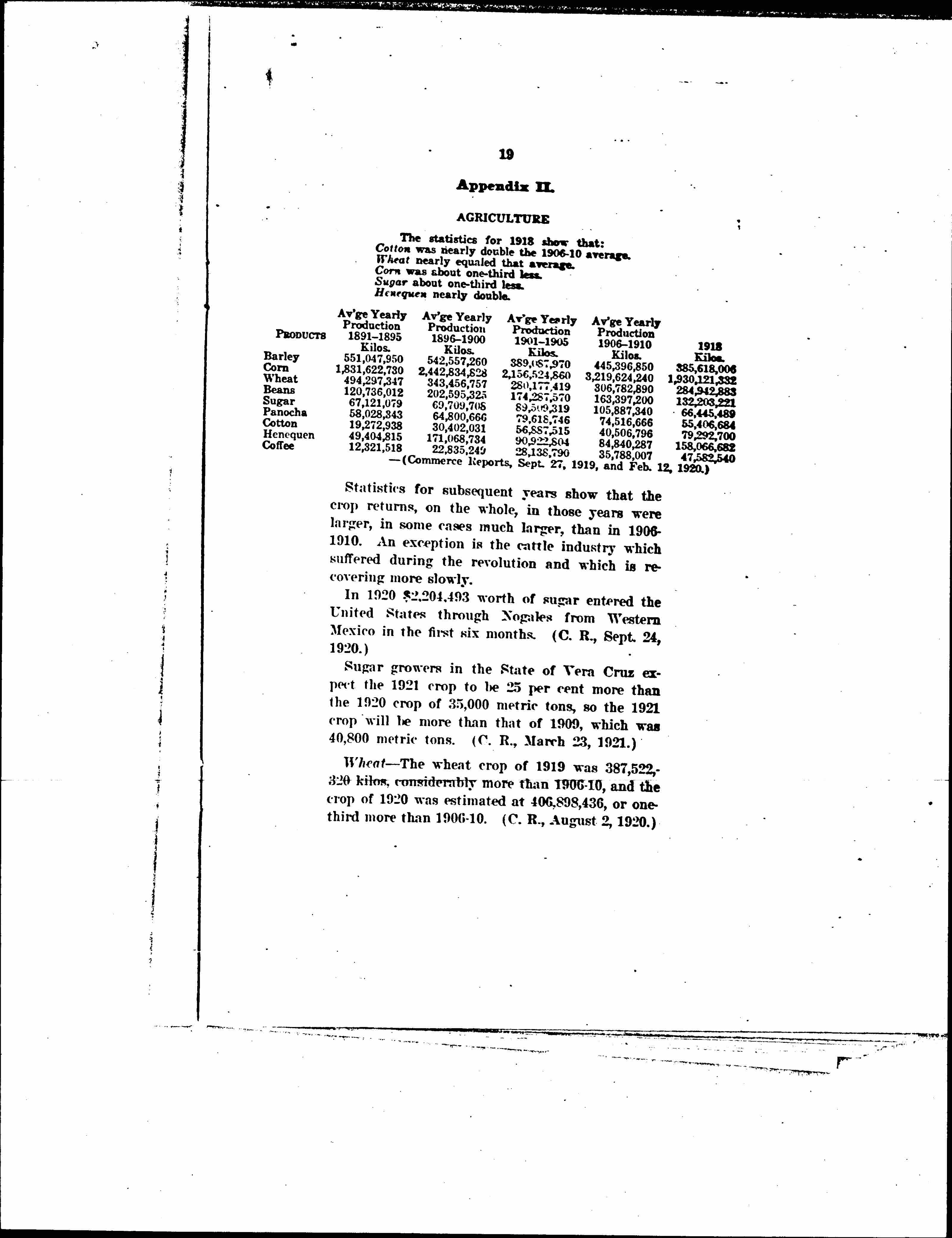 2. The farmer is largely increasing his production, and new agricultural enterprises are beginning. The result is that Mexican cotton mills, for example, are being amply supplied by Mexican-grown cotton, leaving surplus for export; Mexican sugar and other products are being exported, and there is no lack of food grown in the country. The evidence is contained in (a) figures as to production; (b) export figures.