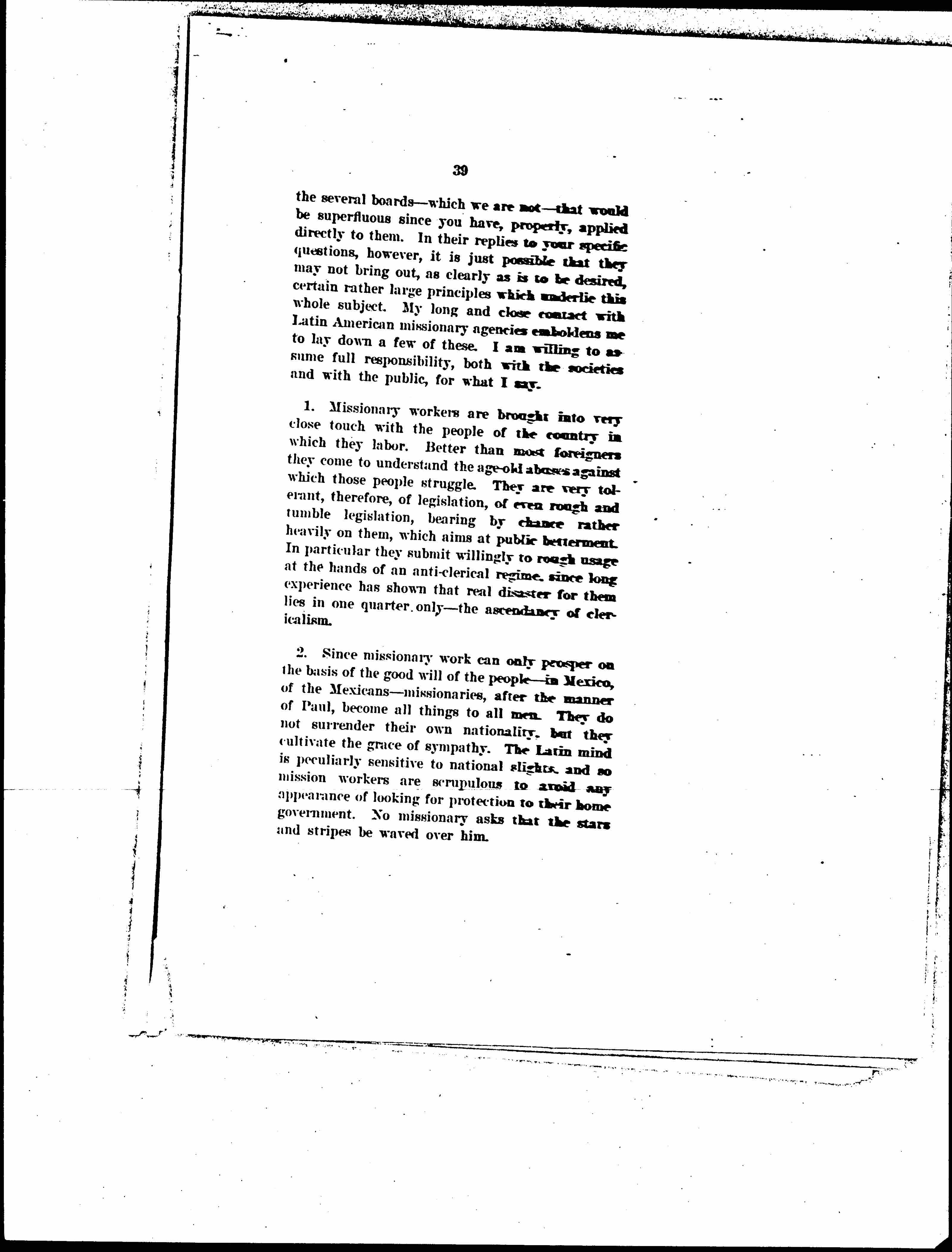 1. Missionary workers are brought into very close touch with the people of the country in which they labor. Better than most foreigners they come to understand the age-old abuses against which these people struggle. They are very tolerant, therefore, of legislation, of even rough and tumble legislation, bearing by chance rather heavily on them, which aims at public betterment. In particular they submit willingly to rough usage at the hands of an anti-clerical regime, since long experience has shown that real disaster for them lies in one quarter only -- the ascendancy of clericalism.