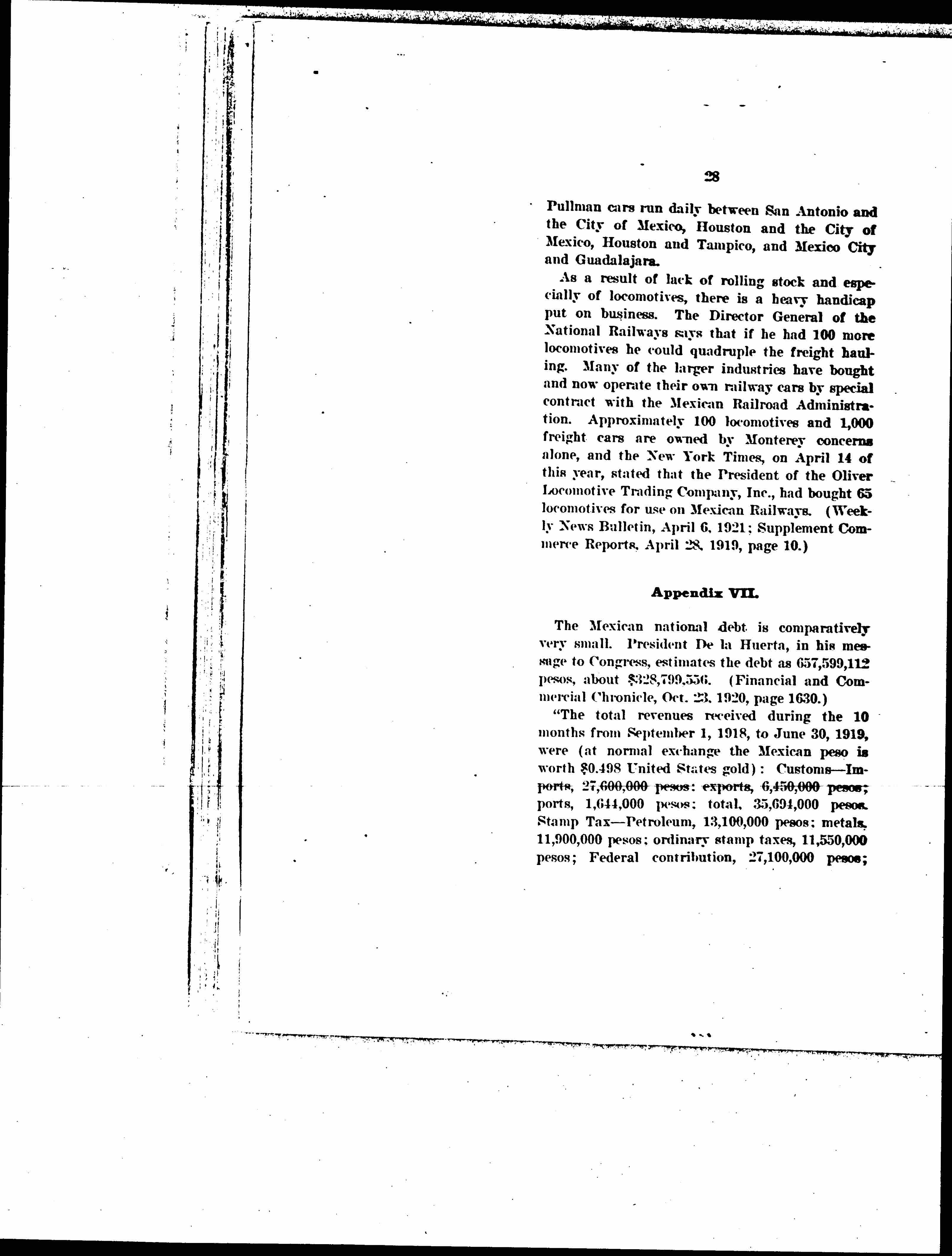 "The total revenues received during the 10 months from September 1, 1918, to June 30, 1919, were (at normal exchange the Mexican peso is worth $0.498 United States gold); Customs -- Imports, 27,600,000 pesos; exports, 6,450,000 pesos; ports, 1,644,000 pesos; total, 35,694,000 pesos. Stamp Tax -- Petroleum, 13,100,000 pesos; metals, 11,900,000 pesos; ordinary stamp taxes, 11,550,000 pesos; Federal contribution, 27,100,000 pesos; [page 30] other sources, 22,178,000 pesos; total, 85,828,000 pesos; consulates (approximately), 5,000,000 pesos; post offices and telegraphs (approximately), 7,400,000 pesos; nationalized and intervened properties, 730,000 pesos; various receipts, 649,000 pesos; total for 10 months, 135,301,000 pesos.