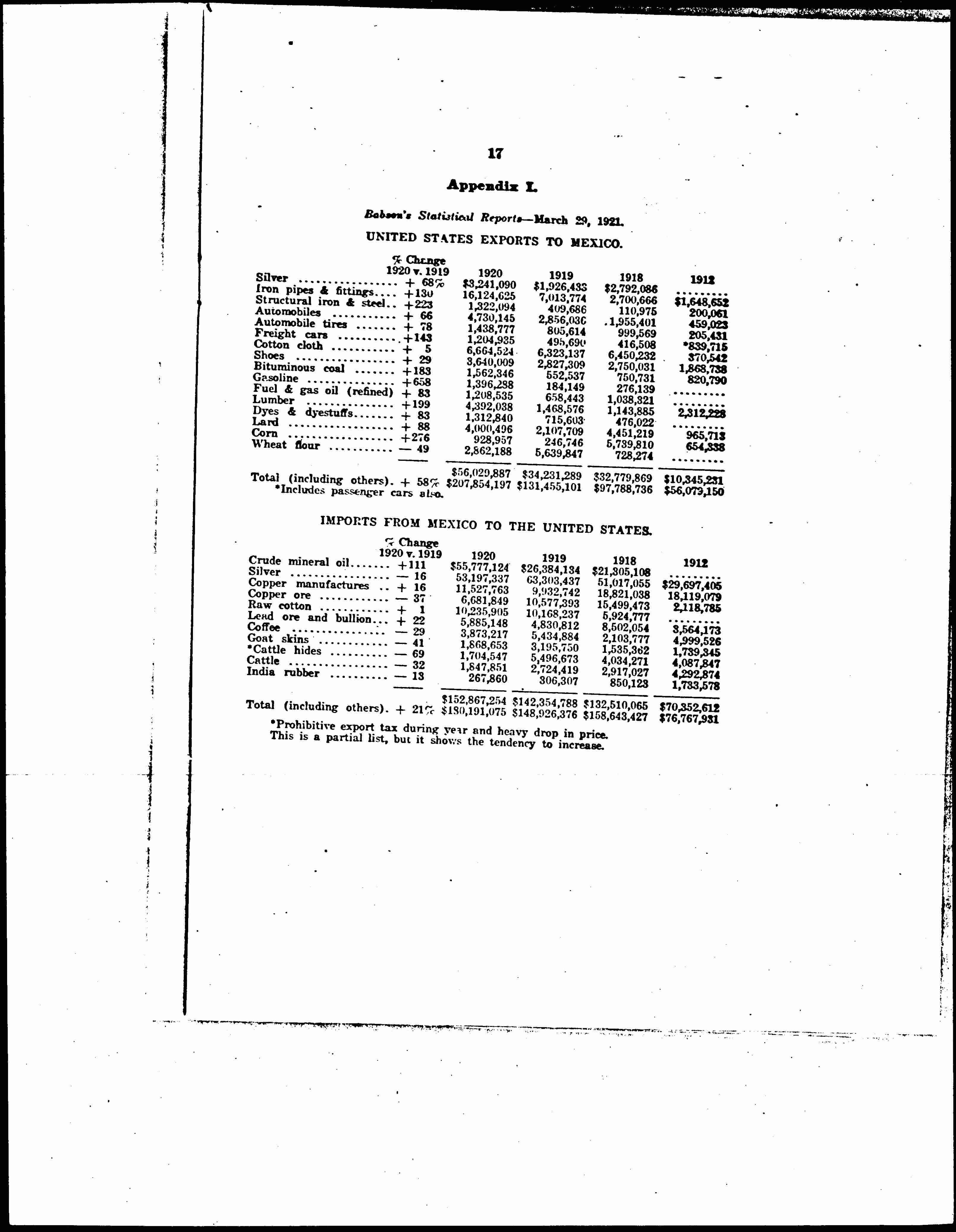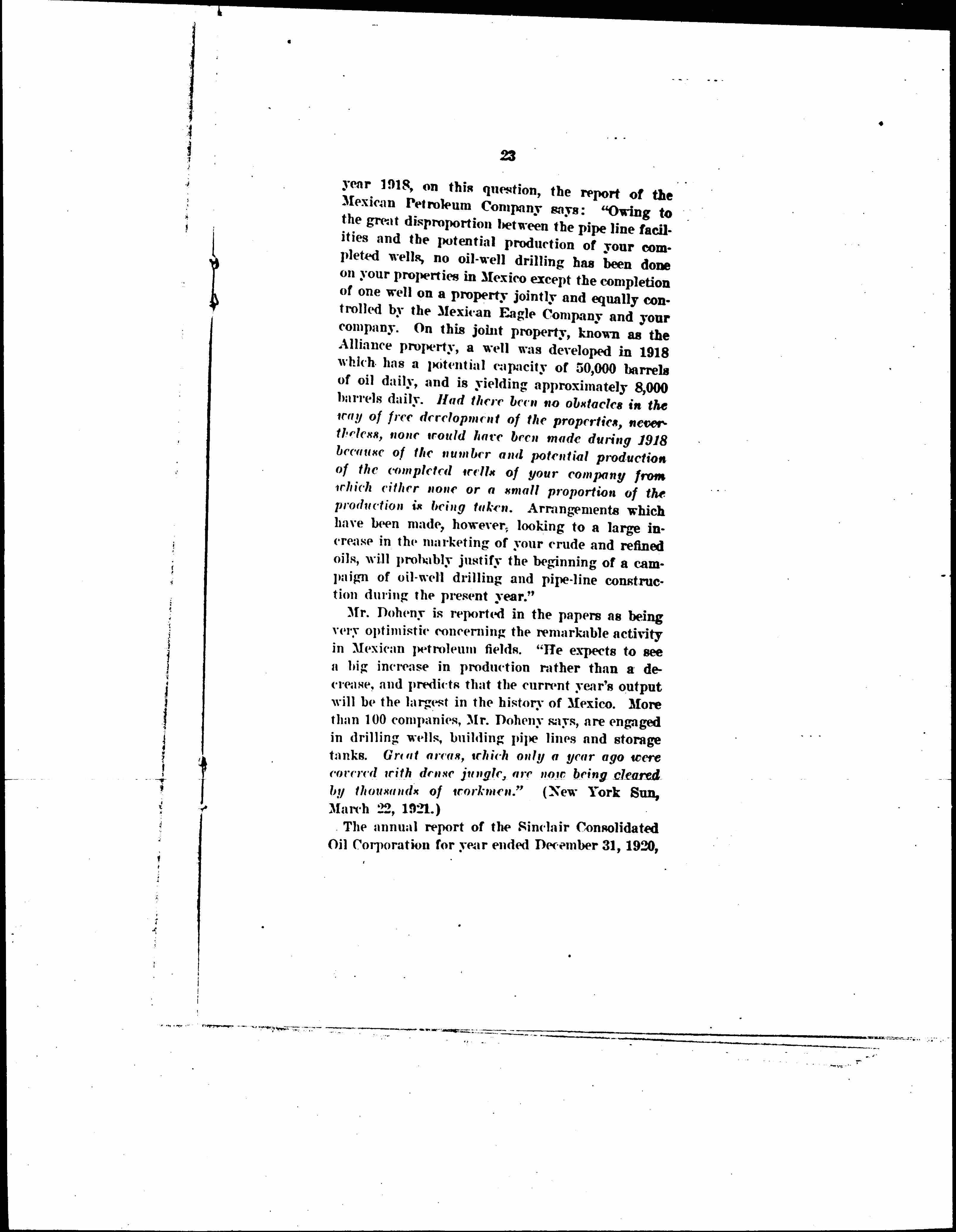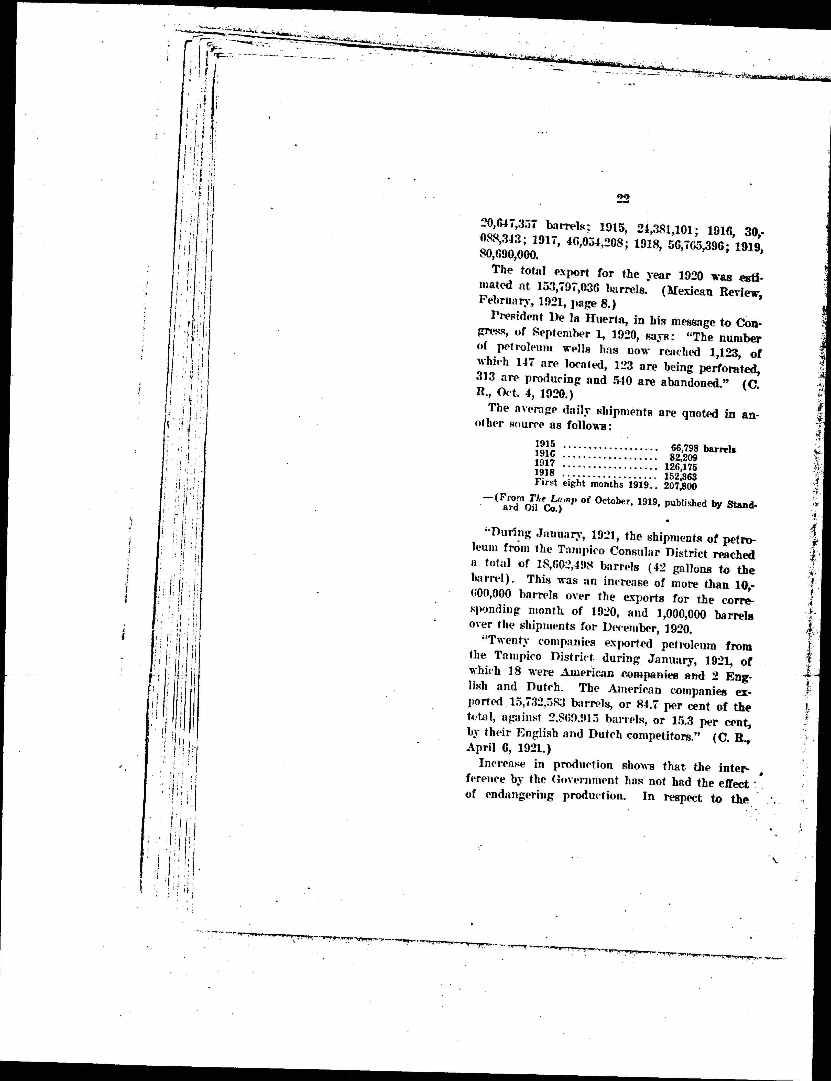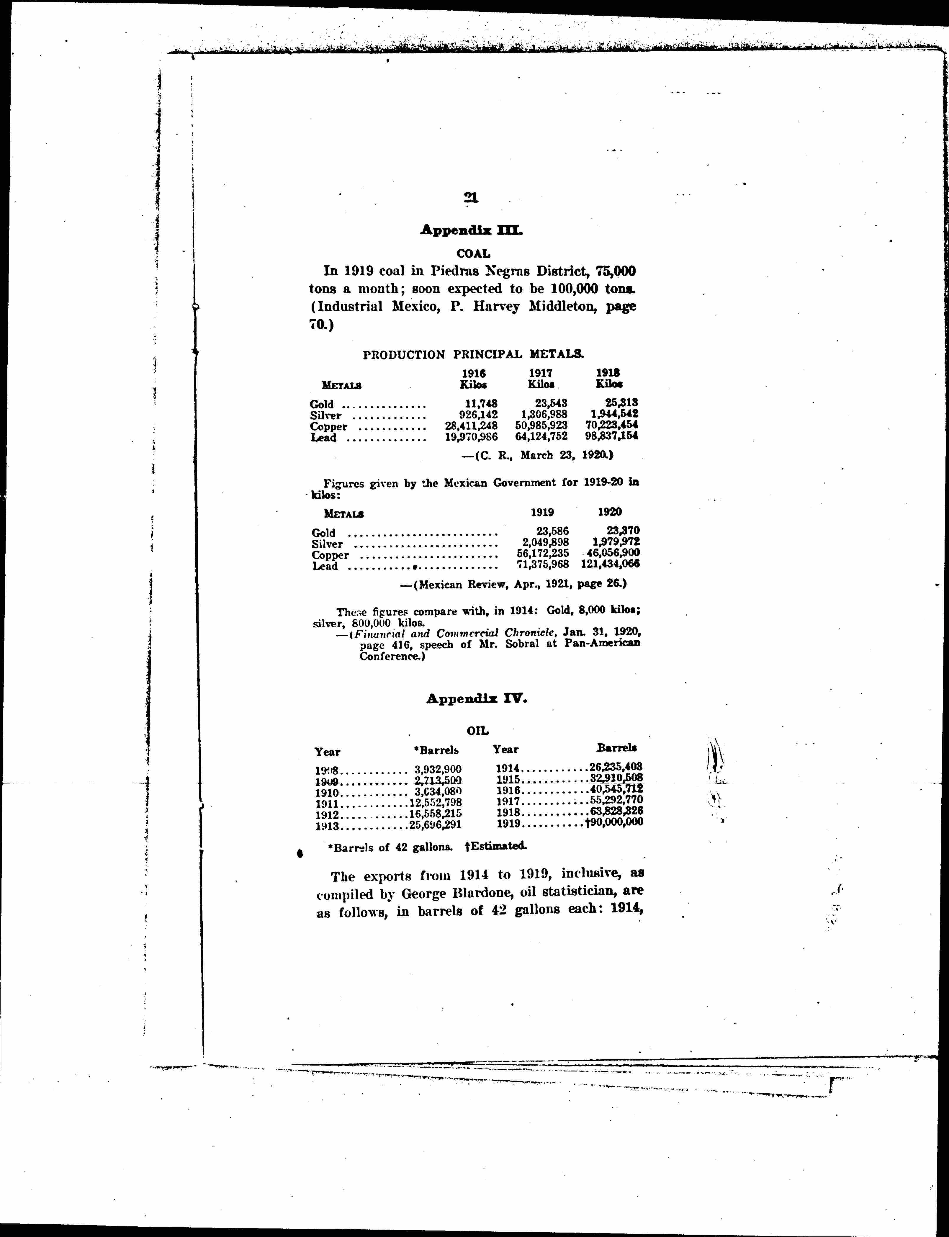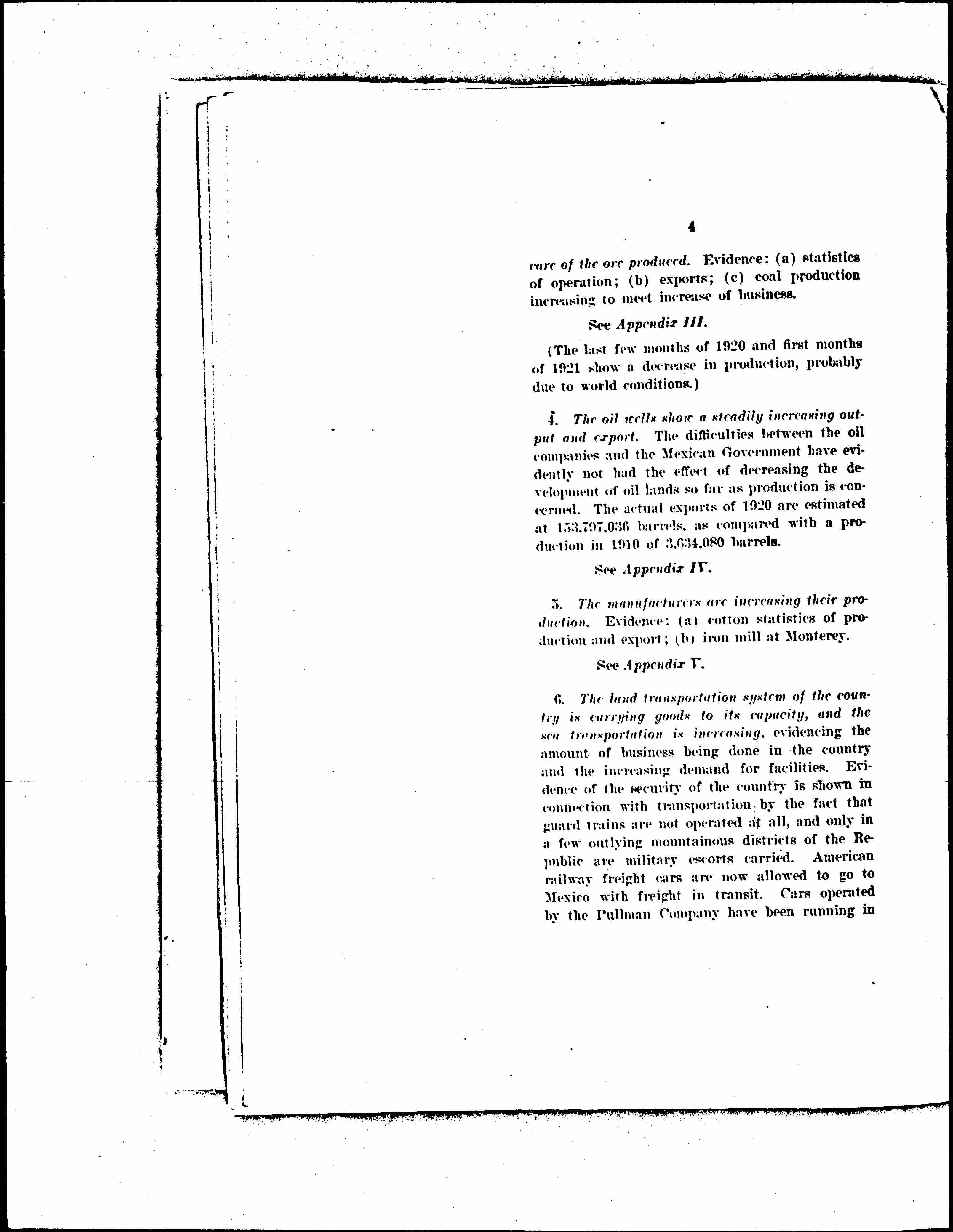 4. The oil wells show a steadily increasing output and export. The difficulties between the oil companies and the Mexican Government have evidently not had the effect of decreasing the development of oil lands so far as production is concerned. The actual exports of 1920 are estimated at 153,797,036 barrels, as compared with a production in 1910 of 3,634,080 barrels.