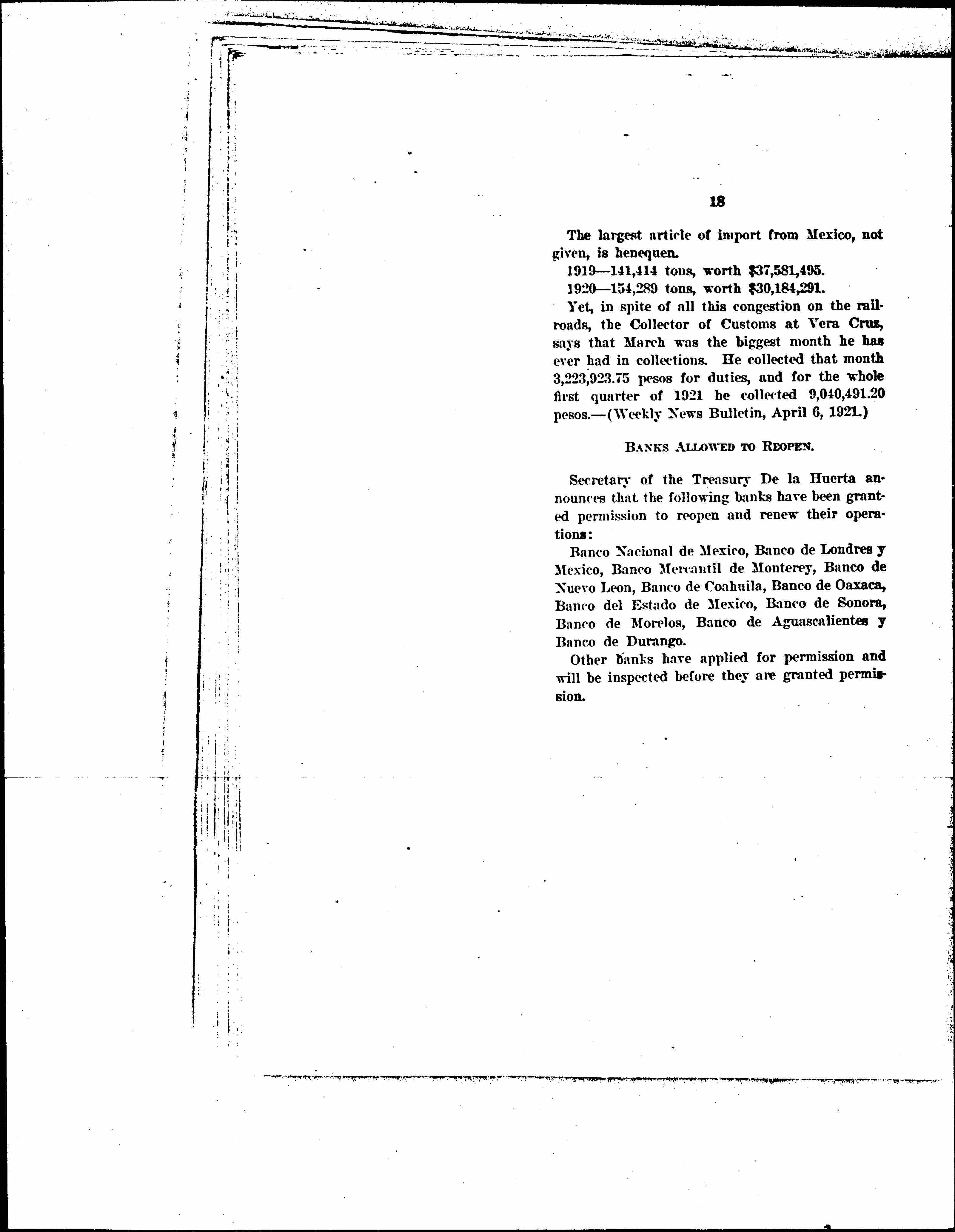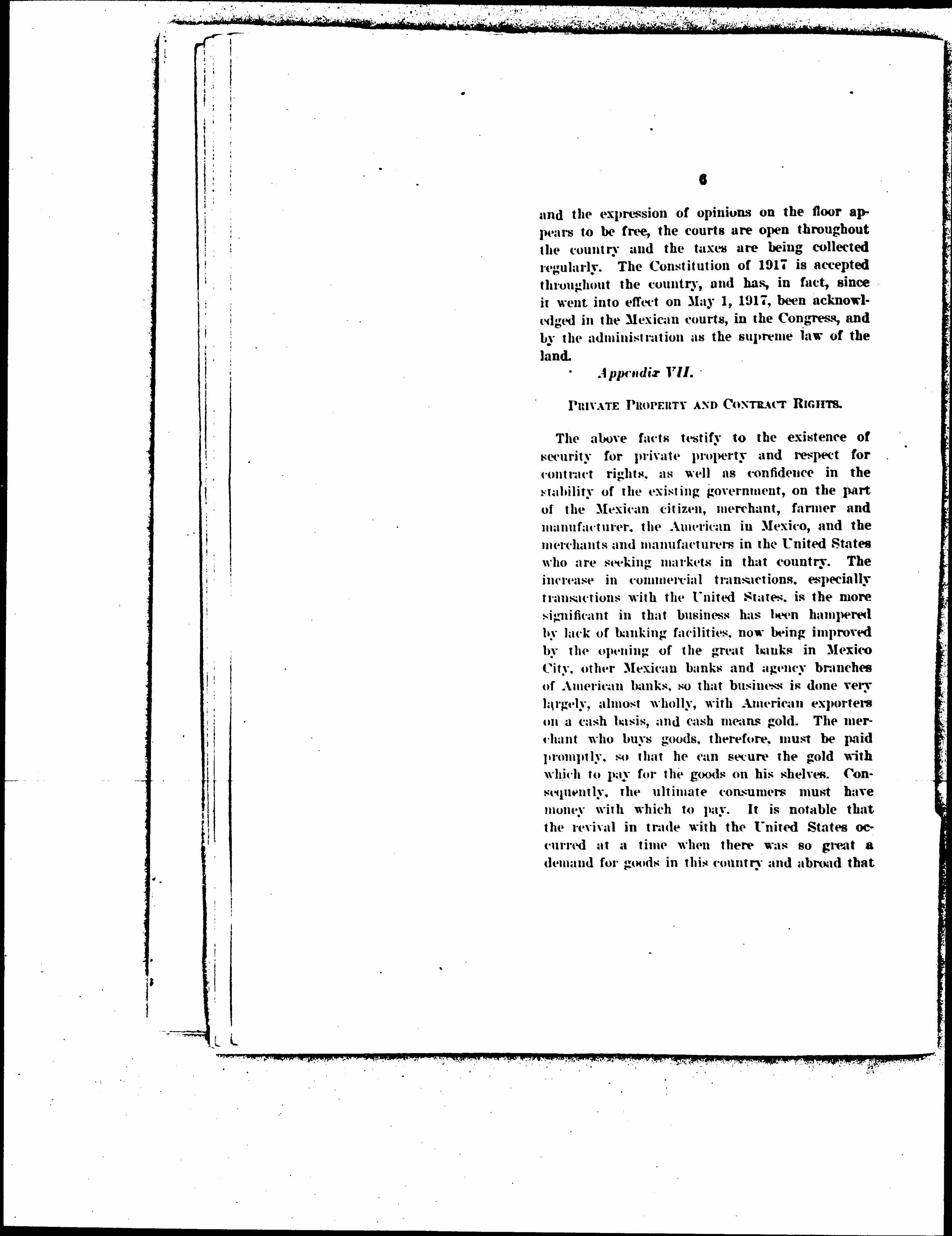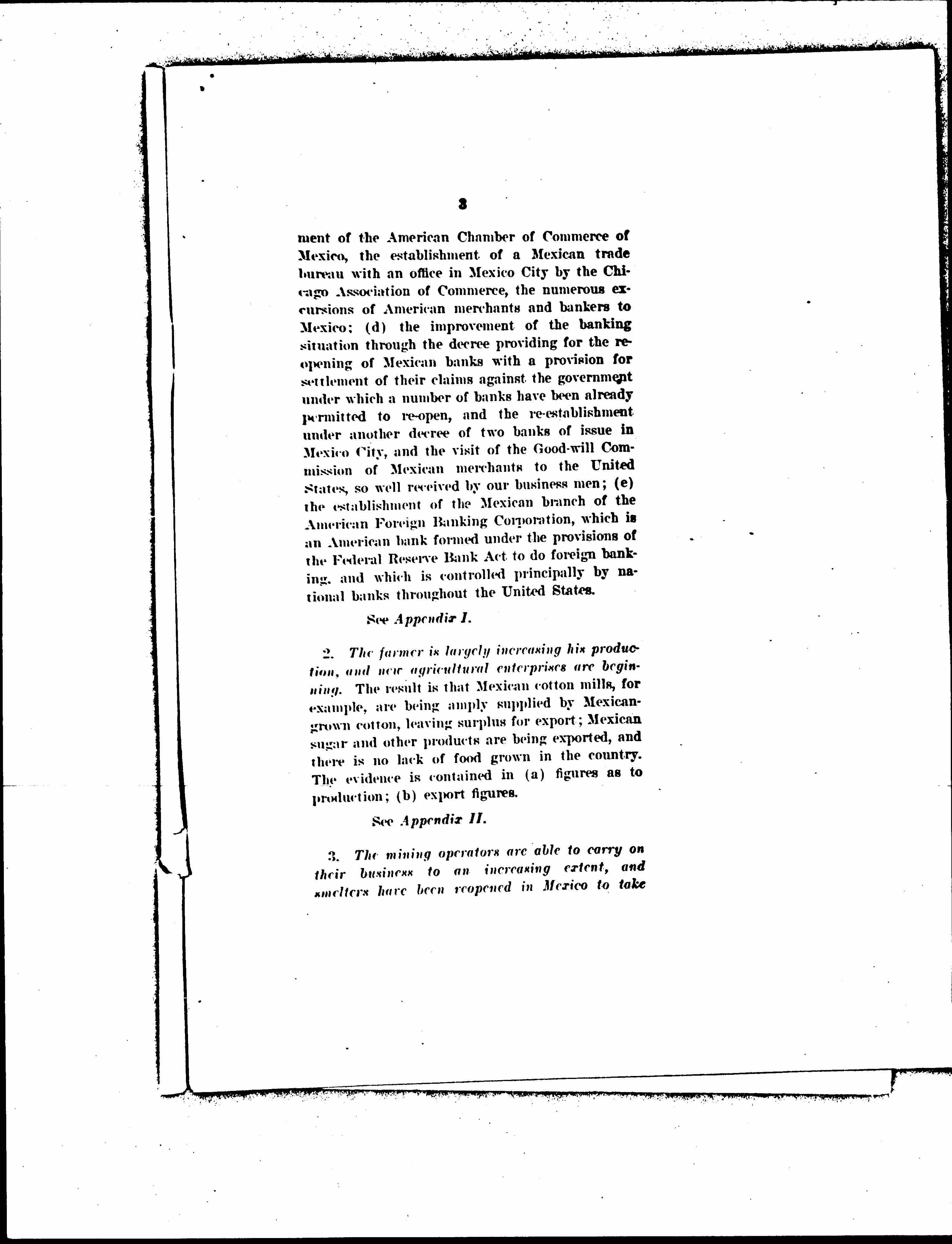 1. The merchant is able to carry on his business to an ever-increasing extent, as is shown by: (a) the increasing exports and imports; (b) the steady and increasing tax payments from the tax on business transactions, the stamp tax; (c) the increasing interest in trade relations with Mexico shown by American merchants, the [reestablishment] [page 4] of the American Chamber of Commerce of Mexico, the establishment of a Mexican trade bureau with an office in Mexico City by the Chicago Association of Commerce, the numerous excursions of American merchants and bankers to Mexico; (d) the improvement of the banking situation through the decree providing for the reopening of Mexican banks with a provision for settlement of their claims against the government under which a number of banks have been already permitted to [reopen], and the [reestablishment] under another decree of two banks of issue in Mexico City, and the visit of the Good-will Commission of Mexican merchants to the United States, so well received by our business men; (e) the establishment of the Mexican branch of the American Foreign Banking Corporation, which is an American bank formed under the provisions of the Federal Reserve Bank Act to do foreign banking, and which is controlled principally by national banks throughout the United States.