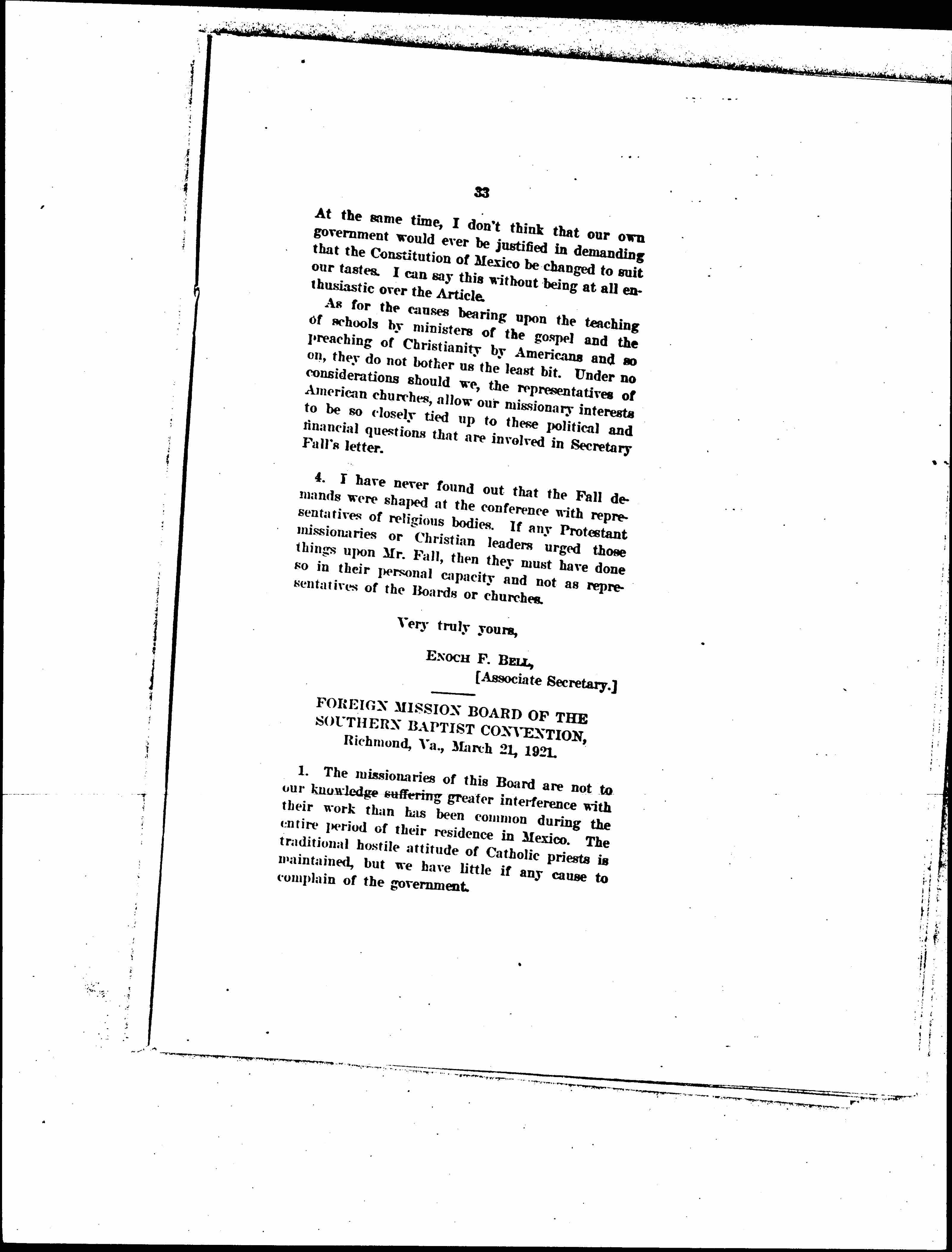 1. So far as I have been able to ascertain our missionaries in Mexico do not suffer any disabilities or persecution in Mexico either from the government or from [nongovernmental] sources. They have been greatly inconvenienced during the revolutionary period, but they never have made any complaint, unless it be one missionary living in Sonora, who reported a short time ago that a heavy tax on his salary was being made by the [page 33] local officials. This, however, is something that the missionaries have been liable to for many years, due to sudden changes in local conditions rather than through any governmental policy. Bandits have not affected our work, nor have we ever lost a building through revolutionary changes or policies.