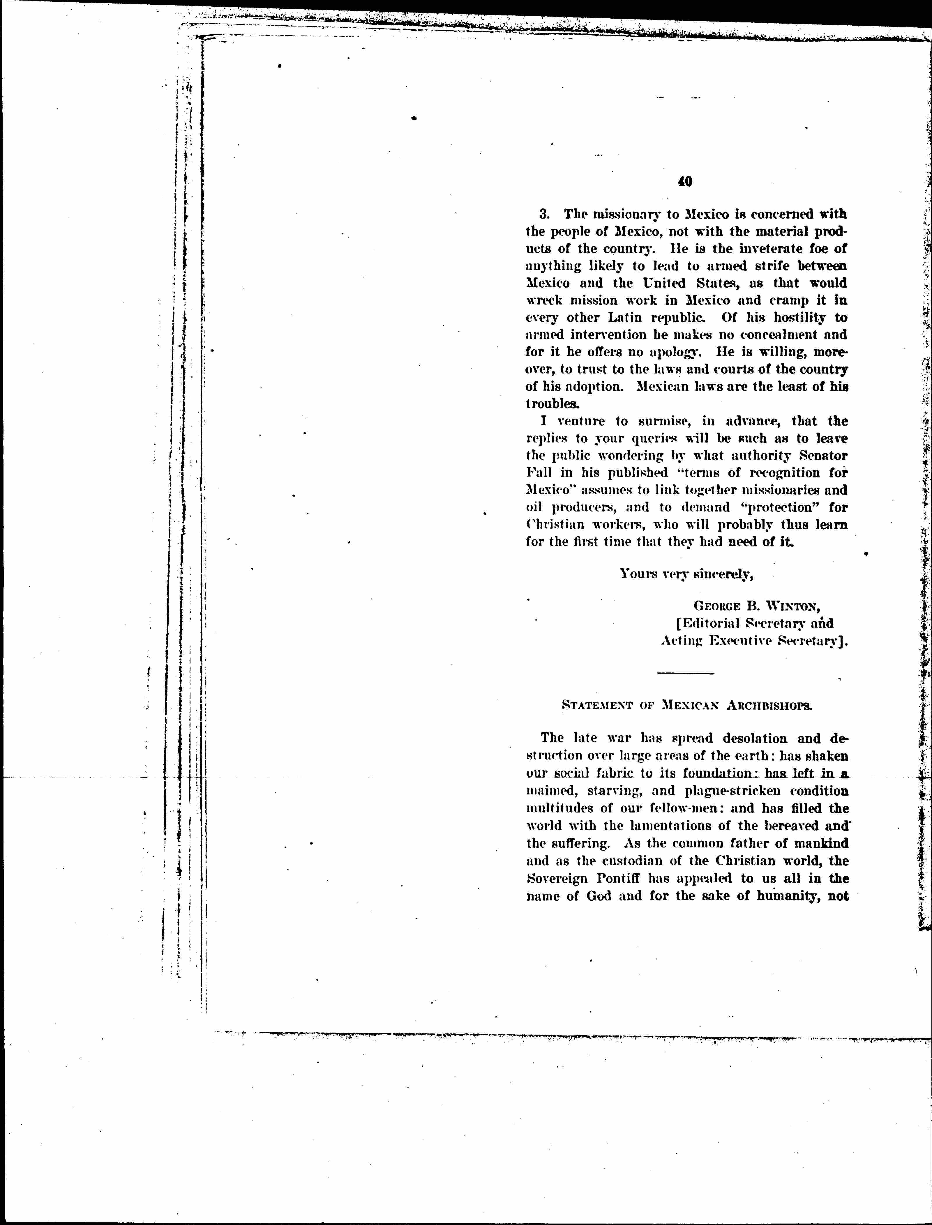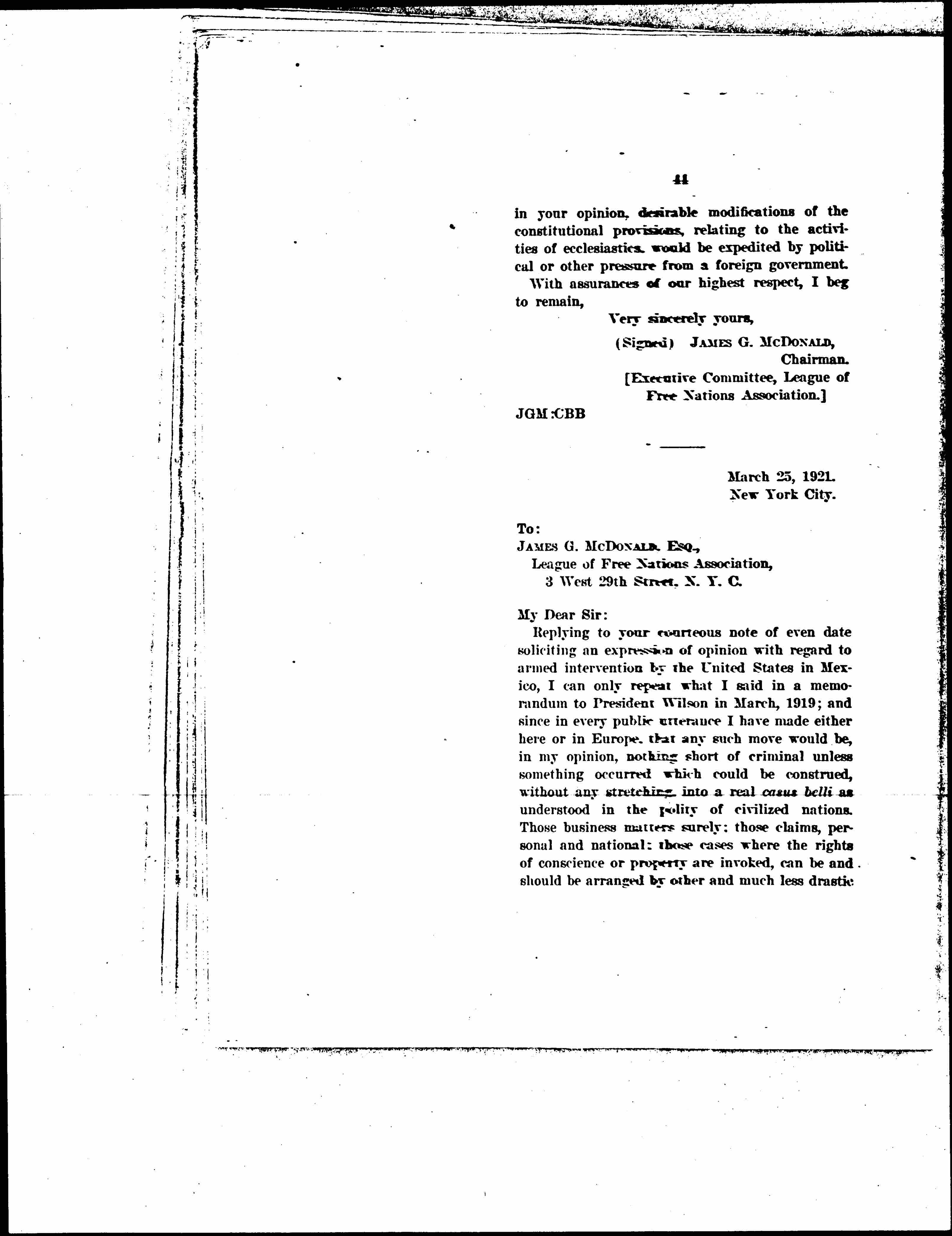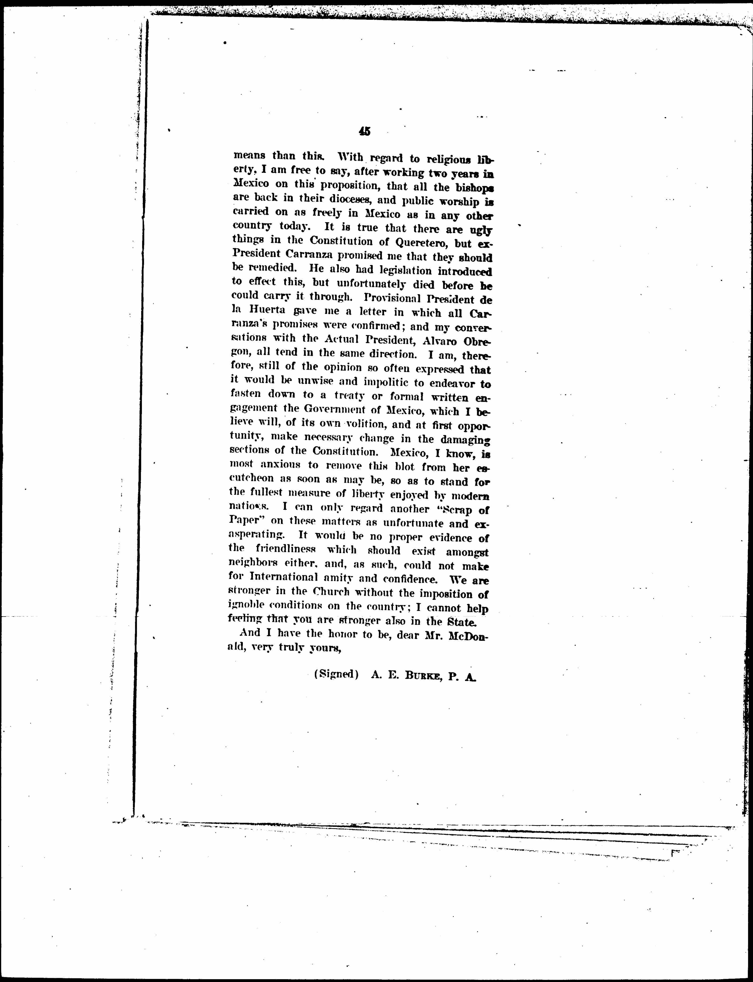 Replying to your courteous note of even date soliciting an expression of opinion with regard to armed intervention by the United States in Mexico, I can only repeat what I said in a memorandum to President Wilson in March, 1919; and since in every public utterance I have made either here or in Europe, that any such move would be, in my opinion, nothing short of criminal unless something occurred which could be construed, without any stretching, into a real casus belli as understood in the polity of civilized nations. Those business matters surely; those claims, personal and national; those cases where the rights of conscience or property are invoked, can be and should be arranged by other and much less drastic [page 46] means than this. With regard to religious liberty, I am free to say, after working two years in Mexico on this proposition, that all the bishops are back in their dioceses, and public worship is carried on as freely in Mexico as in any other country today. It is true that there are ugly things in the Constitution of Querétaro, but ex-President Carranza promised me that they should be remedied. He also had legislation introduced to effect this, but unfortunately died before he could carry it through. Provisional President de la Huerta gave me a letter in which all Carranza's promises were confirmed; and my conversations with the Actual President, Álvaro Obregón, all tend in the same direction. I am, therefore, still of the opinion so often expressed that it would be unwise and impolitic to endeavor to fasten down to a treaty or formal written engagement the Government of Mexico, which I believe will, of its own volition, and at first opportunity, make necessary change in the damaging sections of the Constitution. Mexico, I know, is most anxious to remove this blot from her escutcheon as soon as may be, so as to stand for the fullest measure of liberty enjoyed by modern nations. I can only regard another "Scrap of Paper" on these matters as unfortunate and exasperating. It would be no proper evidence of the friendliness which should exist amongst neighbors either, and, as such, could not make for international amity and confidence. We are stronger in the Church without the imposition of ignoble conditions on the country; I cannot help feeling that you are stronger also in the state.
