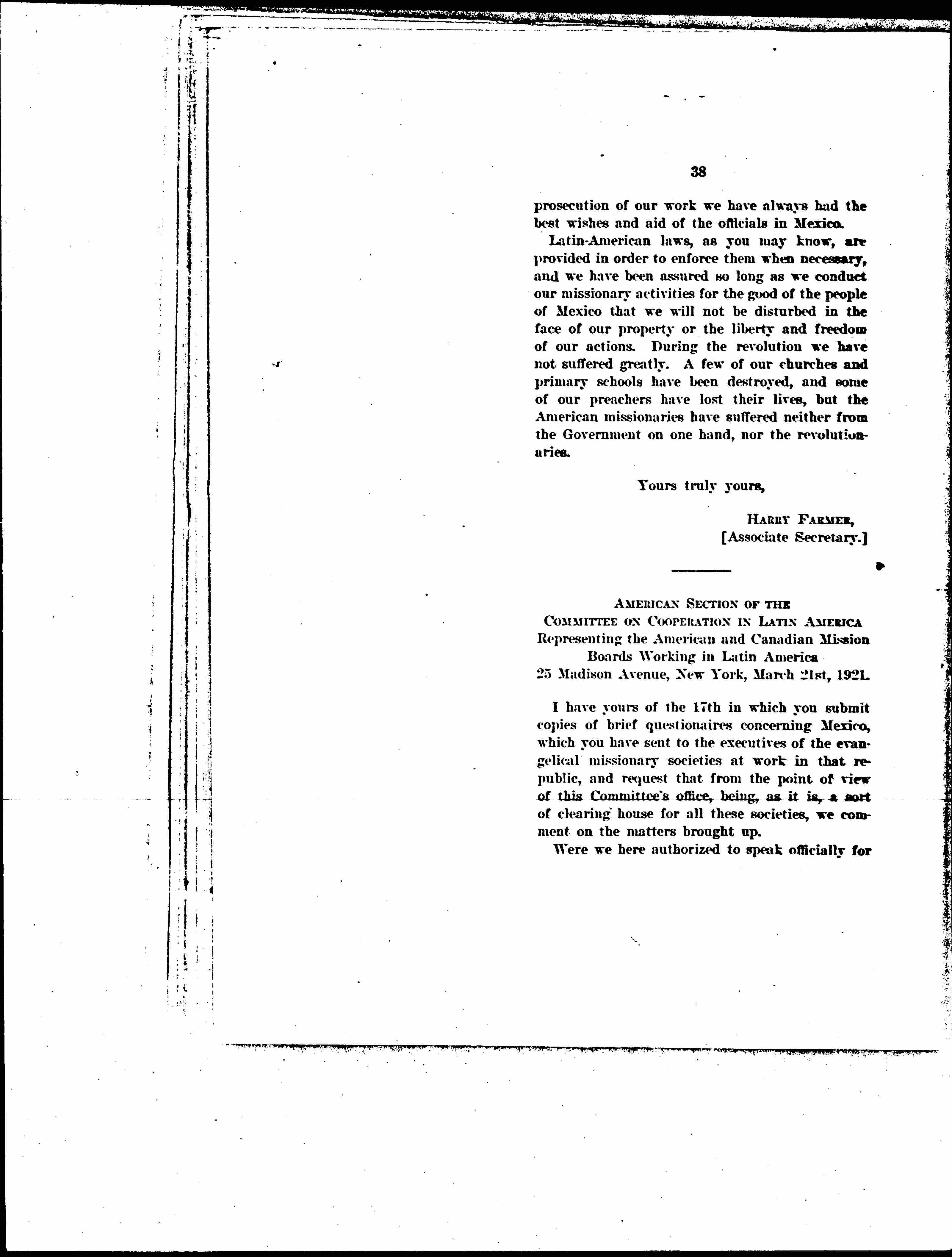 I will say that for most of the time since 1919 I have been associated with Mr. Hadley in the administration of our mission work in Mexico, have twice visited Mexico and have spent nearly twenty years in Spanish countries.