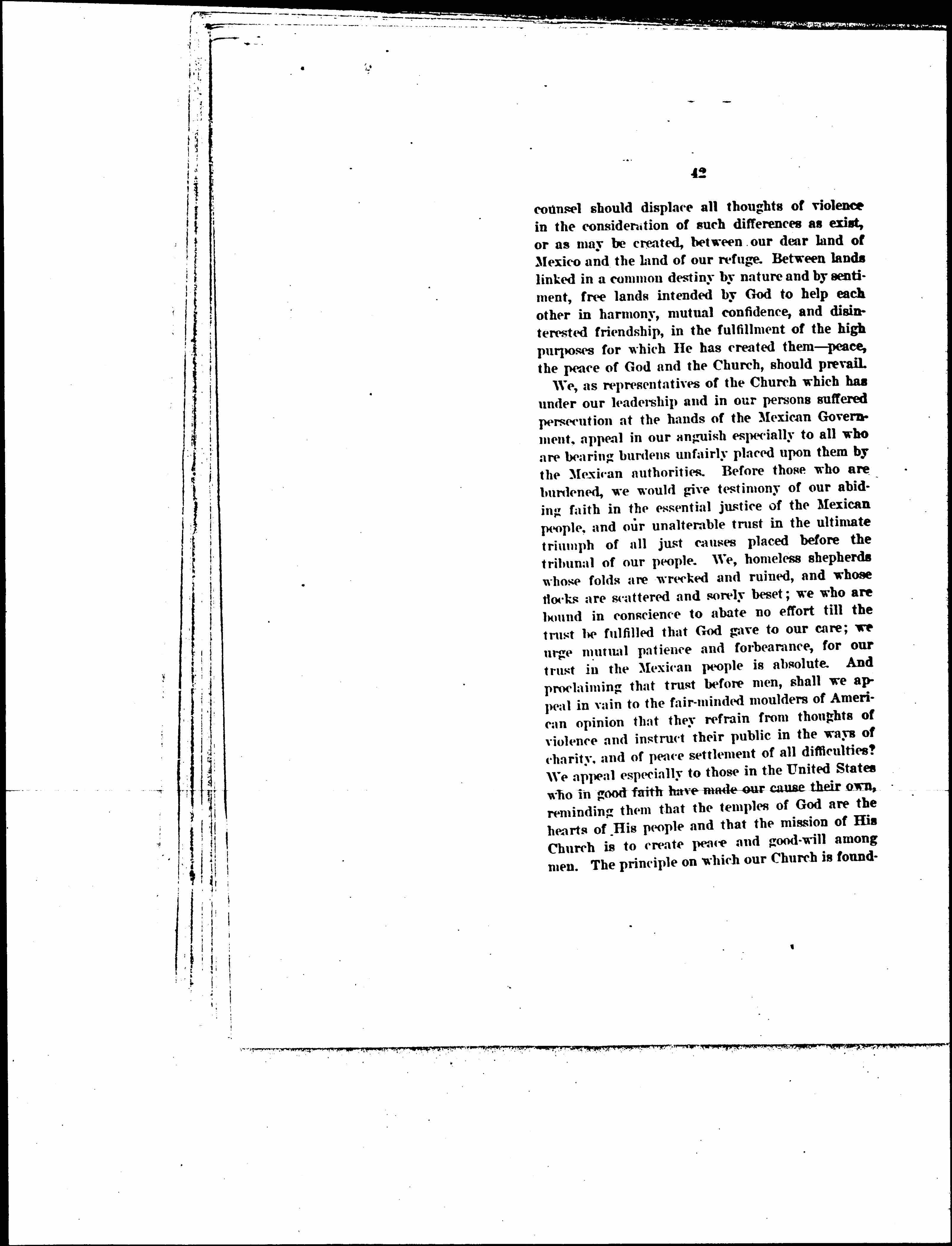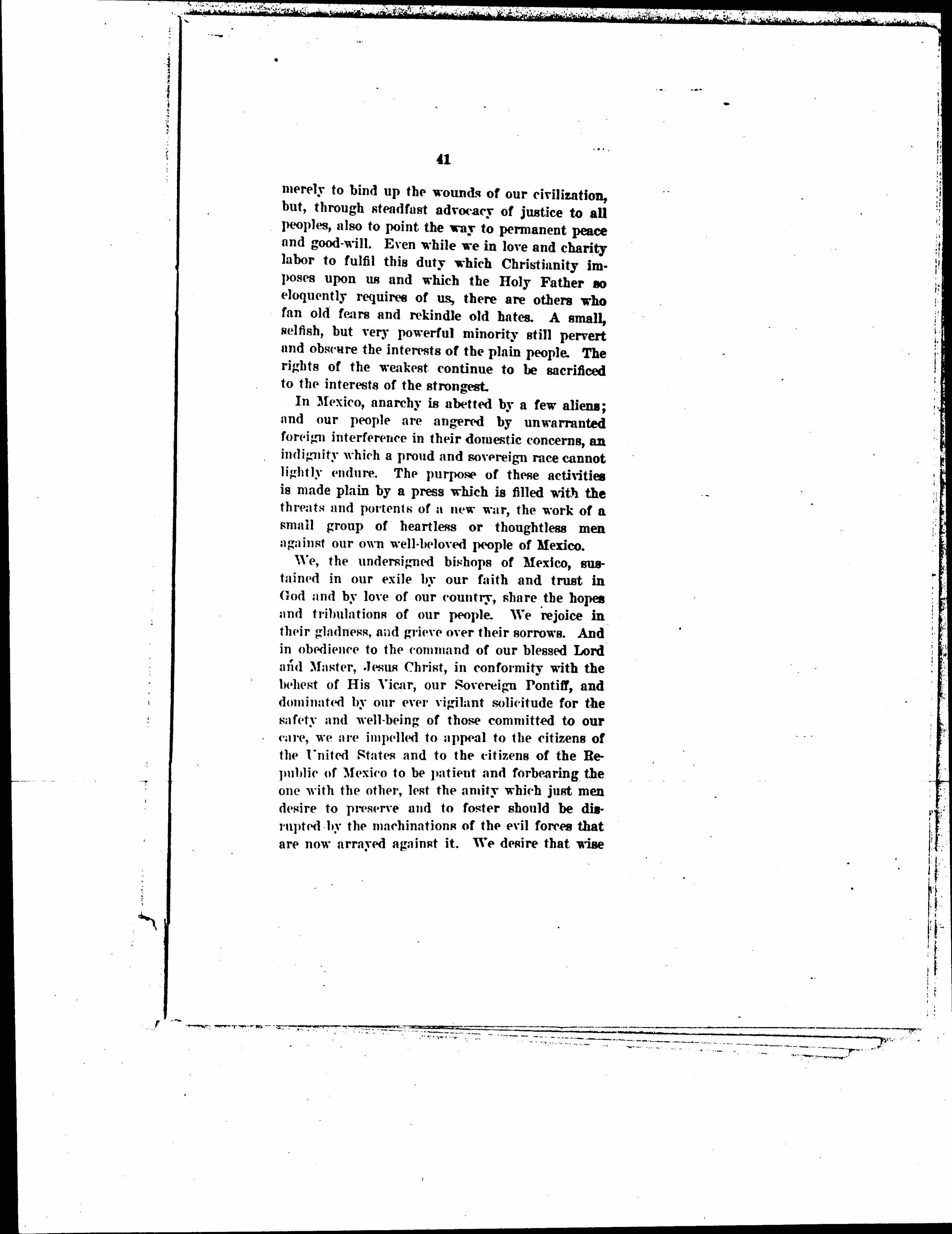 We, as representatives of the Church which has under our leadership and in our persons suffered persecution at the hands of the Mexican Government, appeal in our anguish especially to all who are bearing burdens unfairly placed upon them by the Mexican authorities. Before those who are burdened, we would give testimony of our abiding faith in the essential justice of the Mexican people, and our unalterable trust in the ultimate triumph of all just causes placed before the tribunal of our people. We, homeless shepherds whose folds are wrecked and ruined, and whose flocks are scattered and sorely beset; we who are bound in conscience to abate no effort till the trust be fulfilled that God gave to our care; we urge mutual patience and forbearance, for our trust in the Mexican people is absolute. And proclaiming that trust before men, shall we appeal in vain to the fair-minded [molders] of American opinion that they refrain from thoughts of violence and instruct their public in the ways of charity, and of peace settlement of all difficulties? We appeal especially to those in the United States who in good faith have made our cause their own, reminding them that the temples of God are the hearts of His people and that the mission of His Church is to create peace and good-will among men. The principle on which our Church is founded [page 44] will [ensure] a peace of justice, for the capacity of the Mexican people to respond to the mission of the Church is limited only by the artificial and temporary barriers which restrict our functions. Finally we appeal to the faithful in the United States and in Mexico to join us in our prayers that God may be blessed speedily to remove all occasions of misunderstanding between these two sovereign states so that the American and the Mexican peoples, each preserving its own sovereignty, may dwell together in perfect peace now and forever.