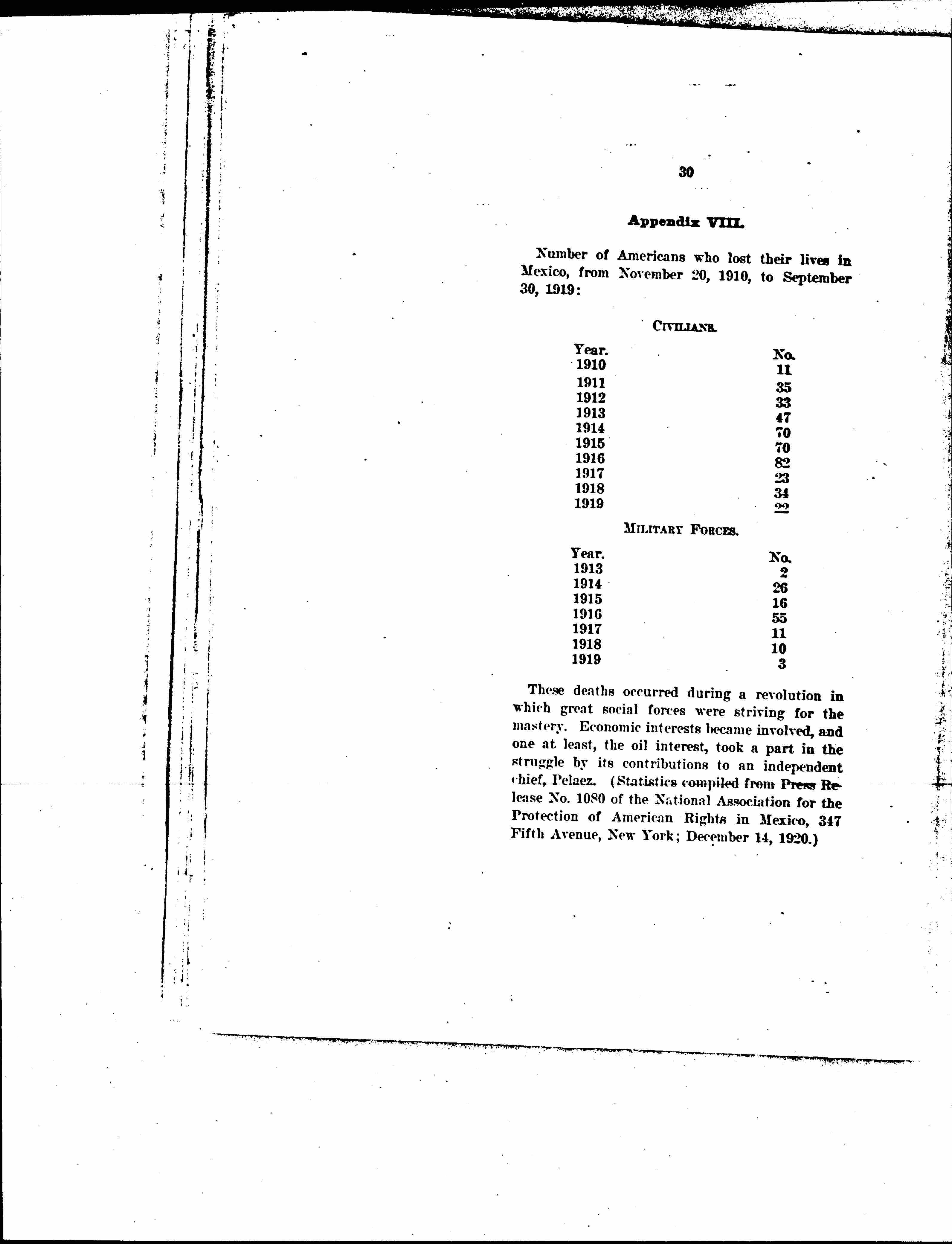 Those deaths occurred during a revolution in which great social forces were striving for the mastery. Economic interests became involved, and one at least, the oil interest, took a part in the struggle by its contributions to an independent chief, Pelaez. (Statistics compiled from Press Release No. 1080 of the National Association for the Protection of American Rights in Mexico, 347 Fifth Avenue, New York; December 14, 1920.) [page 32]