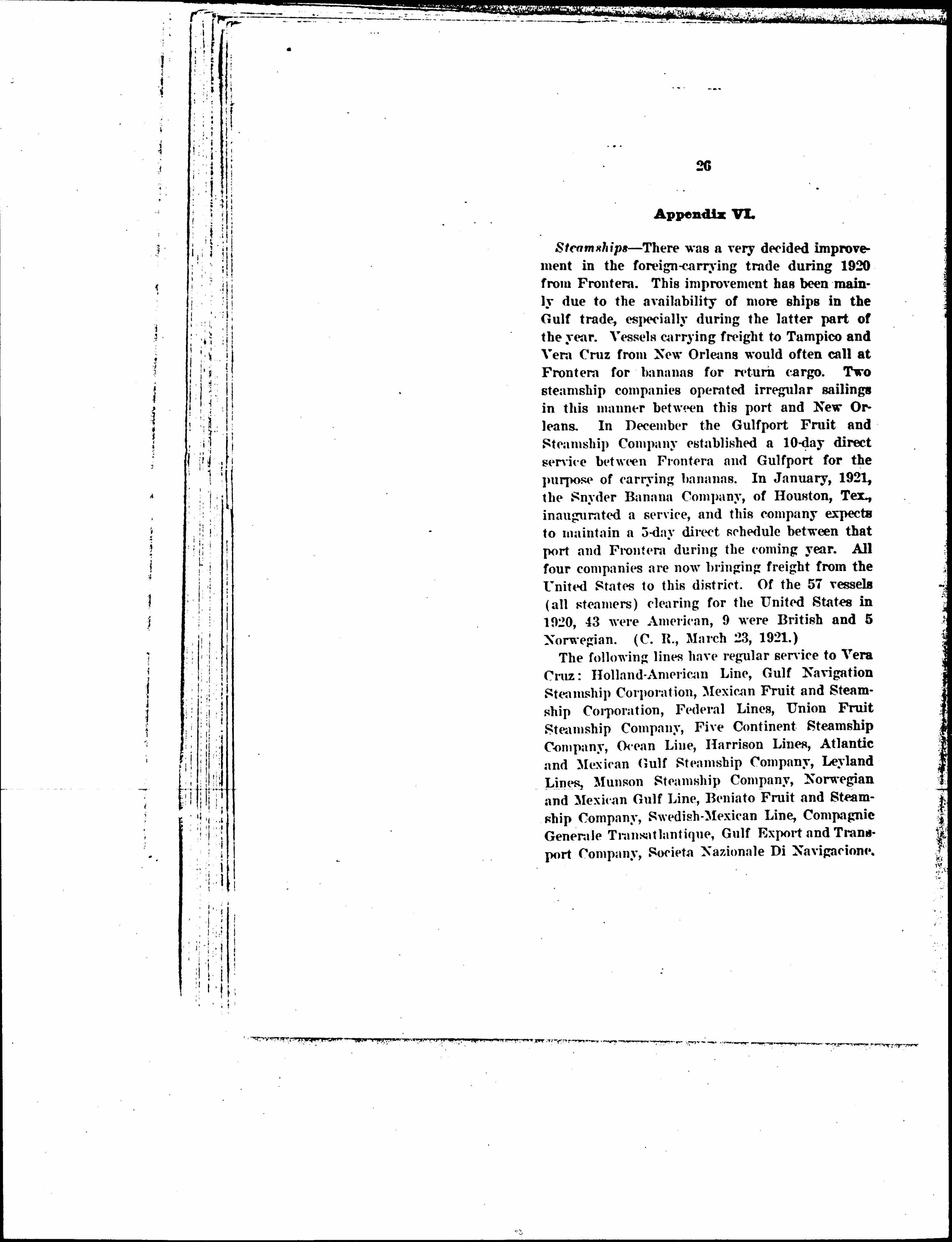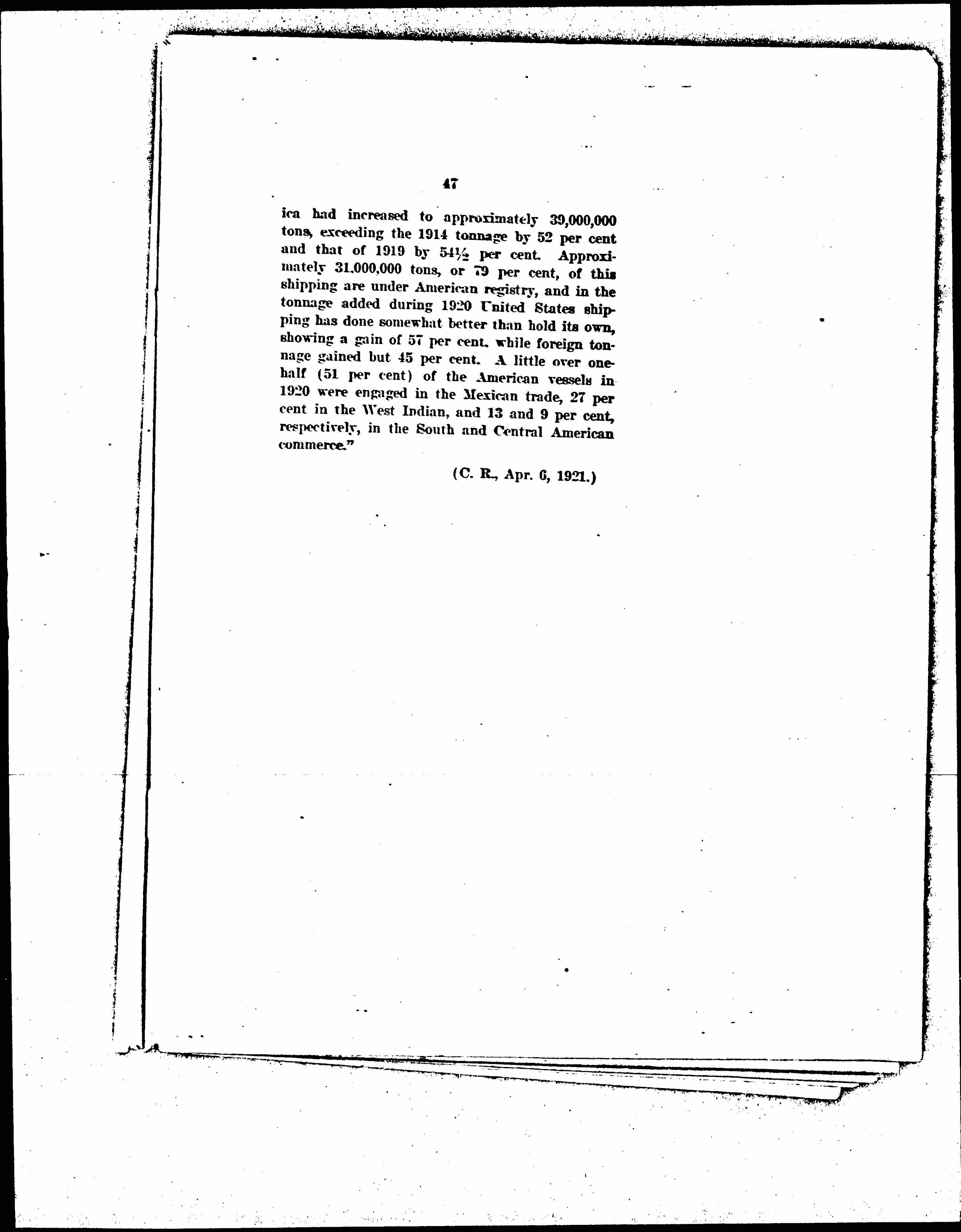 "By the end of 1920 the total shipping in the trade between the United States and Latin-America [page 48] had increased to approximately 39,000,000 tons, exceeding the 1914 tonnage by 52 [percent] and that of 1919 by 54½ [percent]. Approximately 31,000,000 tons, or 79 [percent] of this shipping are under American registry, and in the tonnage added during 1920 United States shipping has done somewhat better than hold its own, showing a gain of 57 [percent], while foreign tonnage gained but 45 [percent]. A little over one-half (51 [percent]) of the American vessels in 1920 were engaged in the Mexican trade, 27 [percent] in the West Indian, and 13 and 9 [percent], respectively, in the South and Central American commerce."