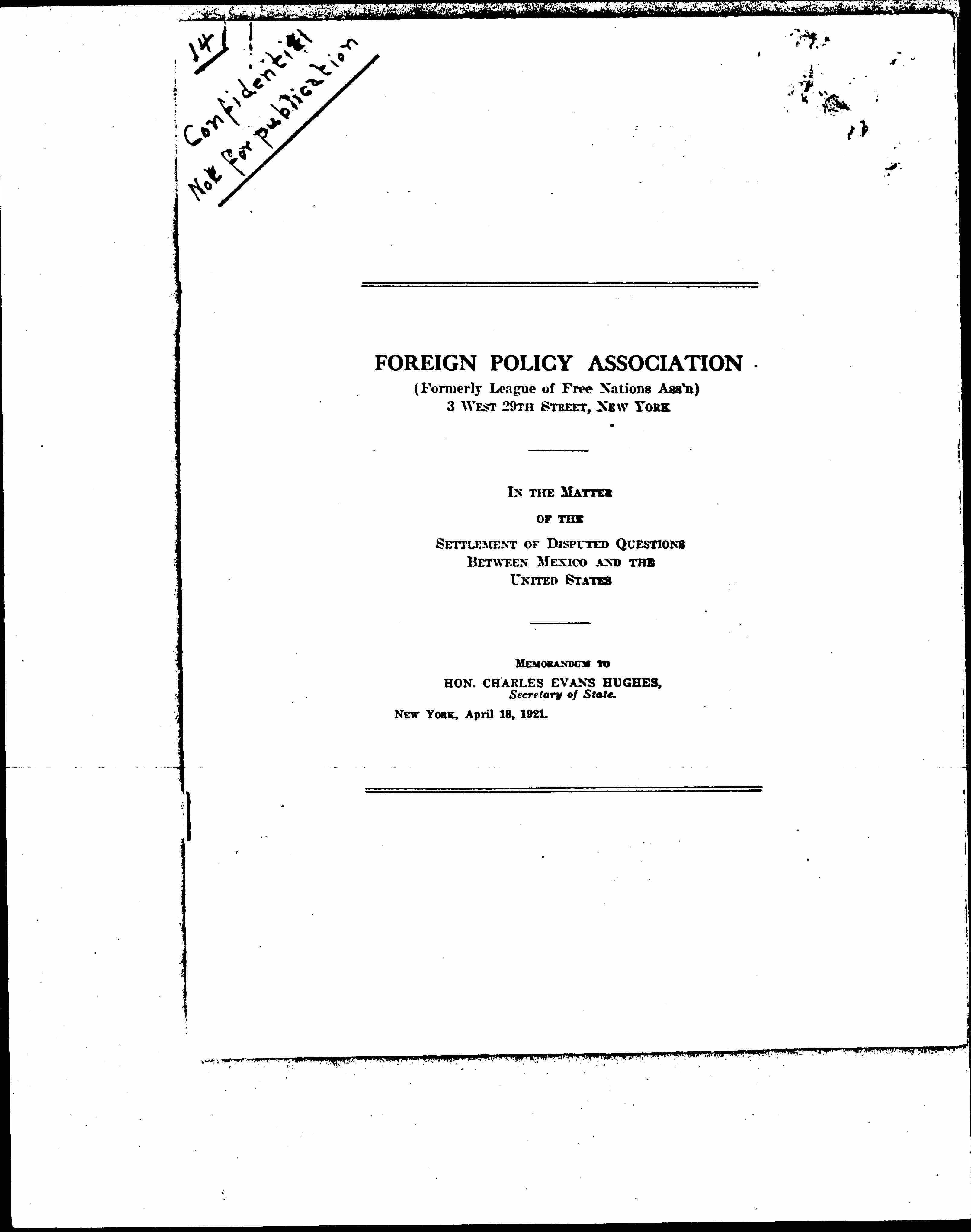 BRIEF SUBMITTED RE MEXICO BY FOREIGN POLICY ASSOCIATION {FORMERLY THE LEAGUE OF FREE NATIONS' ASSOCIATION}.