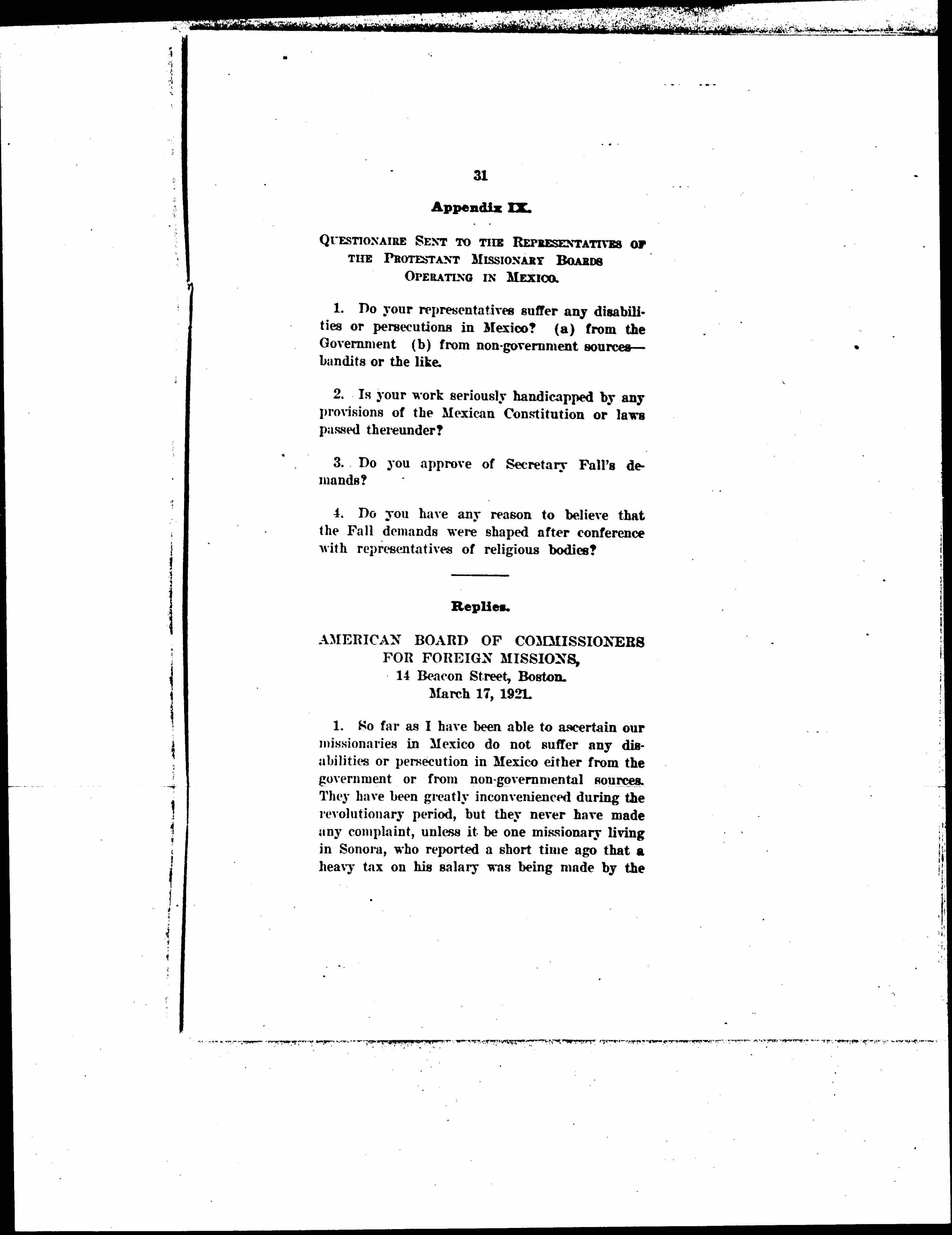 [QUESTIONNAIRE] SENT TO THE REPRESENTATIVES OF THE PROTESTANT MISSIONARY BOARDS OPERATING IN MEXICO.