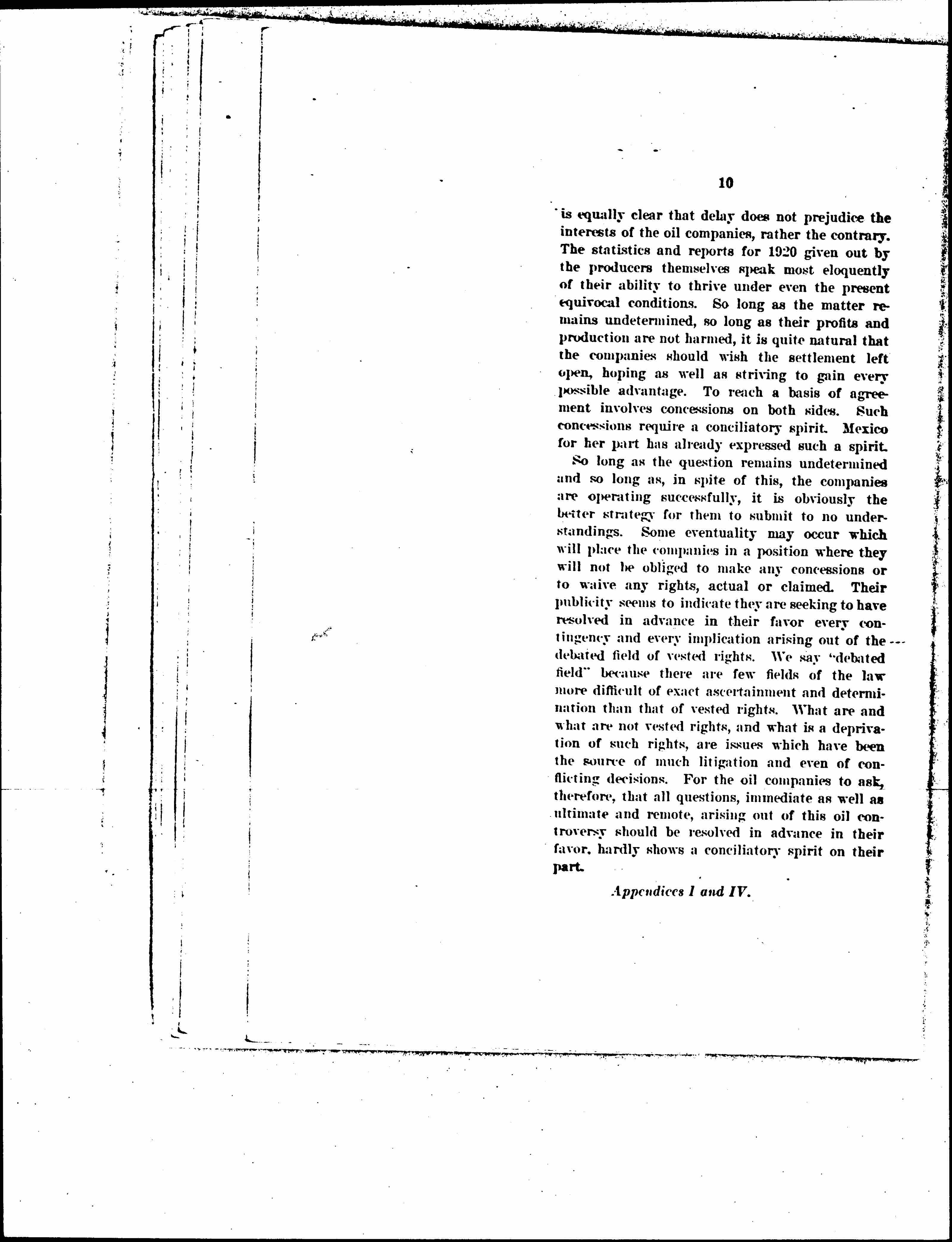 It is not our purpose to engage in, nor would the length or character of this brief admit, an extensive discussion of the "oil question." From such information as we possess, we believe that the Mexican Government desires to arrive at a settlement of this disturbing matter. It is obvious that a settlement ought to be arrived at. It [page 11] is equally clear that delay does not prejudice the interests of the oil companies, rather the contrary. The statistics and reports for 1920 given out by the producers themselves speak most eloquently of their ability to thrive under even the present equivocal conditions. So long as the matter remains undetermined, so long as their profits and production are not harmed, it is quite natural that the companies should wish the settlement left open, hoping as well as striving to gain every possible advantage. To reach a basis of agreement involves concessions on both sides. Such concessions require a conciliatory spirit. Mexico for her part has already expressed such a spirit.