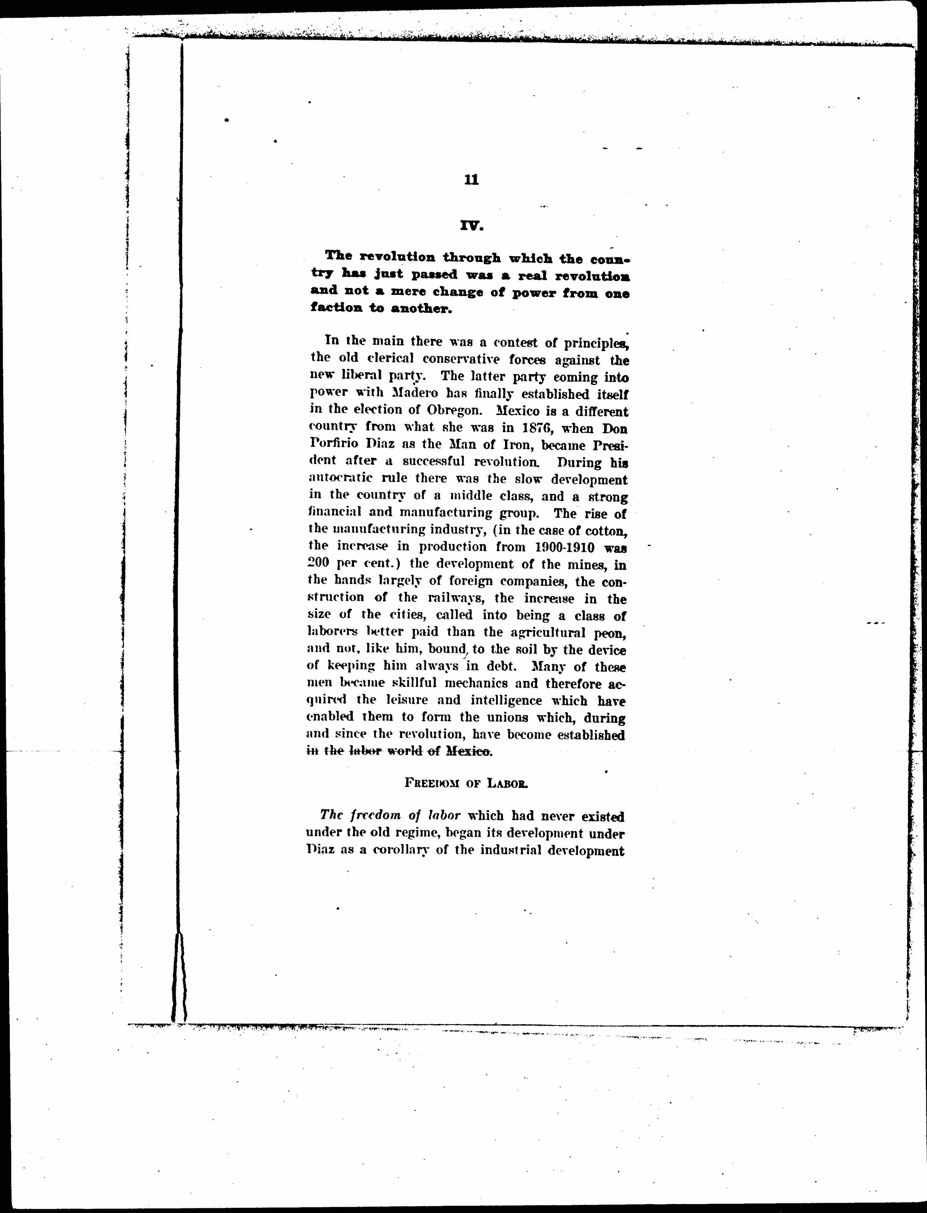 In the main there was a contest of principles, the old clerical conservative forces against the new liberal party. The latter party coming into power with Madero has finally established itself in the election of Obregón. Mexico is a different country from what she was in 1876, when Don Porfirio Díaz as the Man of Iron, became President after a successful revolution. During his autocratic rule there was the slow development in the country of a middle class, and a strong financial and manufacturing group. The rise of the manufacturing industry, (in the case of cotton, the increase in production from 1900-1910 was 200 [percent]) the development of the mines, in the hands largely of foreign companies, the construction of the railways, the increase in the size of the cities, called into being a class of laborers better paid than the agricultural peon, and not, like him, bound to the soil by the device of keeping him always in debt. Many of these men became skillful mechanics and therefore acquired the leisure and intelligence which have enabled them to form the unions which, during and since the revolution, have become established in the labor world of Mexico.