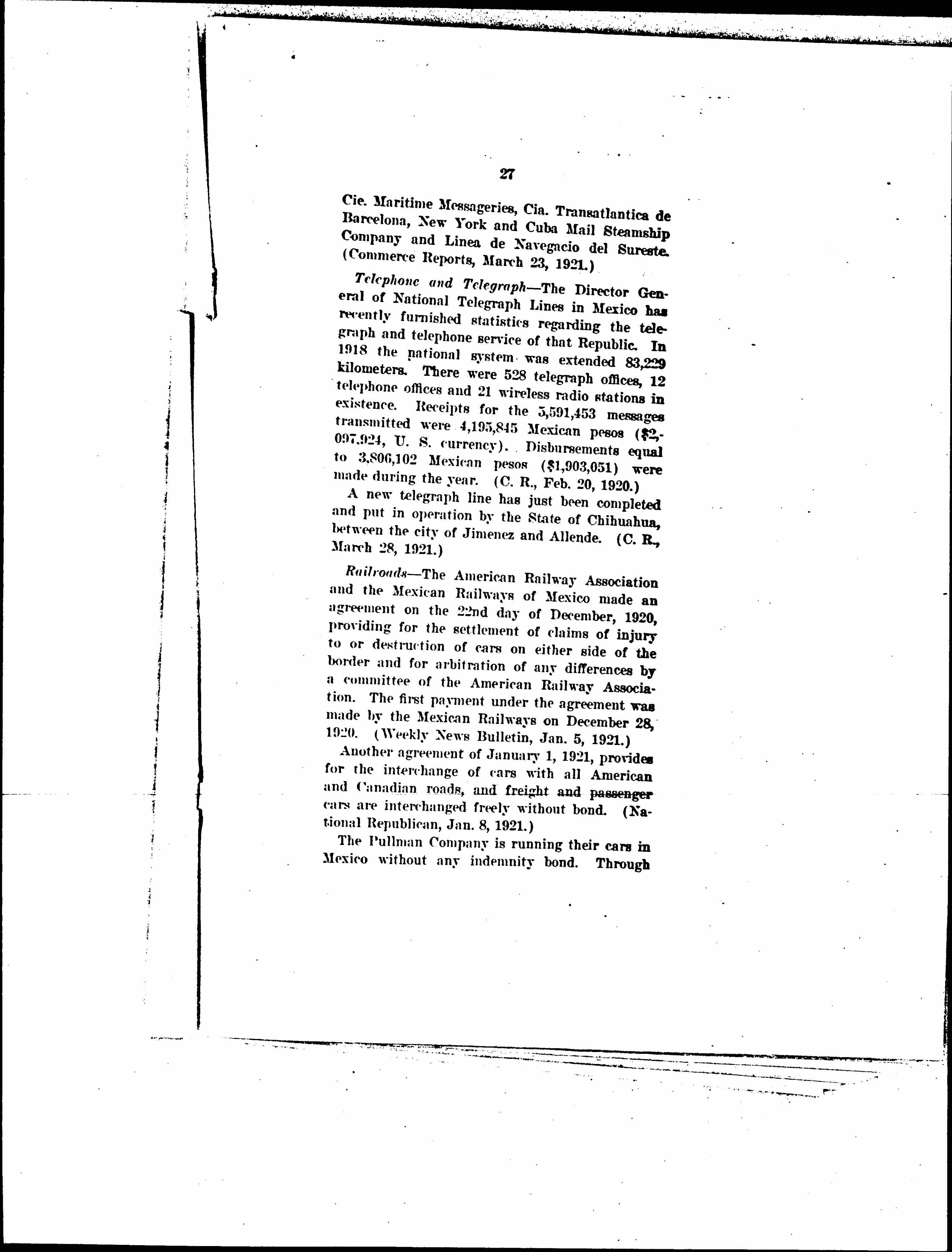 6. The land transportation system of the country is carrying goods to its capacity, and the sea transportation is increasing, evidencing the amount of business being done in the country and the increasing demand for facilities. Evidence of the security of the country is shown in connection with transportation by the fact that guard trains are not operated at all, and only in a few outlying mountainous districts of the Republic are military escorts carried. American railway freight cars are now allowed to go to Mexico with freight in transit. Cars operated by the Pullman Company have been running in [page 6] the country for some time, on both Mexican and international routes.